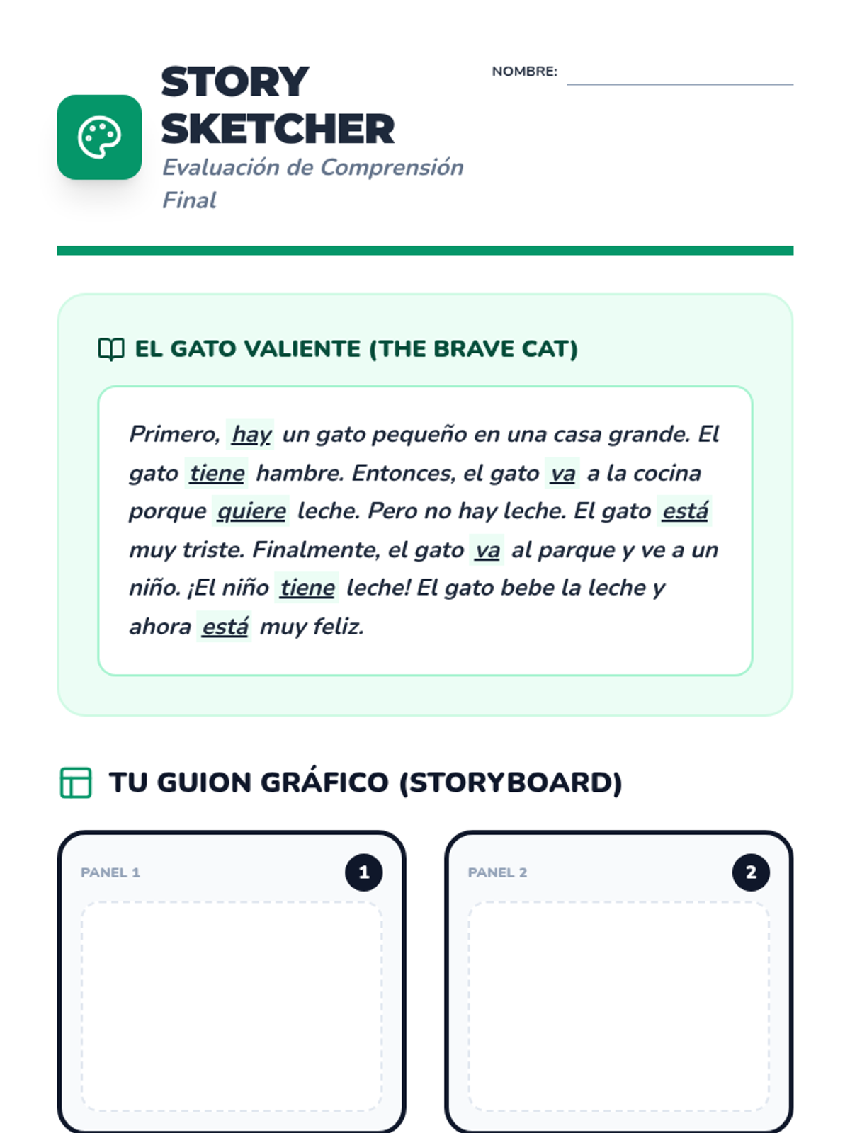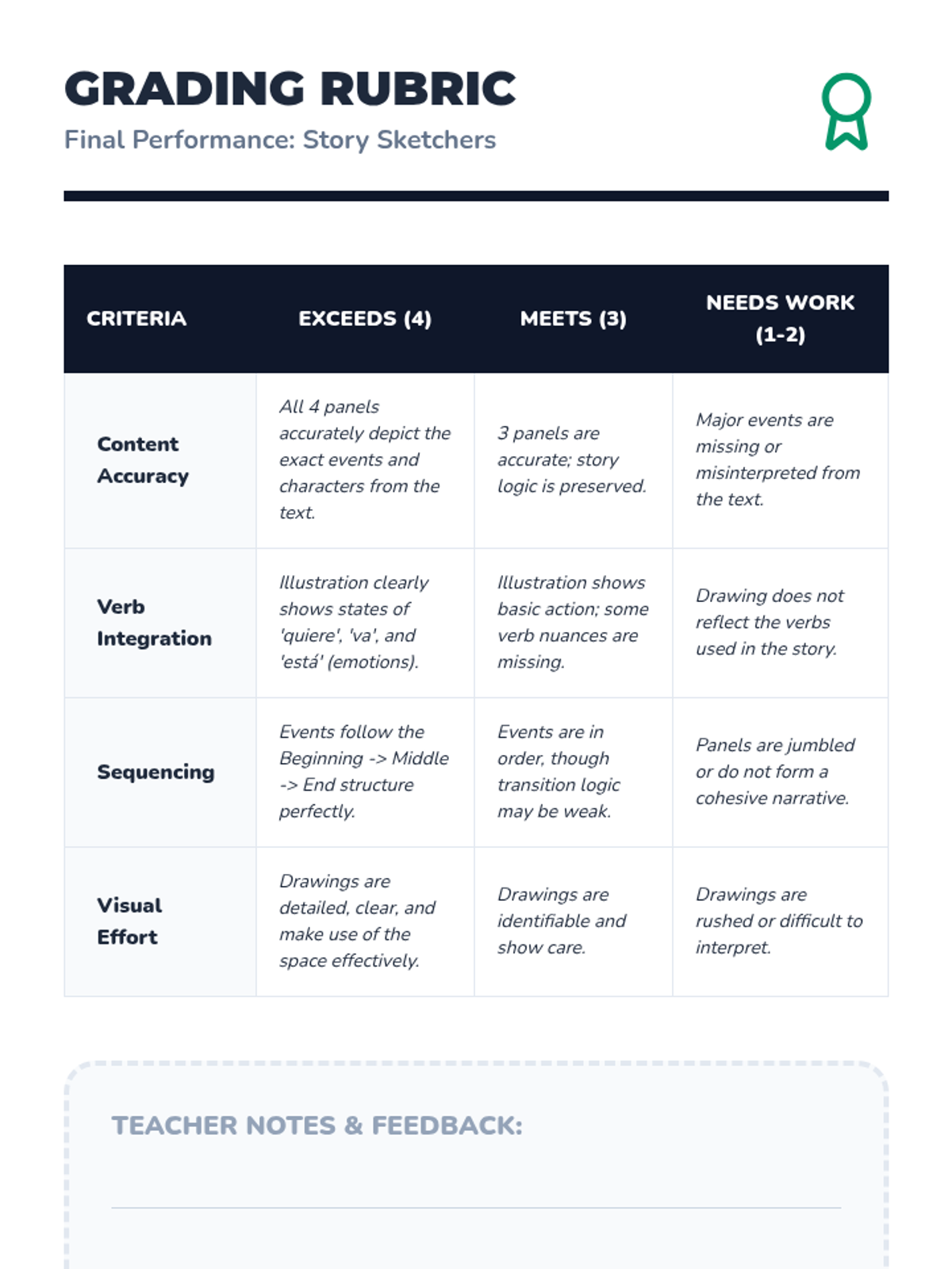 In this final assessment, students synthesize their knowledge of the 'Super 7' verbs by reading a complete narrative and creating a four-panel storyboard to illustrate the events described.