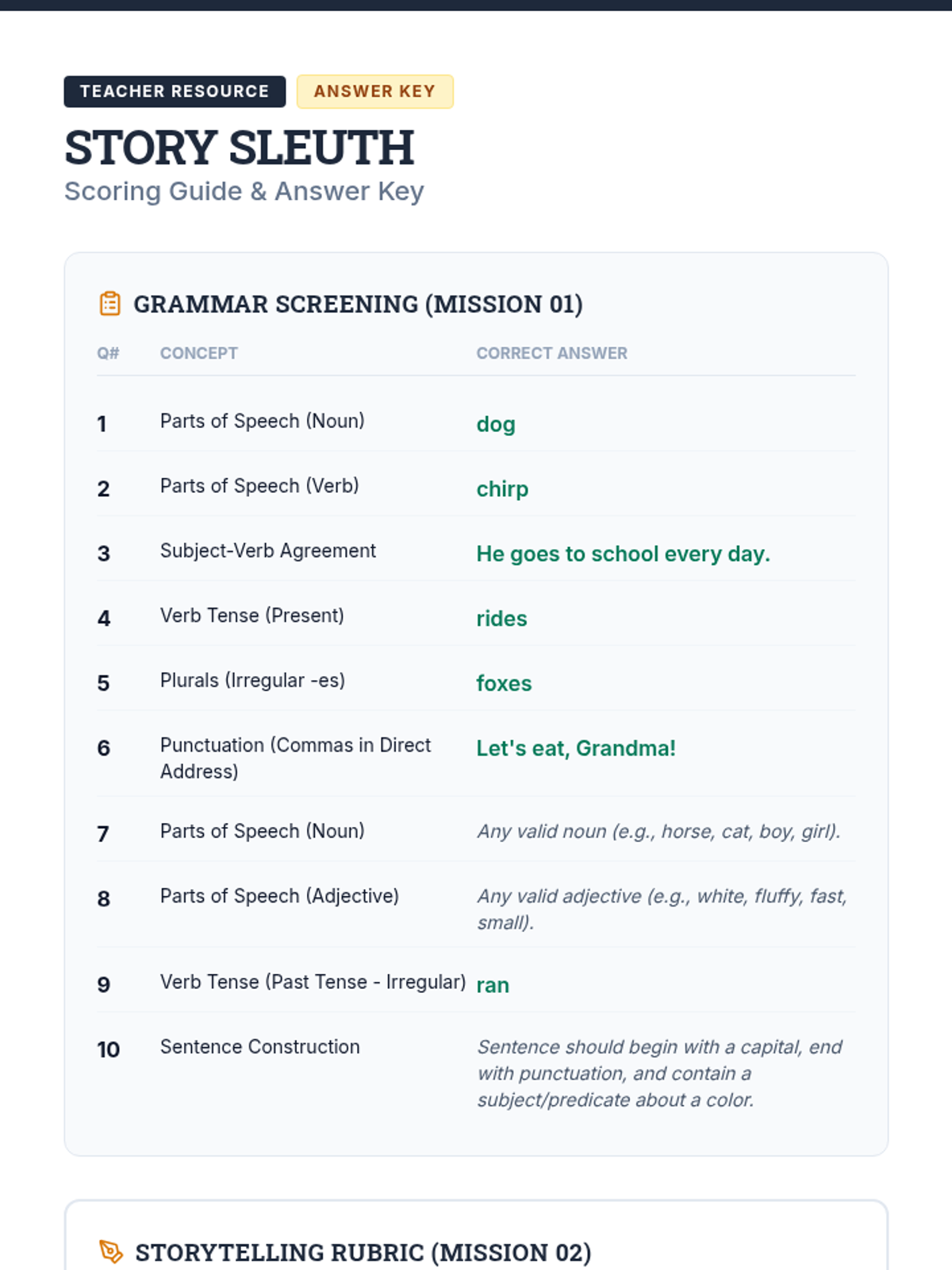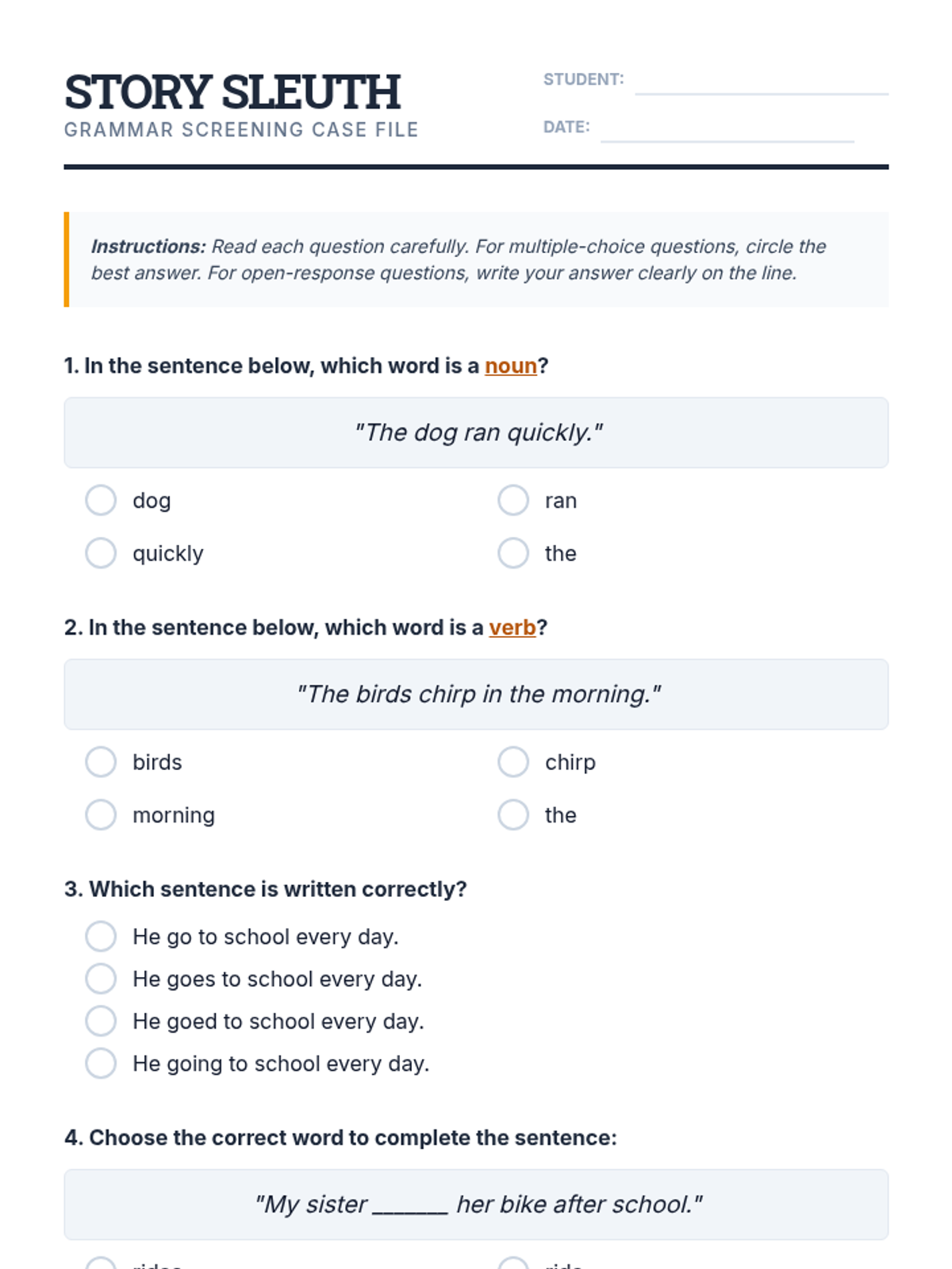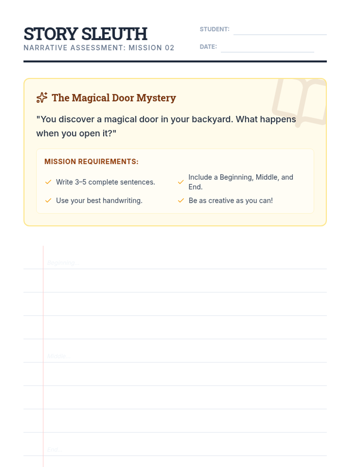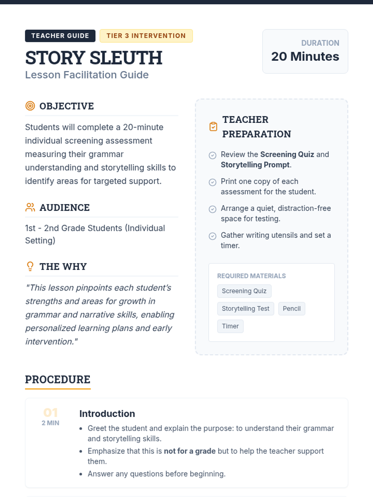 A 20-minute individual screening assessment designed for second graders to identify strengths and growth areas in grammar and narrative skills. This Tier 3 intervention lesson provides a quiet, structured environment for students to demonstrate their storytelling abilities and linguistic understanding.