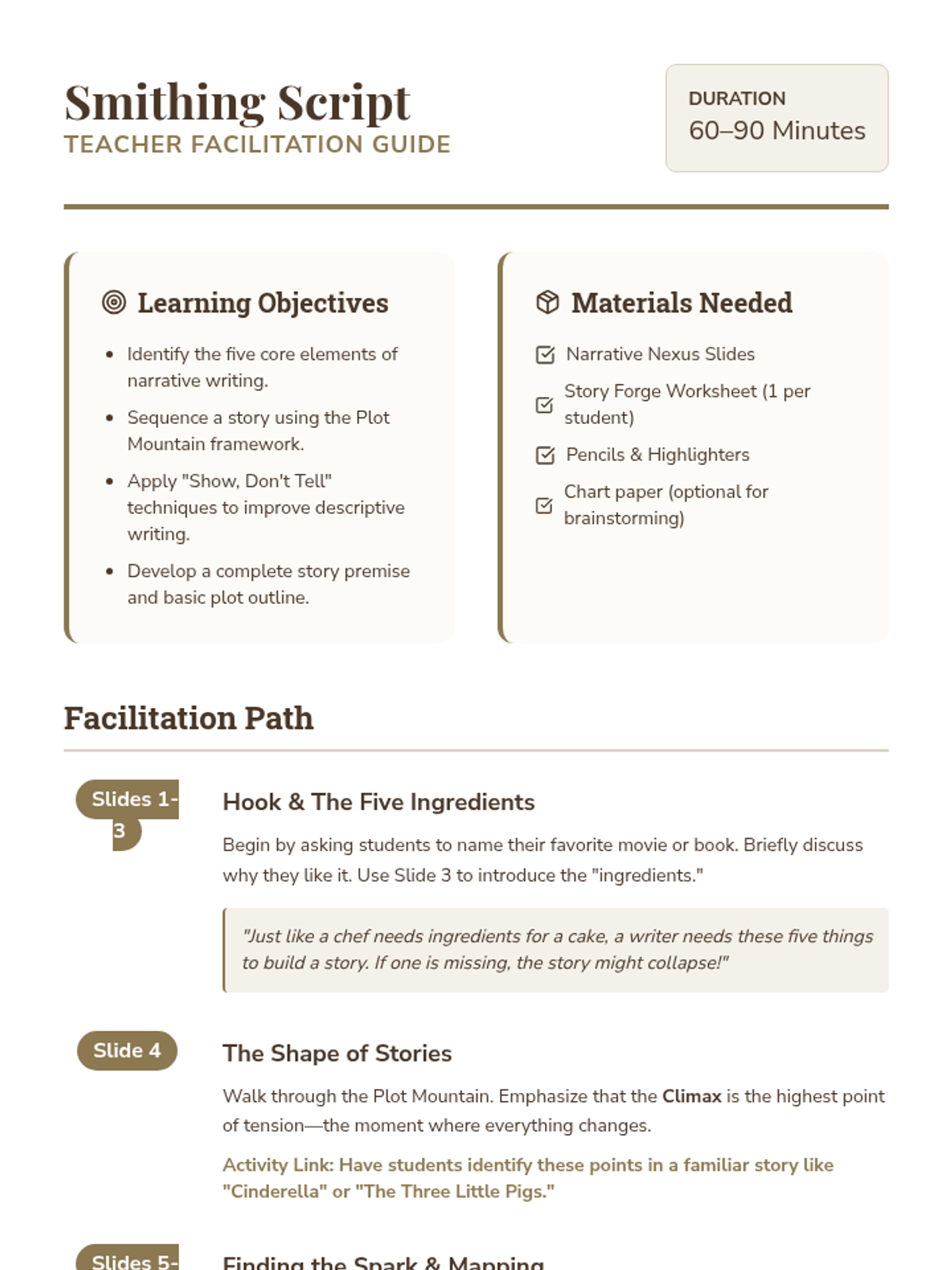 A 3-day intensive study of an original folktale, 'The Weaver of Whispers.' Students analyze character motivations, setting influences, and figurative language before creating their own original myth.