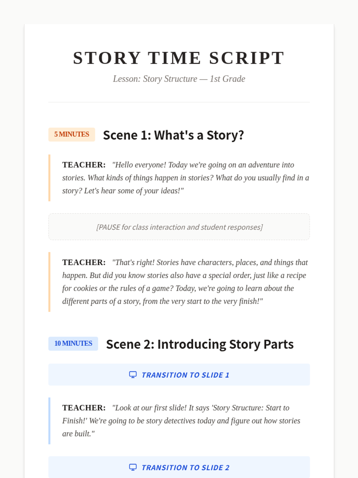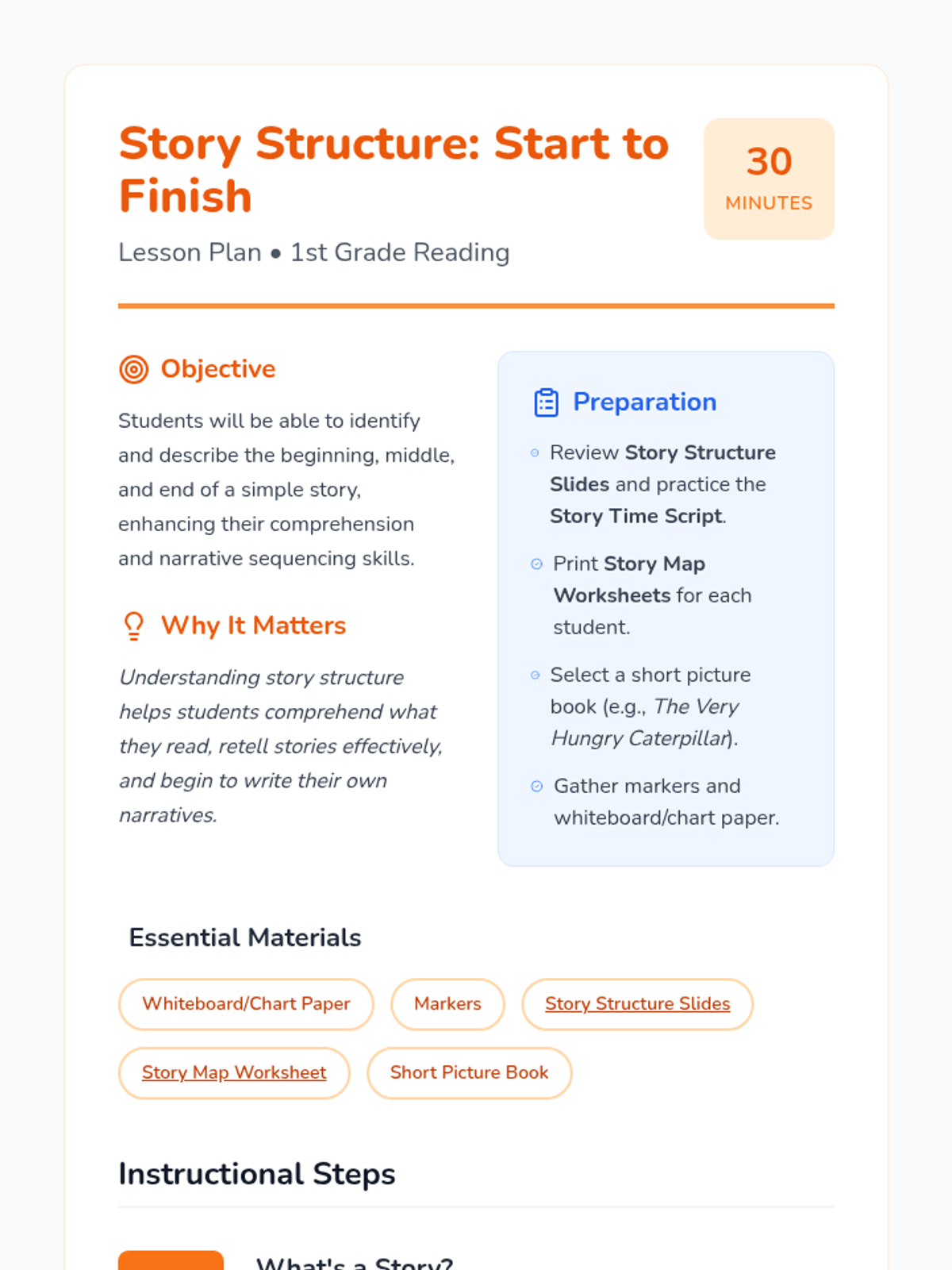 A foundational lesson for 1st graders to learn the three main parts of a story: Beginning, Middle, and End. Through interactive slides, a read-aloud, and a story mapping activity, students will develop narrative sequencing skills.