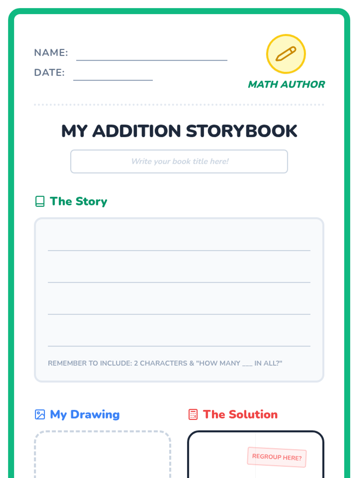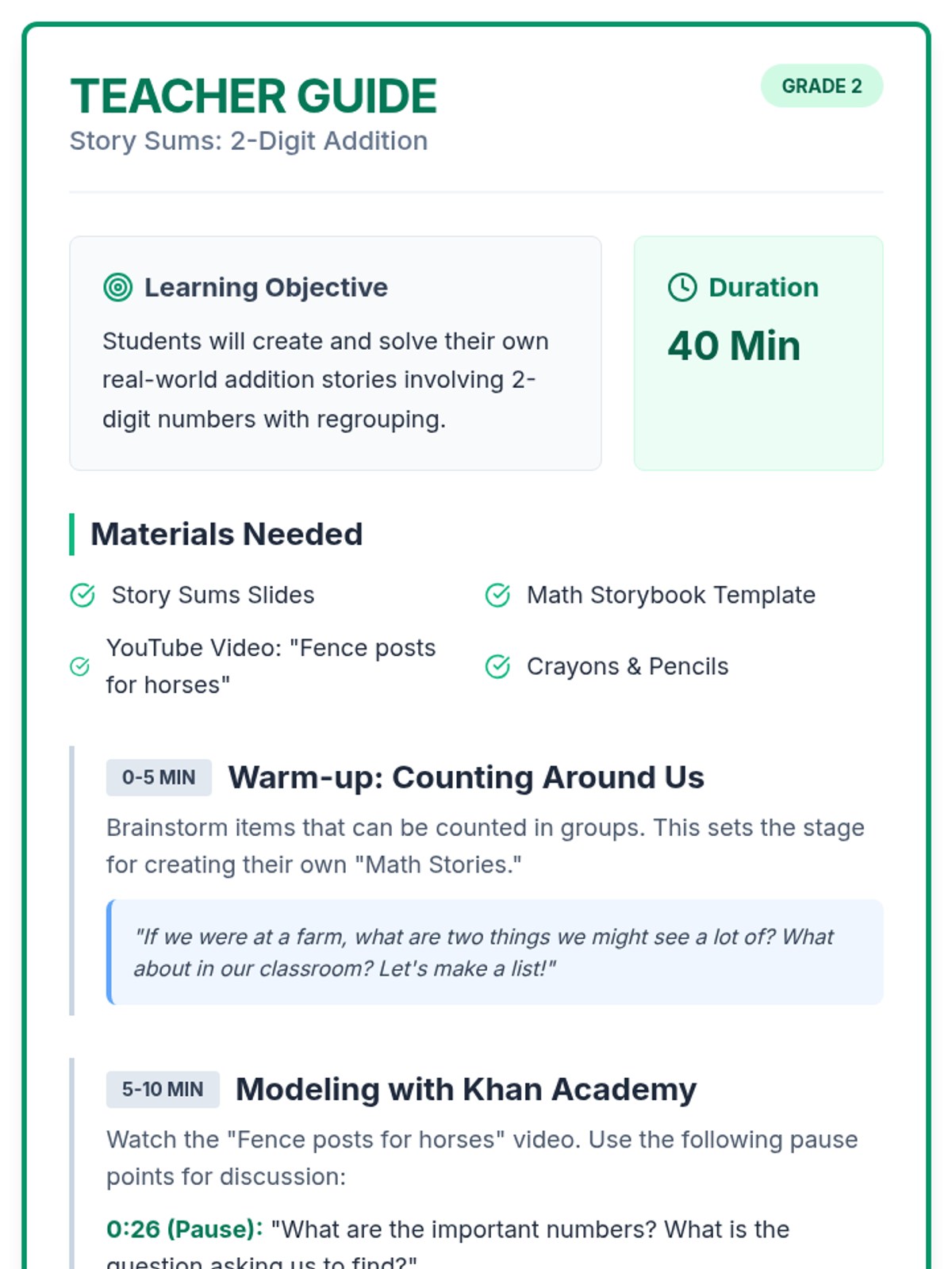 Students learn to create and solve their own 2-digit addition word problems with regrouping, inspired by a Khan Academy storytelling model. The lesson includes a brainstorming warm-up, a guided video analysis, and a creative storybook activity.