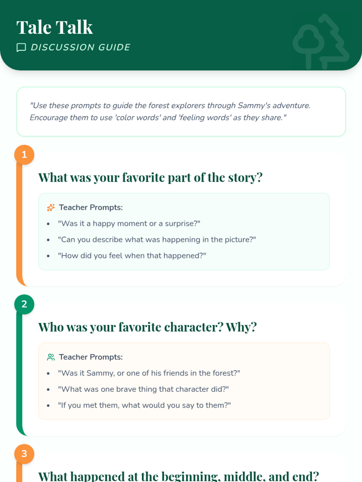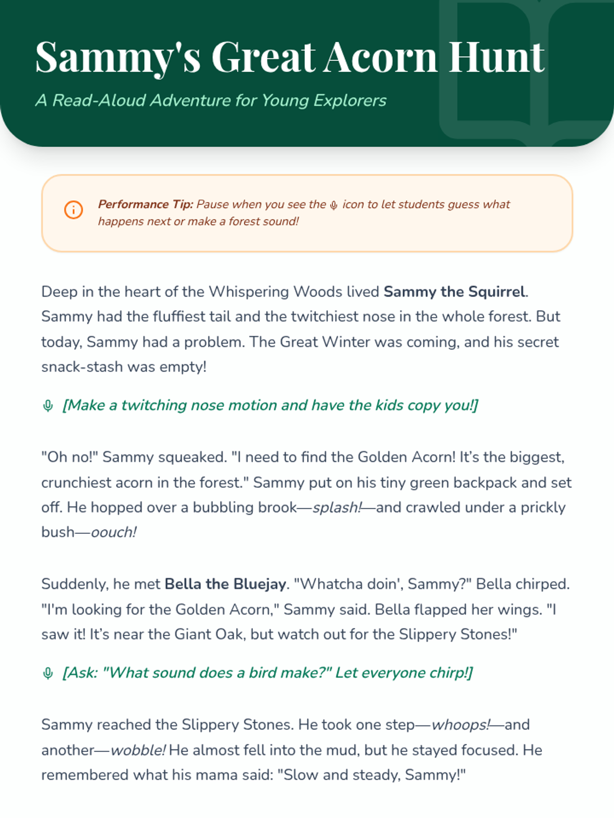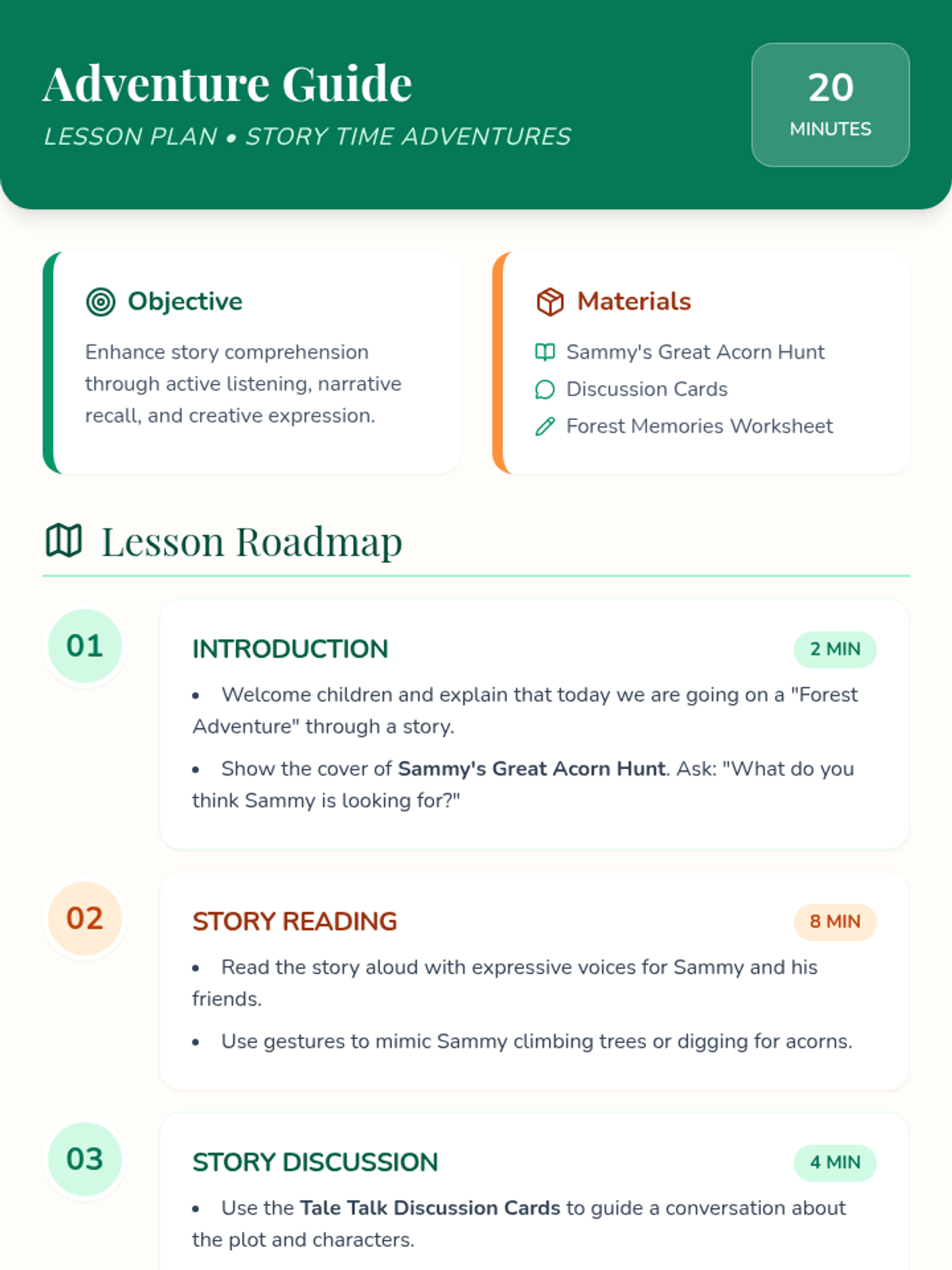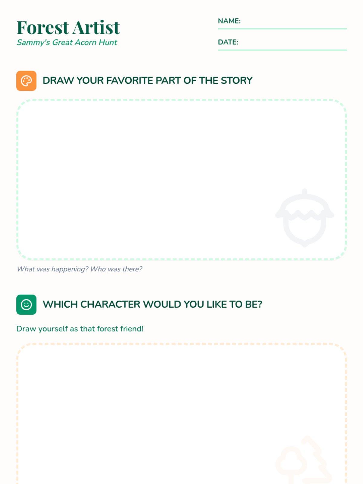 An interactive story session where children listen to 'Sammy’s Great Acorn Hunt', participate in guided discussions, and express their creativity through drawing to develop narrative comprehension and listening skills.