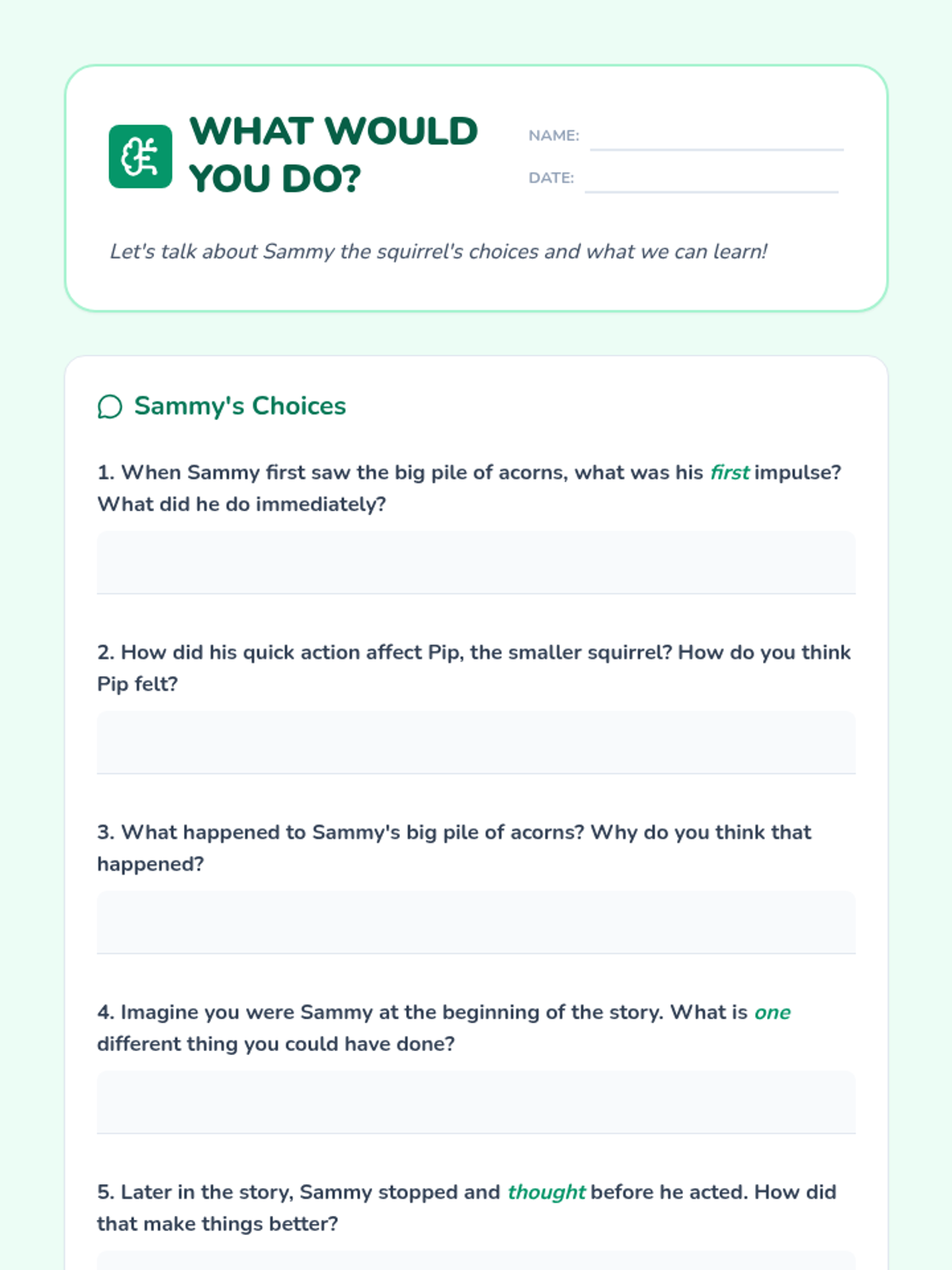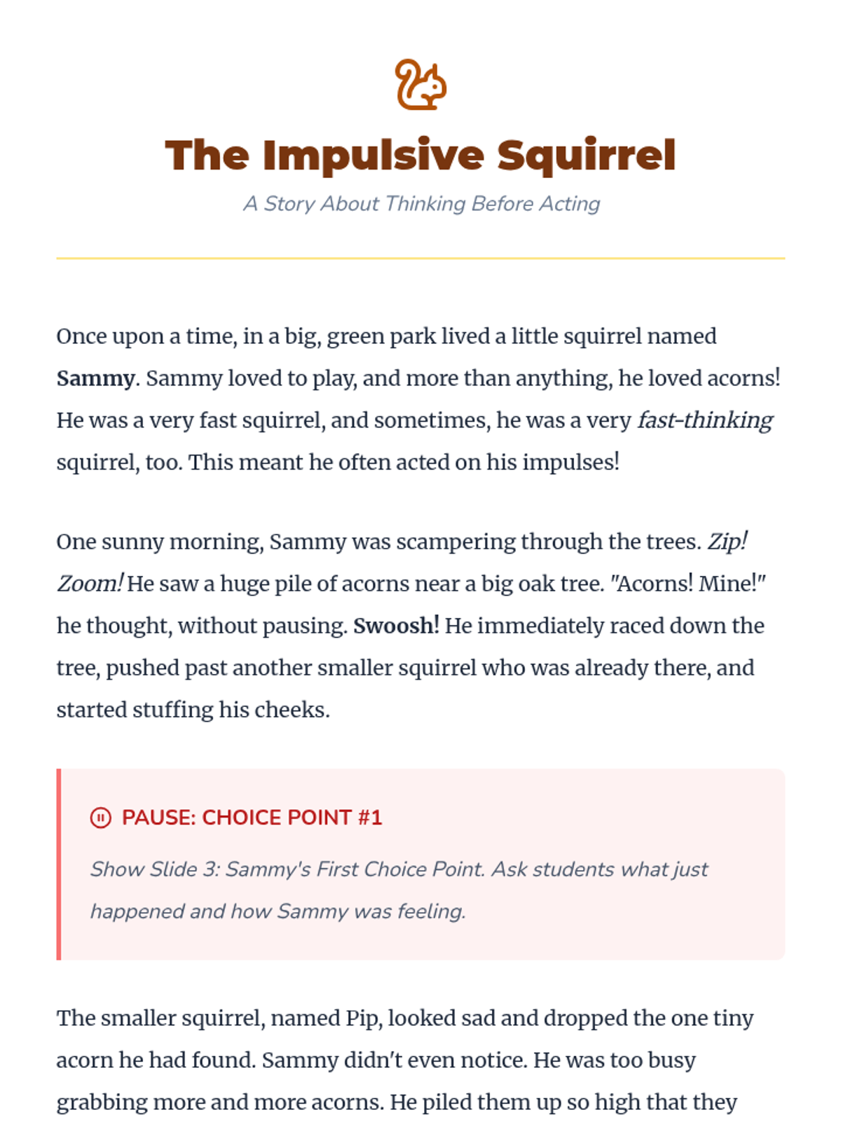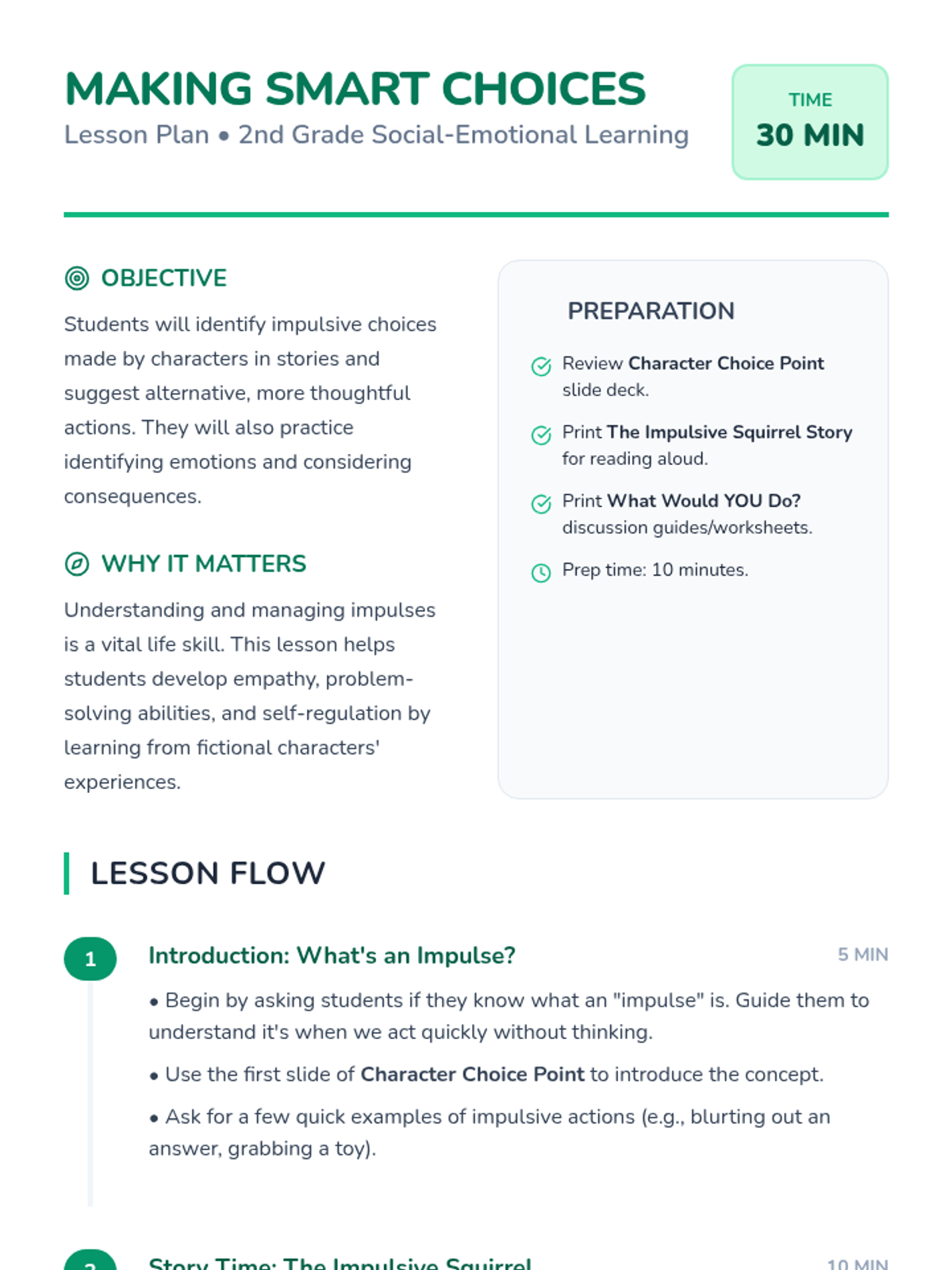 A social-emotional learning lesson for 2nd grade that uses storytelling to teach students how to identify impulsive behaviors and choose thoughtful alternatives.