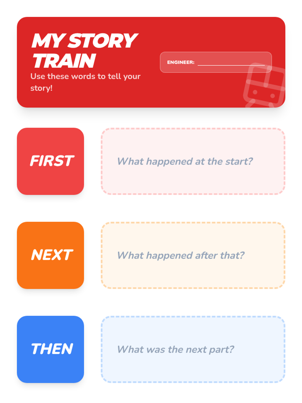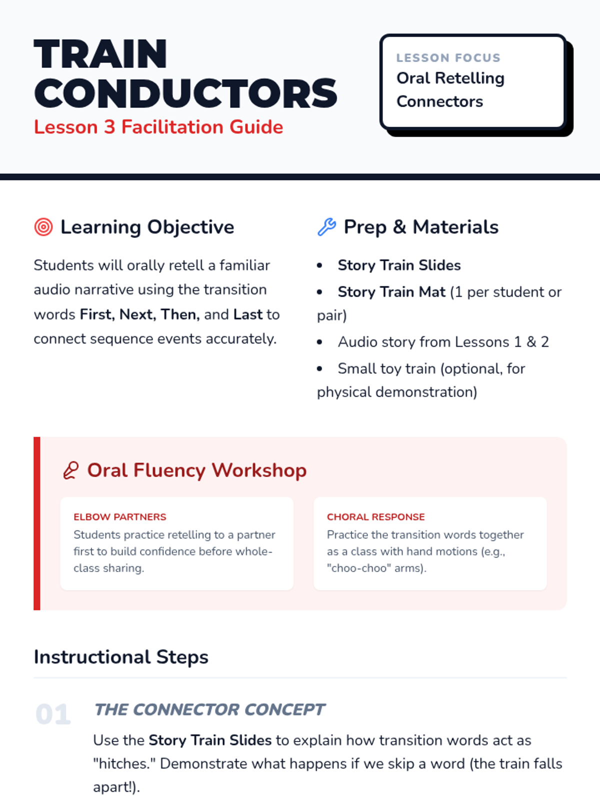 Students learn to use transition words like First, Next, Then, and Last to orally retell a story they have heard.