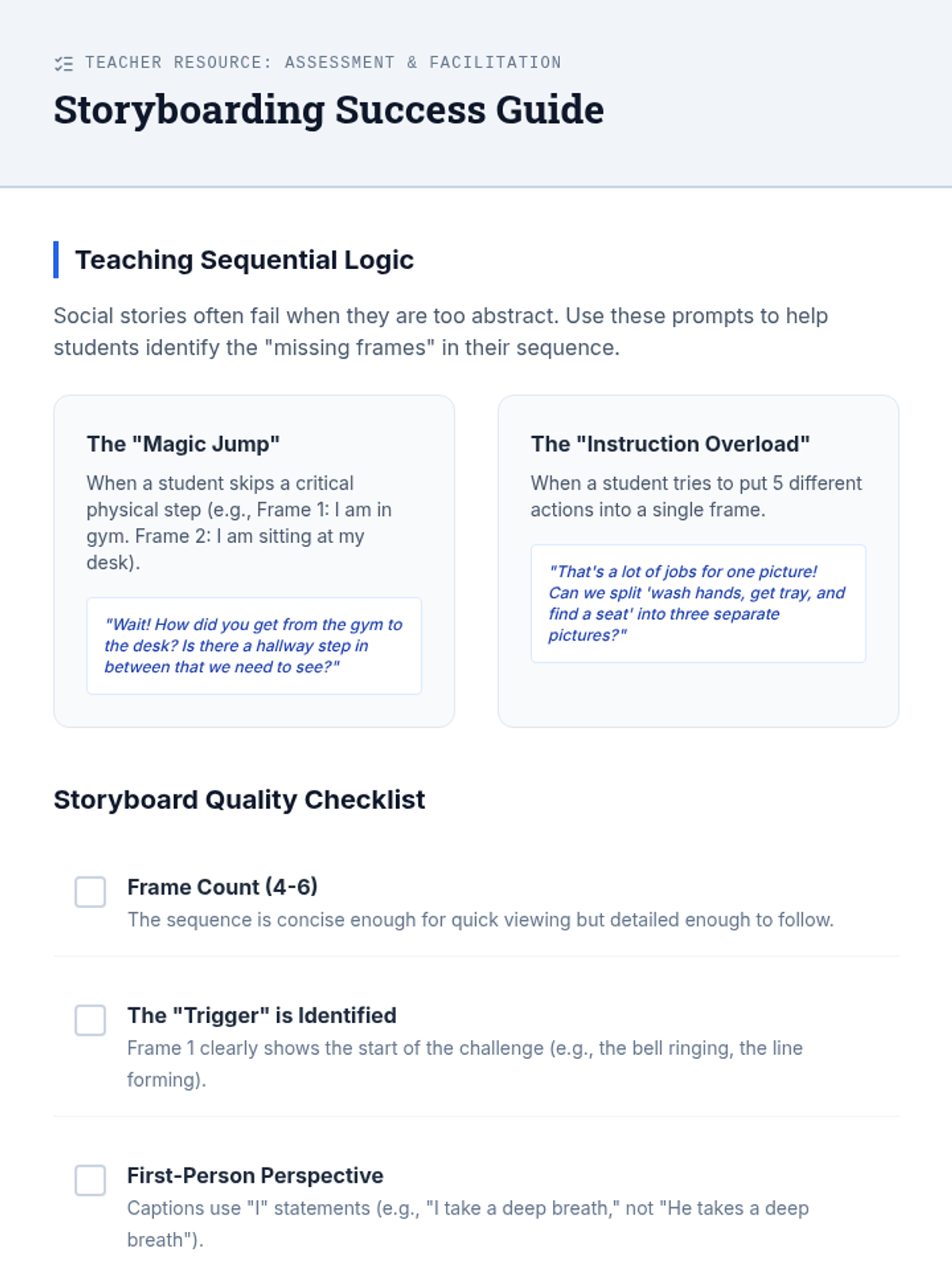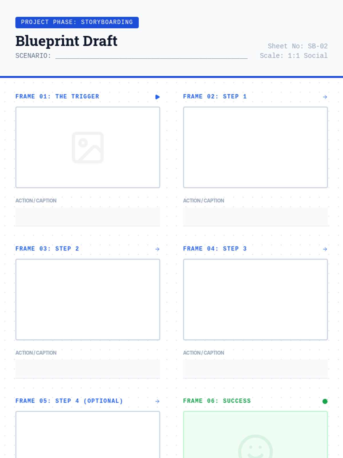 Students plan their visual guide by breaking their chosen scenario into a 4-6 frame logical sequence using a storyboard.