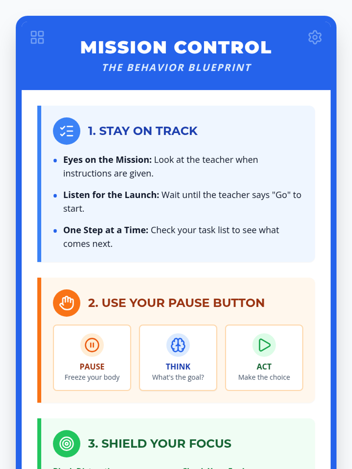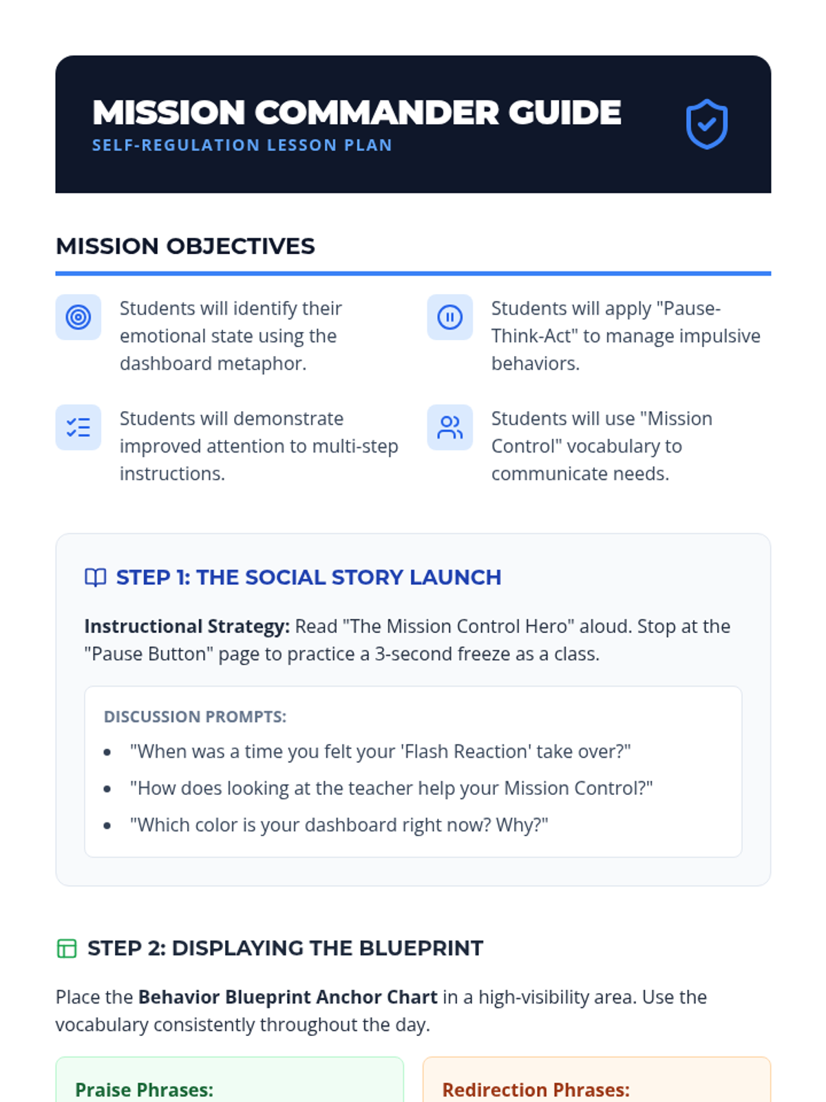 A comprehensive lesson designed to help students master self-regulation skills, specifically focusing on impulse control, waiting, and following multi-step directions through the lens of a 'Mission Control' theme.