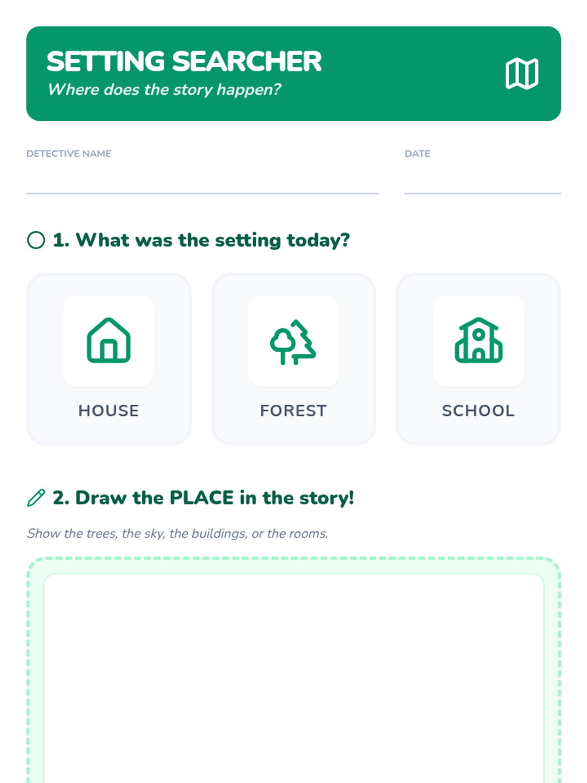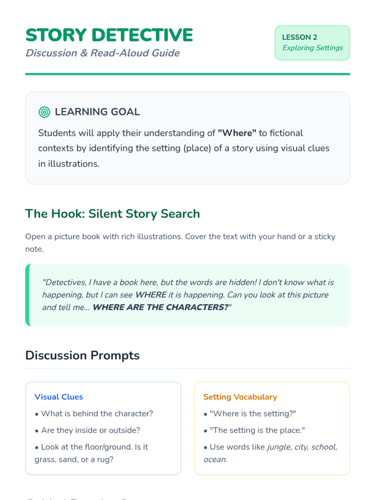 During a read-aloud, the class focuses exclusively on the setting, pausing to ask 'Where are the characters?'. Students use illustrations to identify clues that answer 'Where' questions.