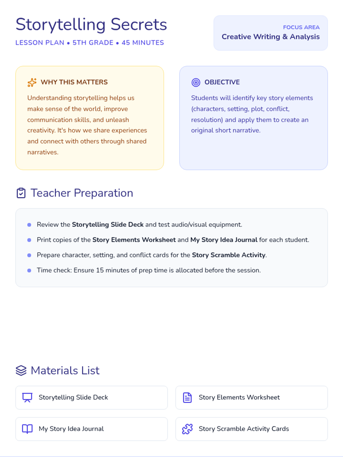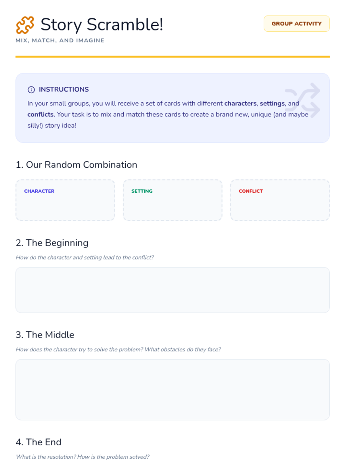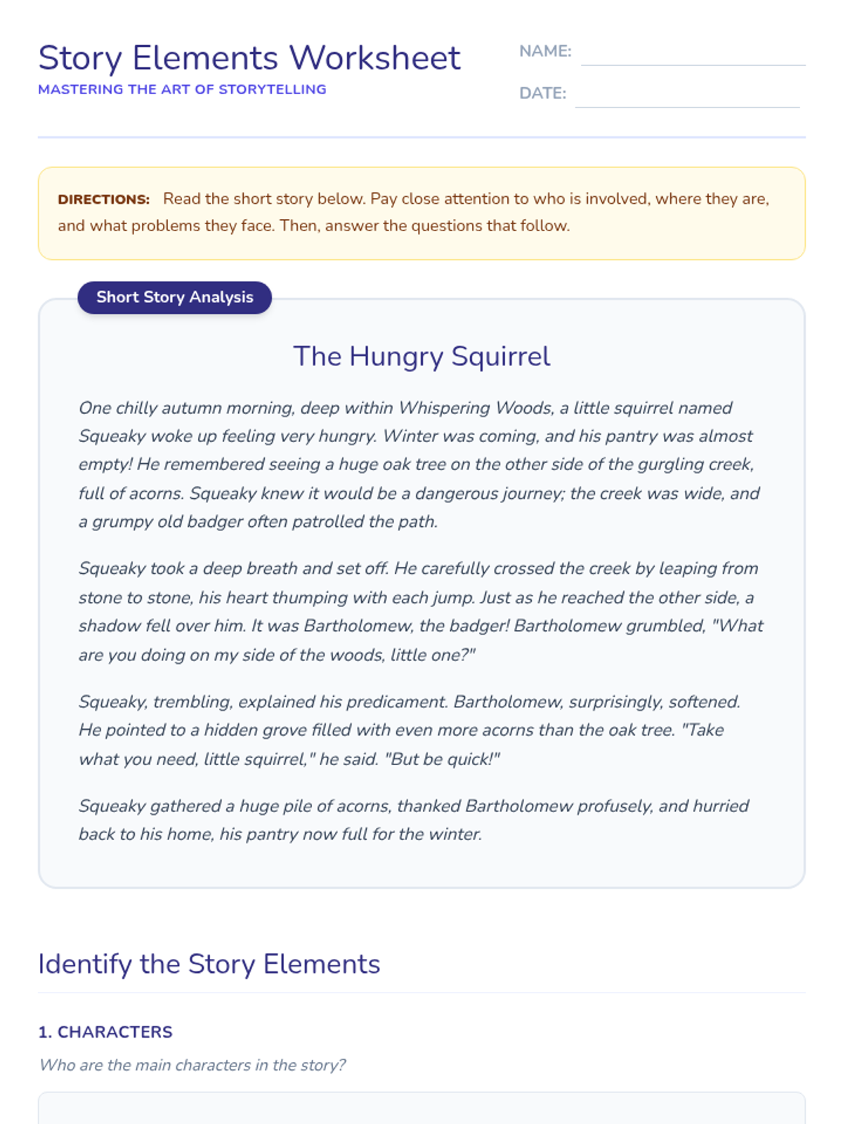 Students will be able to identify the key elements of a story (characters, setting, plot, conflict, resolution) and apply them to create a short narrative.