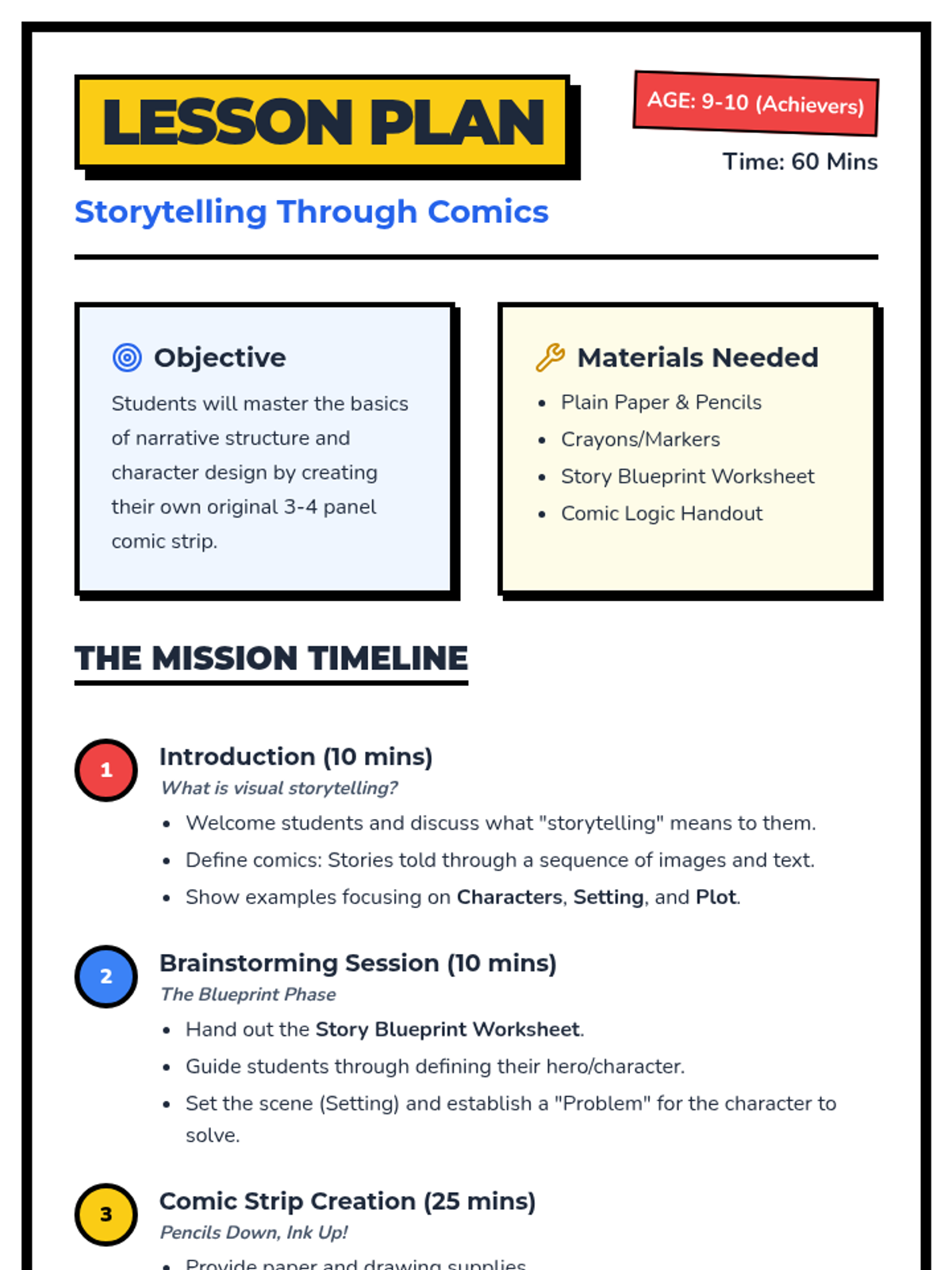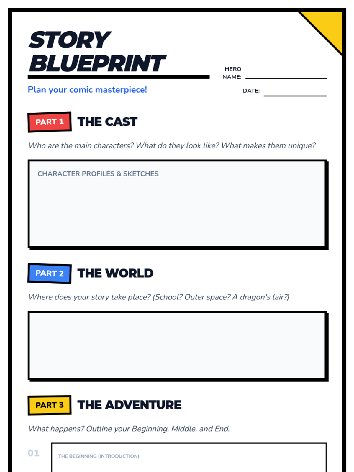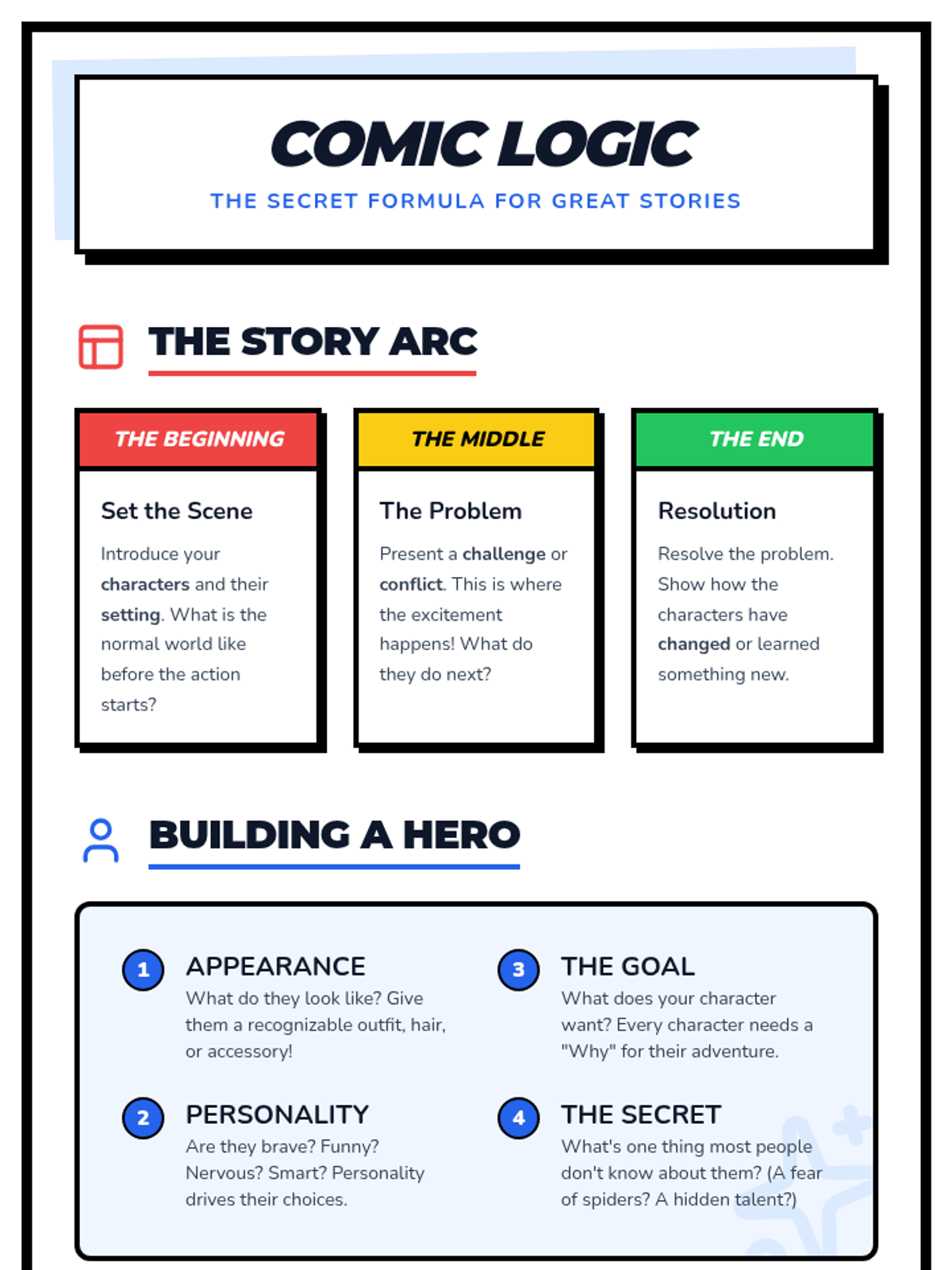 A lesson where students learn the basics of narrative structure and character development to create their own original comic strips.