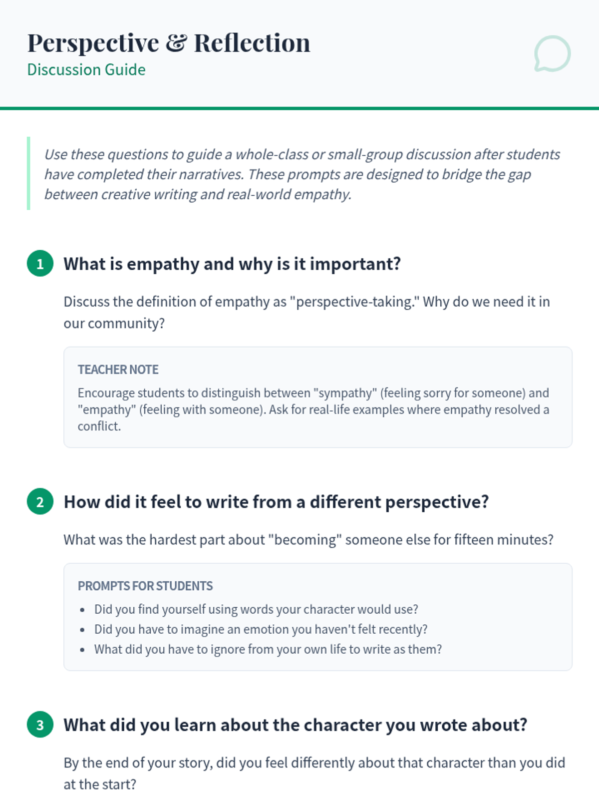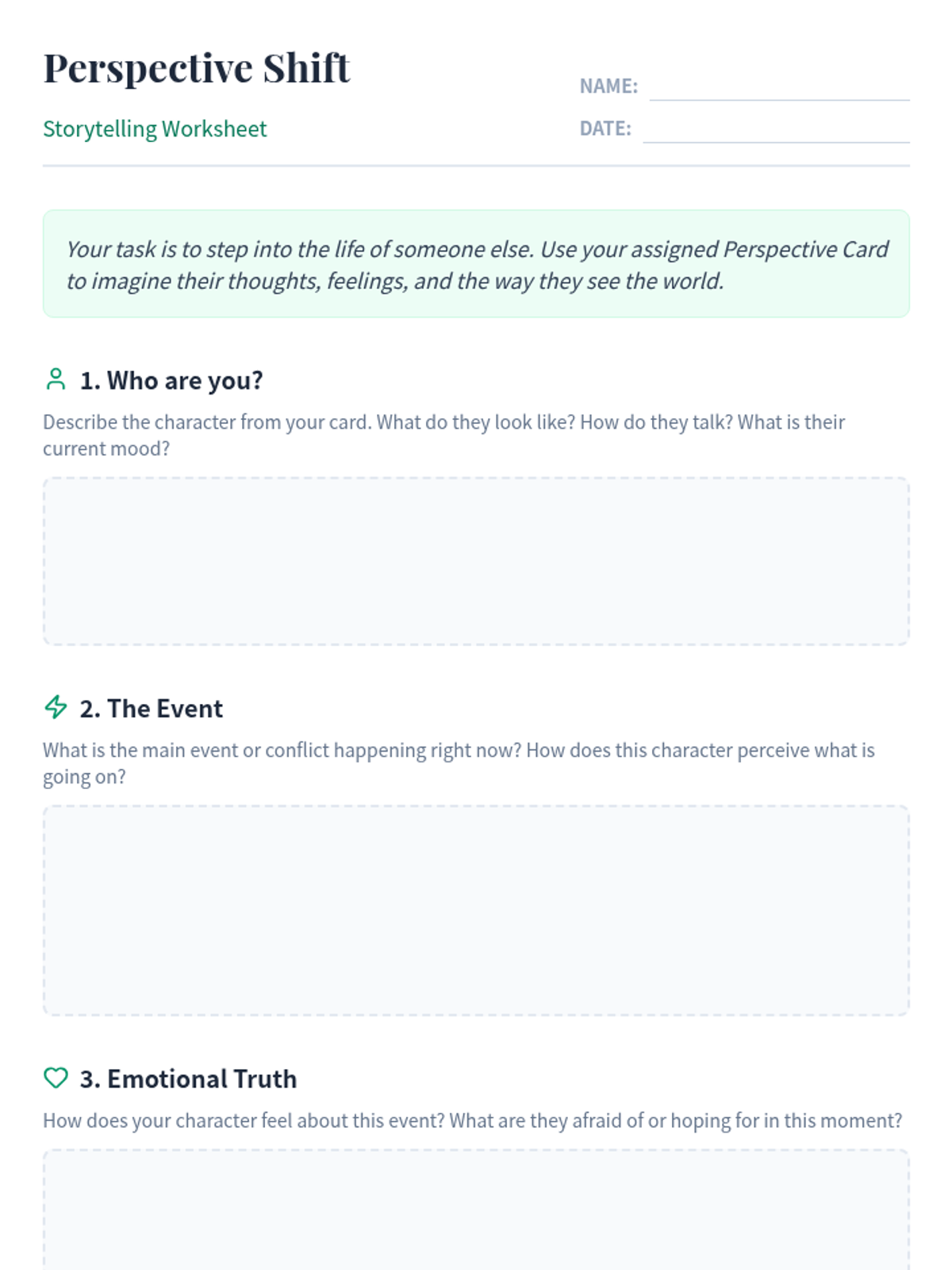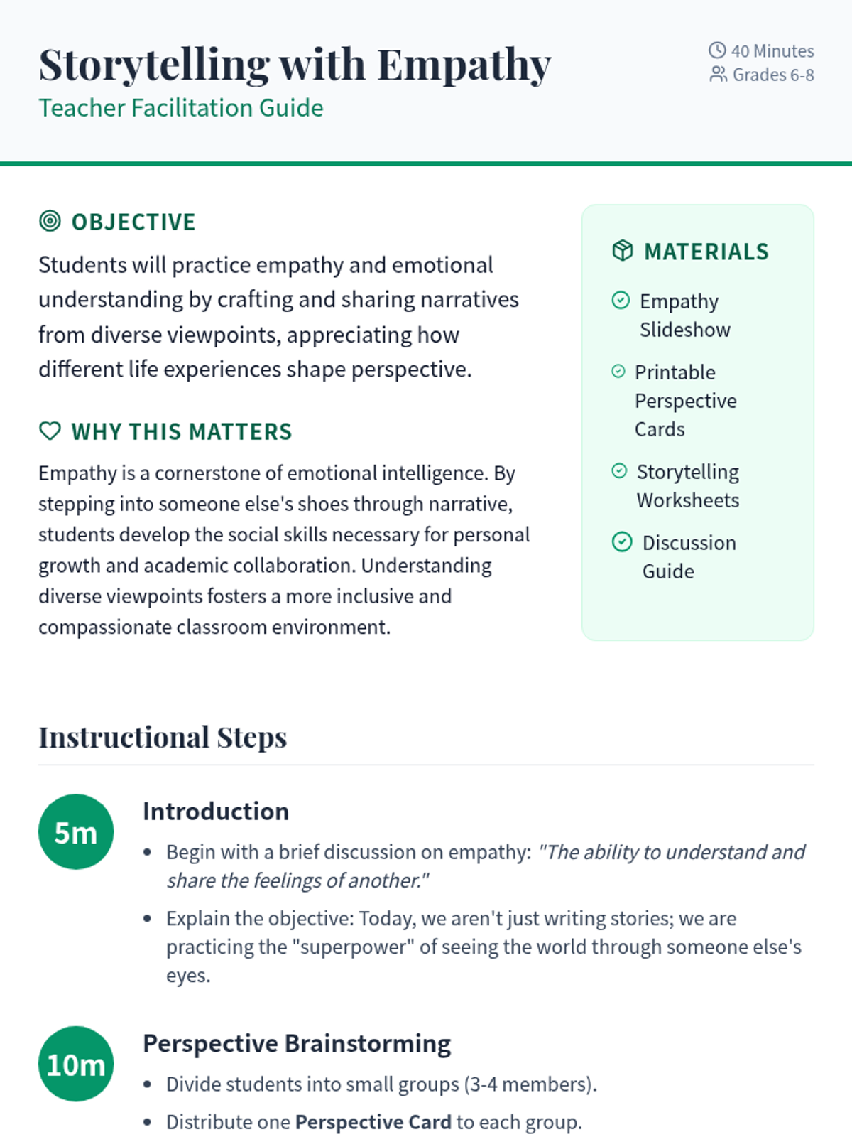 A lesson where students practice empathy and emotional intelligence by crafting narratives from diverse perspectives through interactive storytelling activities.