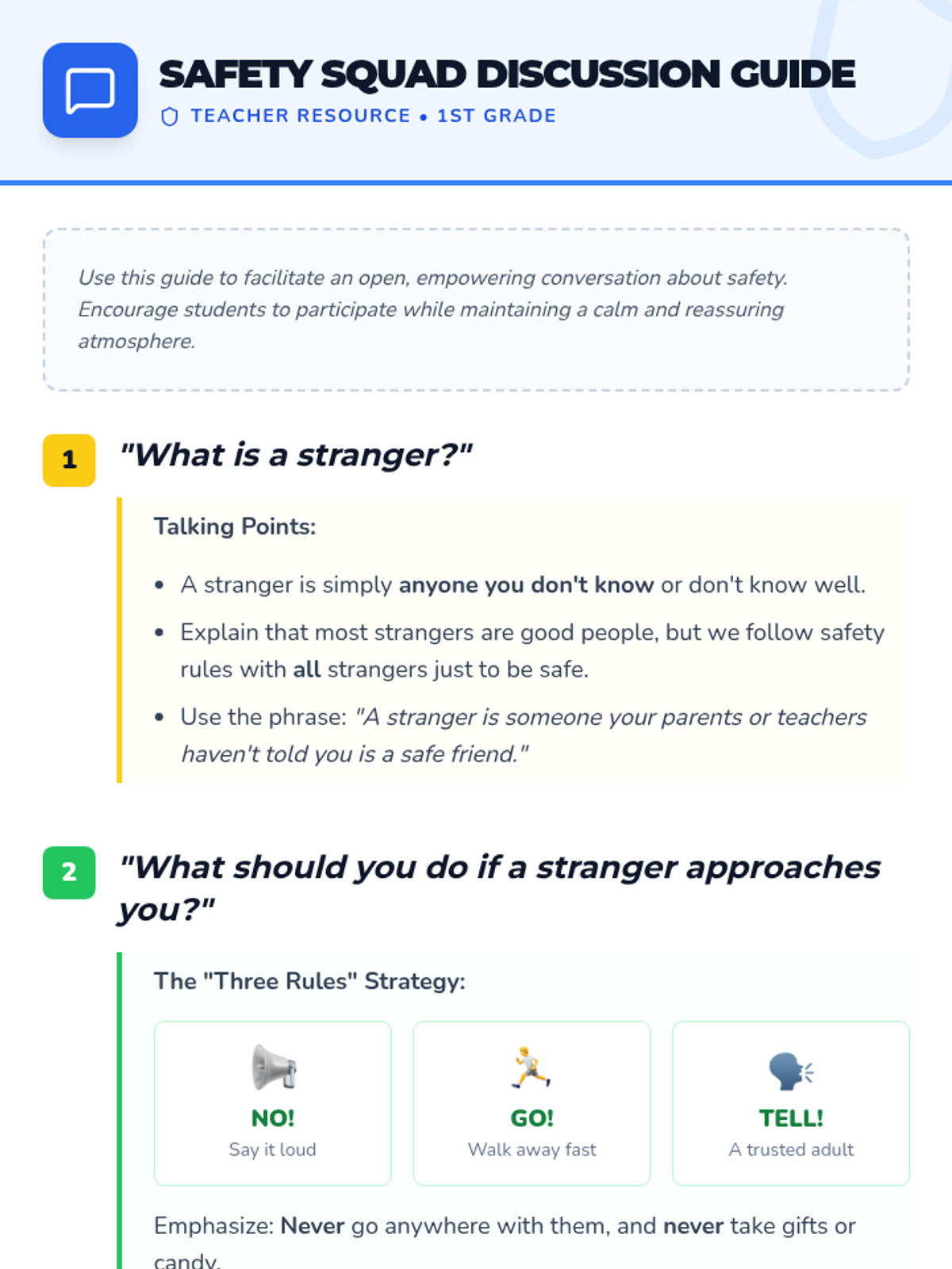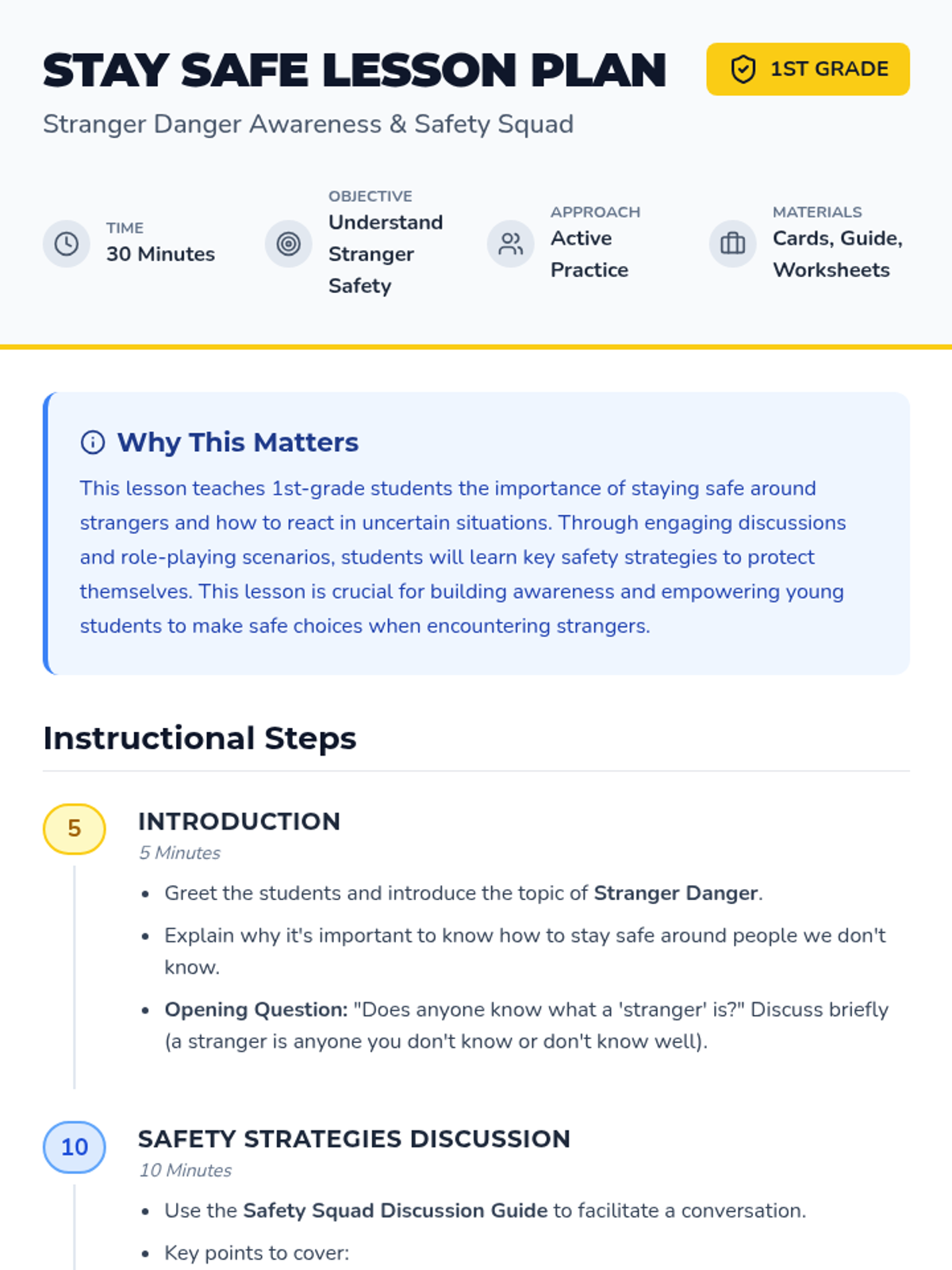 A 30-minute lesson for 1st graders focused on defining strangers, identifying safe adults, and practicing responses to uncertain situations through role-play.