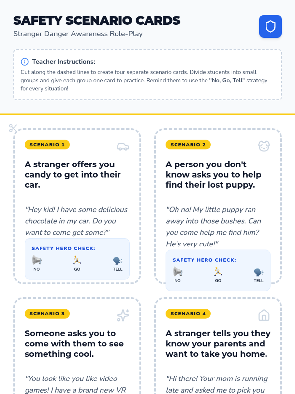 A lesson designed to teach children how to recognize common tricks used by strangers and how to respond safely.