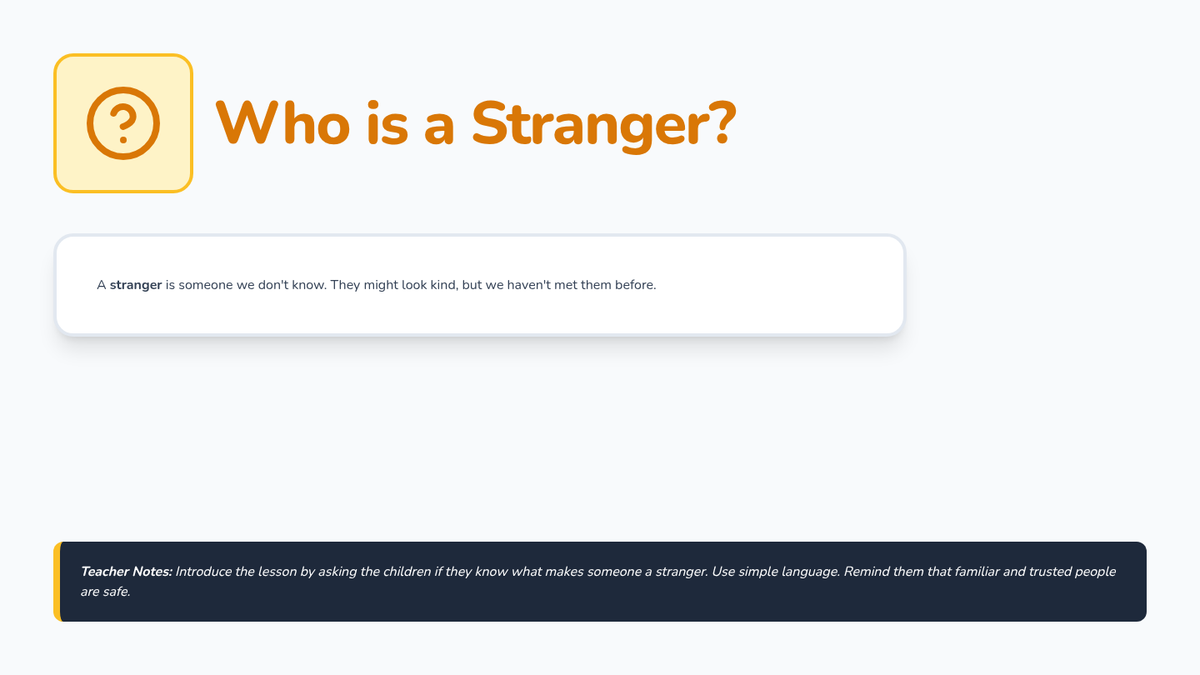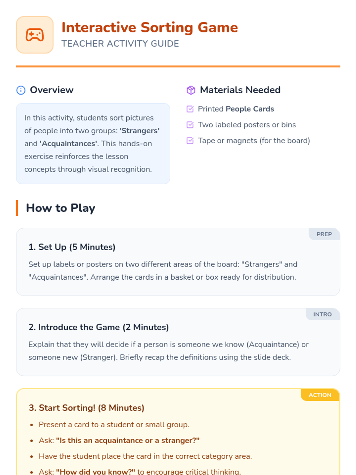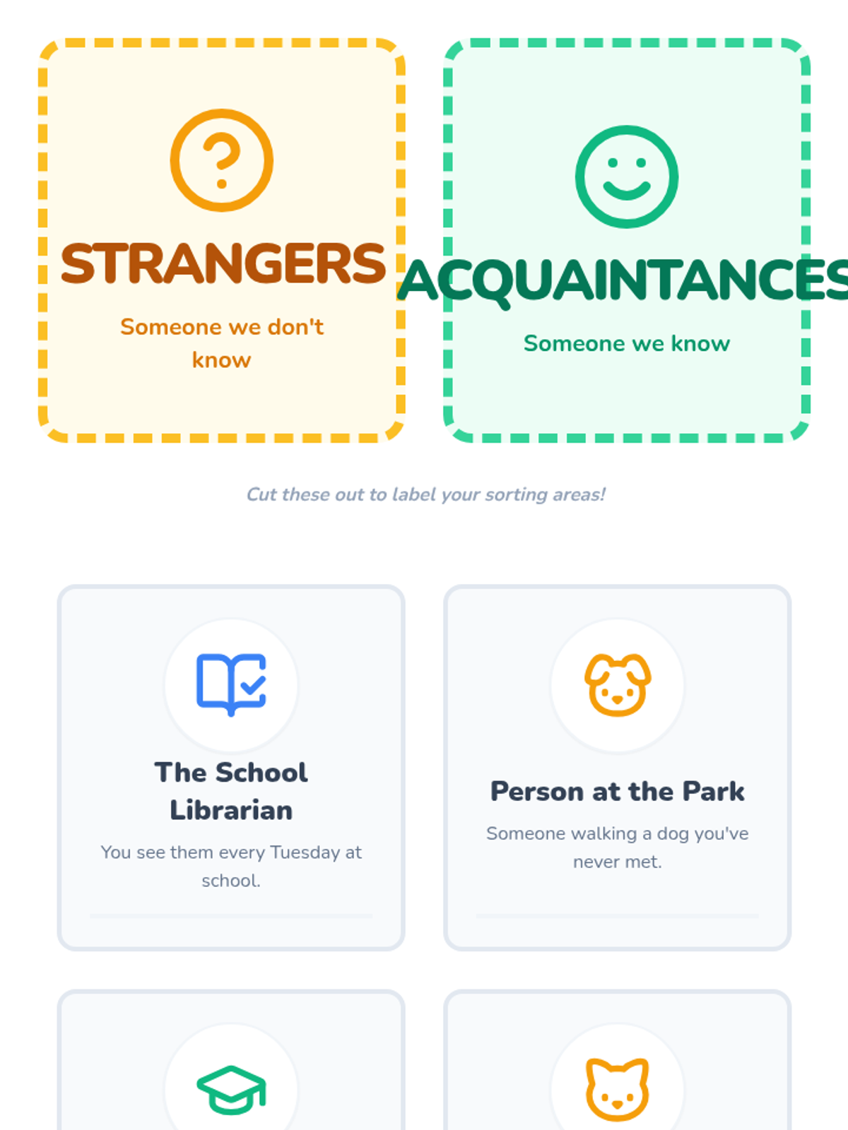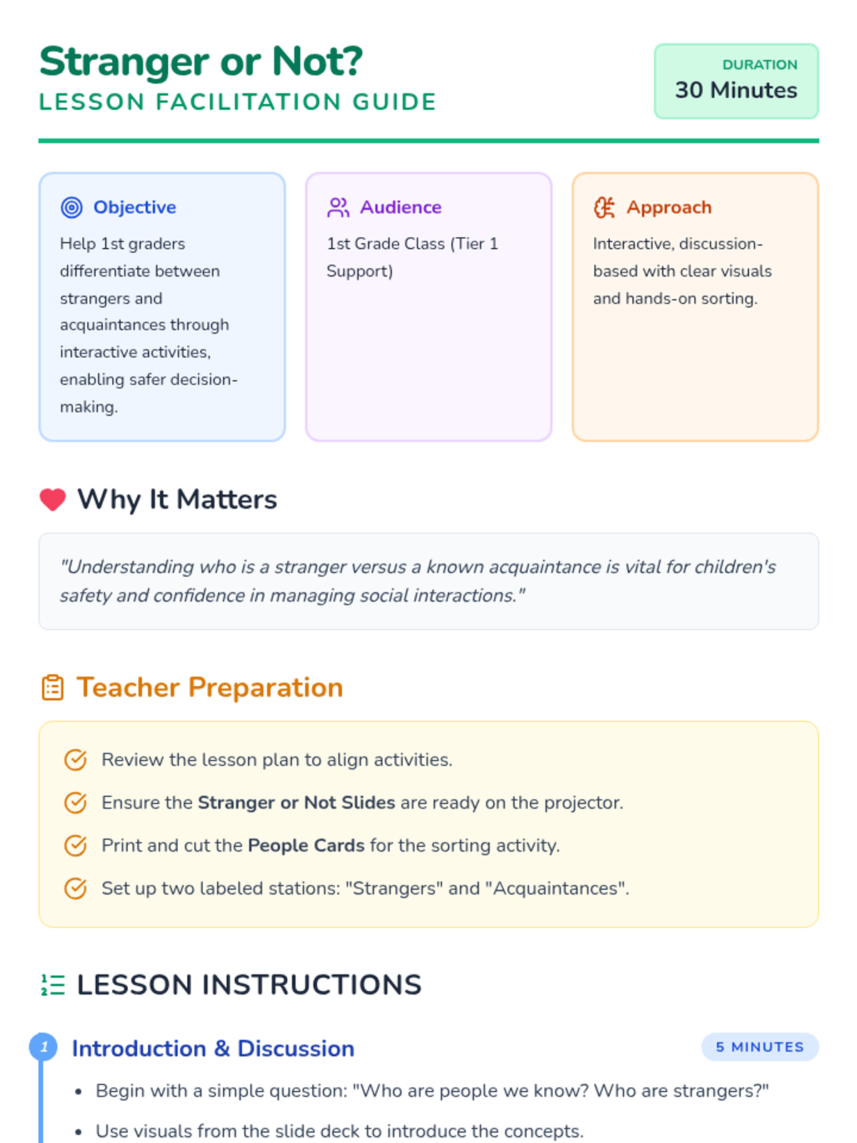 A 30-minute interactive lesson for 1st graders to help them distinguish between strangers and acquaintances to improve personal safety and social decision-making.