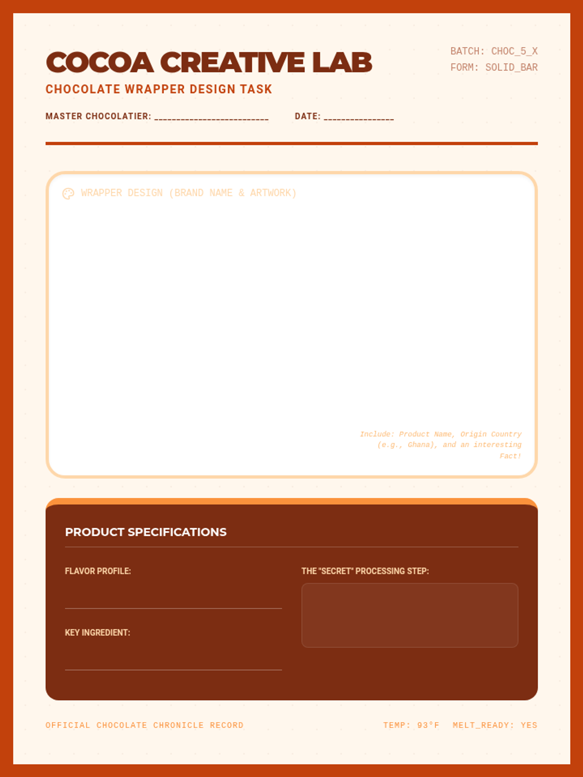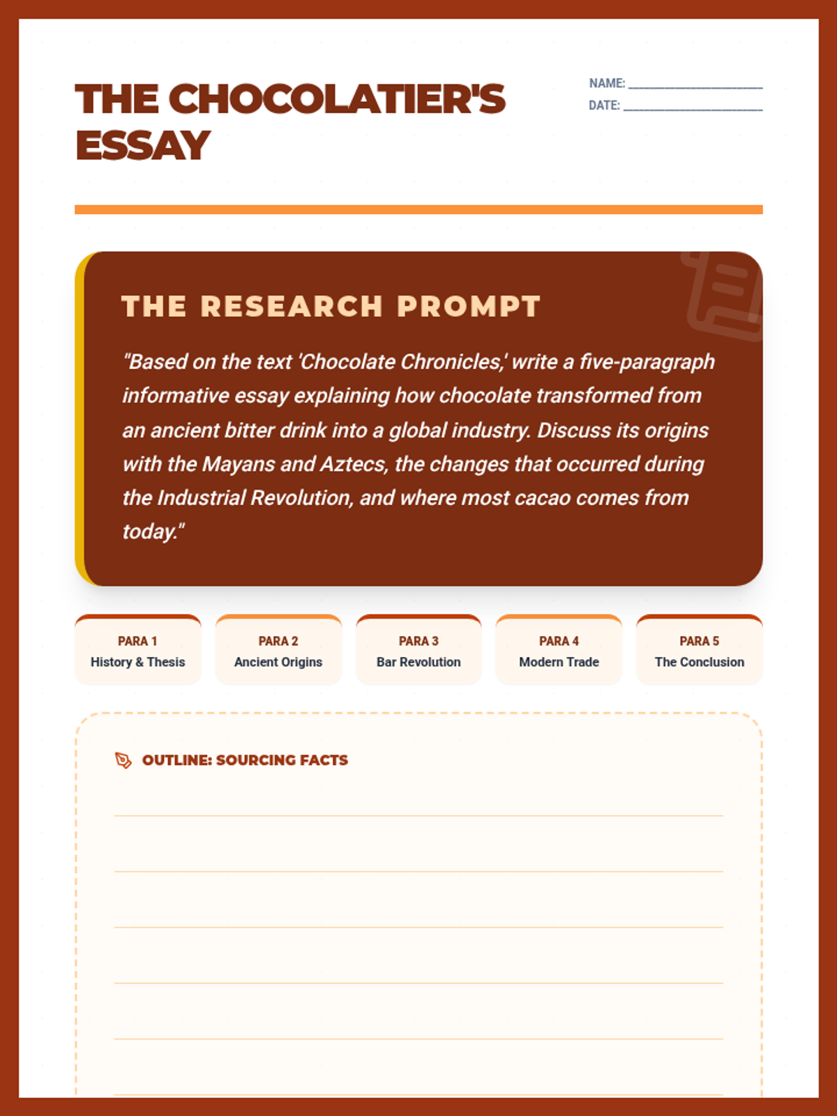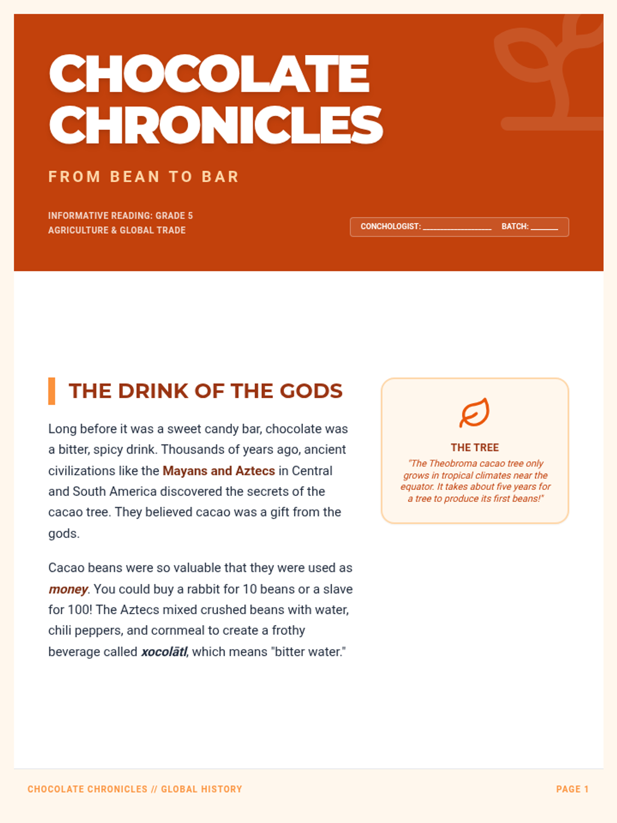 An informative unit for 5th graders exploring the history of chocolate from ancient Mayan rituals to the modern candy industry, featuring a creative design task and a research essay.