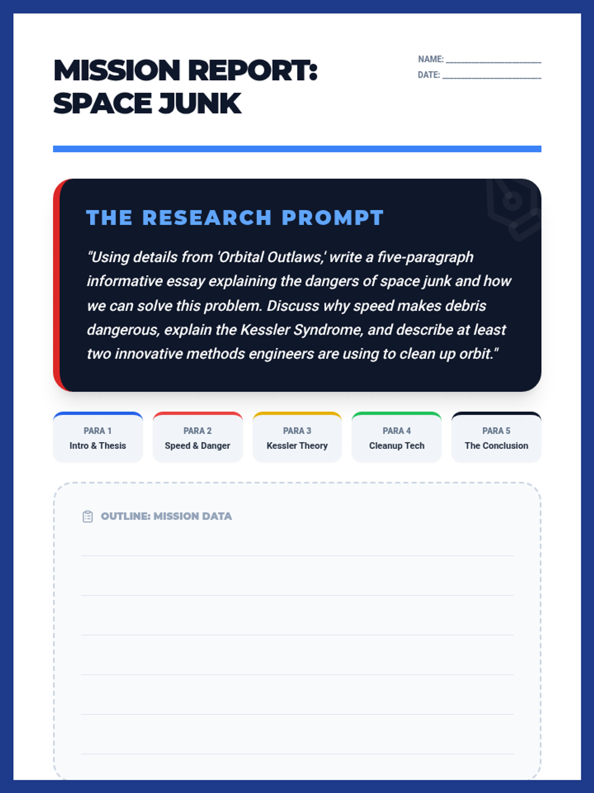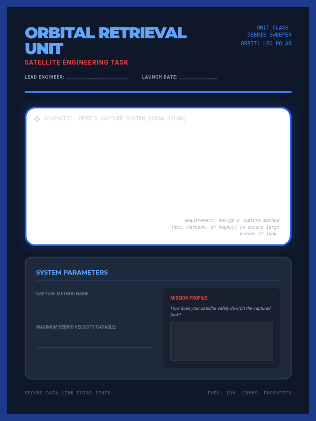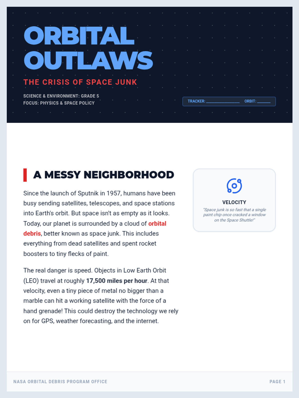 An informative unit for 5th graders exploring the growing problem of space junk, the science of orbital mechanics, and innovative solutions for cleaning up Earth's orbit.