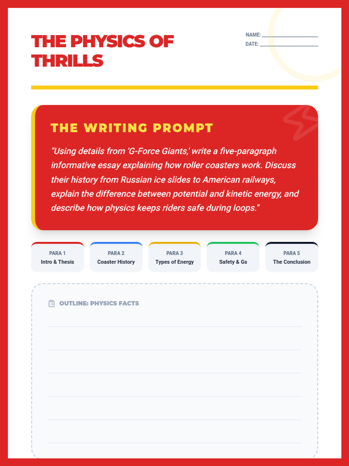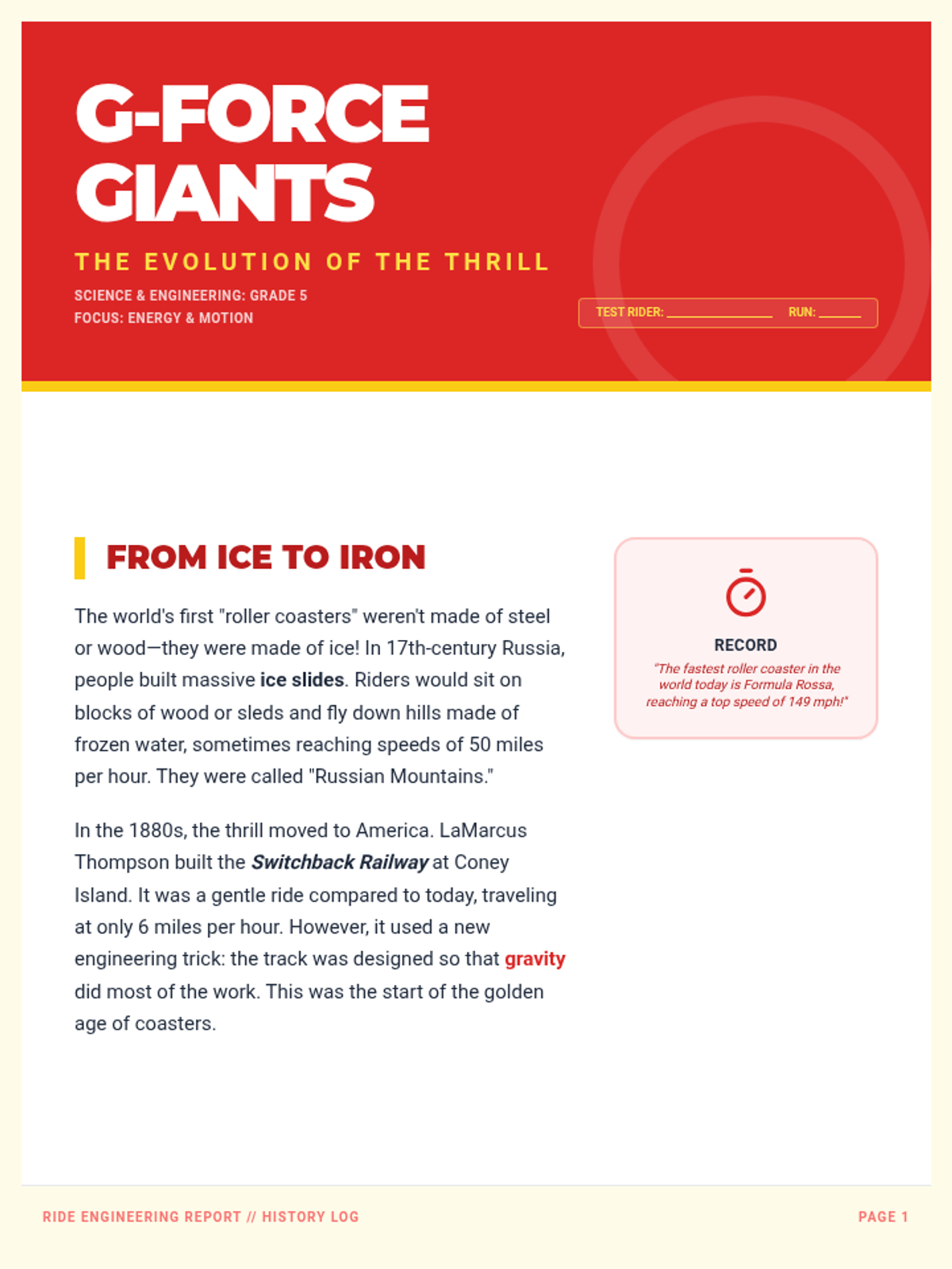An informative unit for 5th graders exploring the history and physics of roller coasters, from early Russian ice slides to modern g-force engineering.