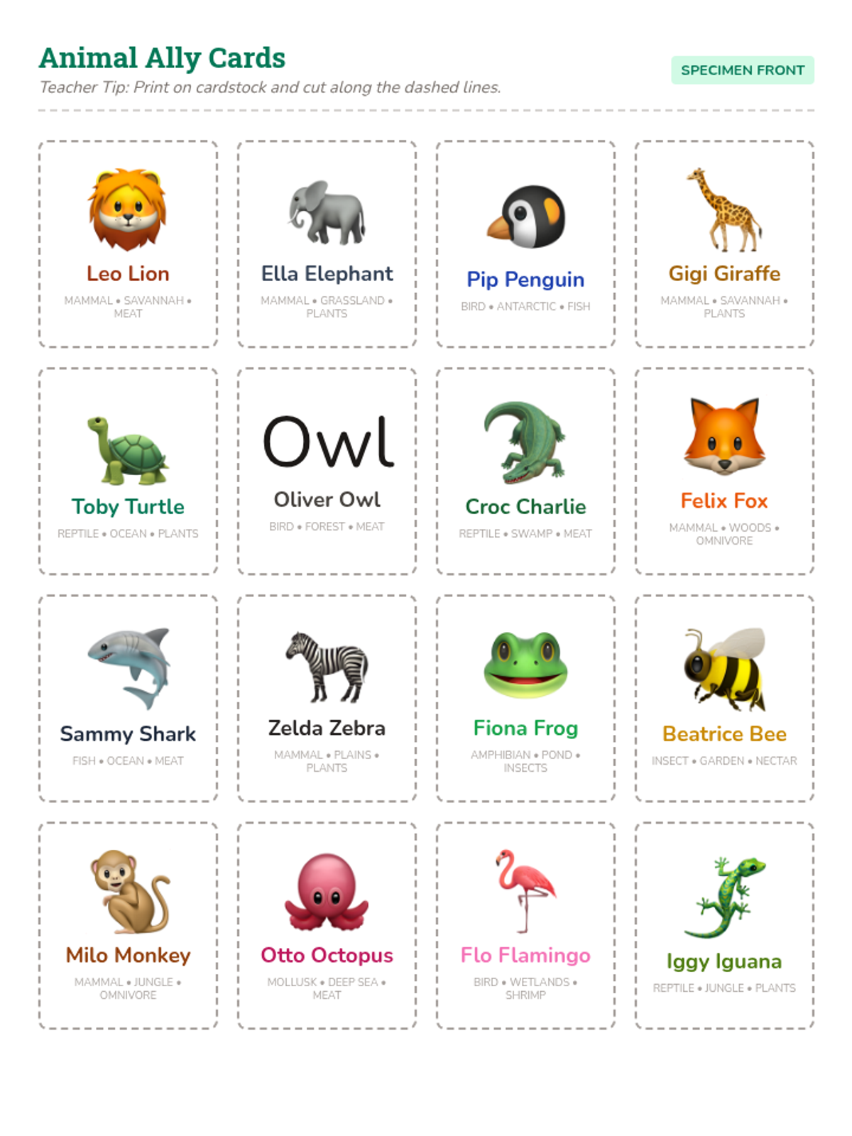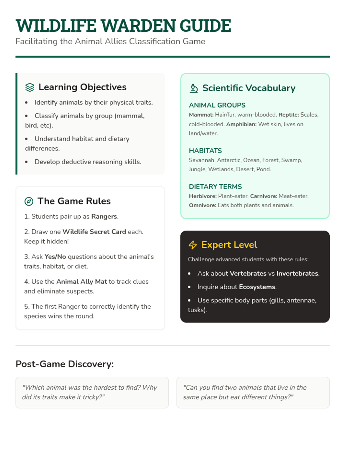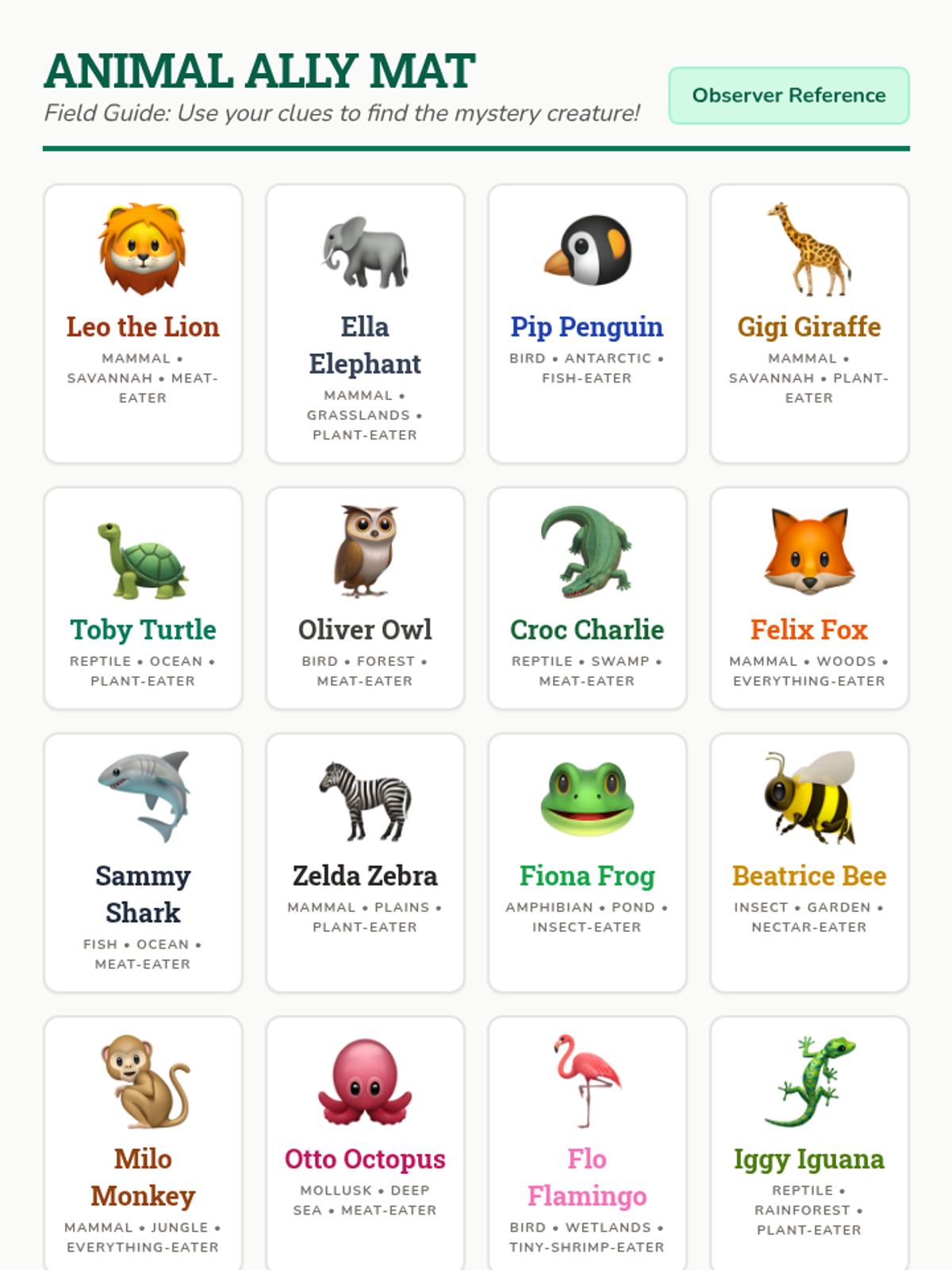 An engaging 'Guess Who' style game where students use descriptive language and biological traits to identify mystery animals. Focuses on classification, habitats, and physical characteristics.