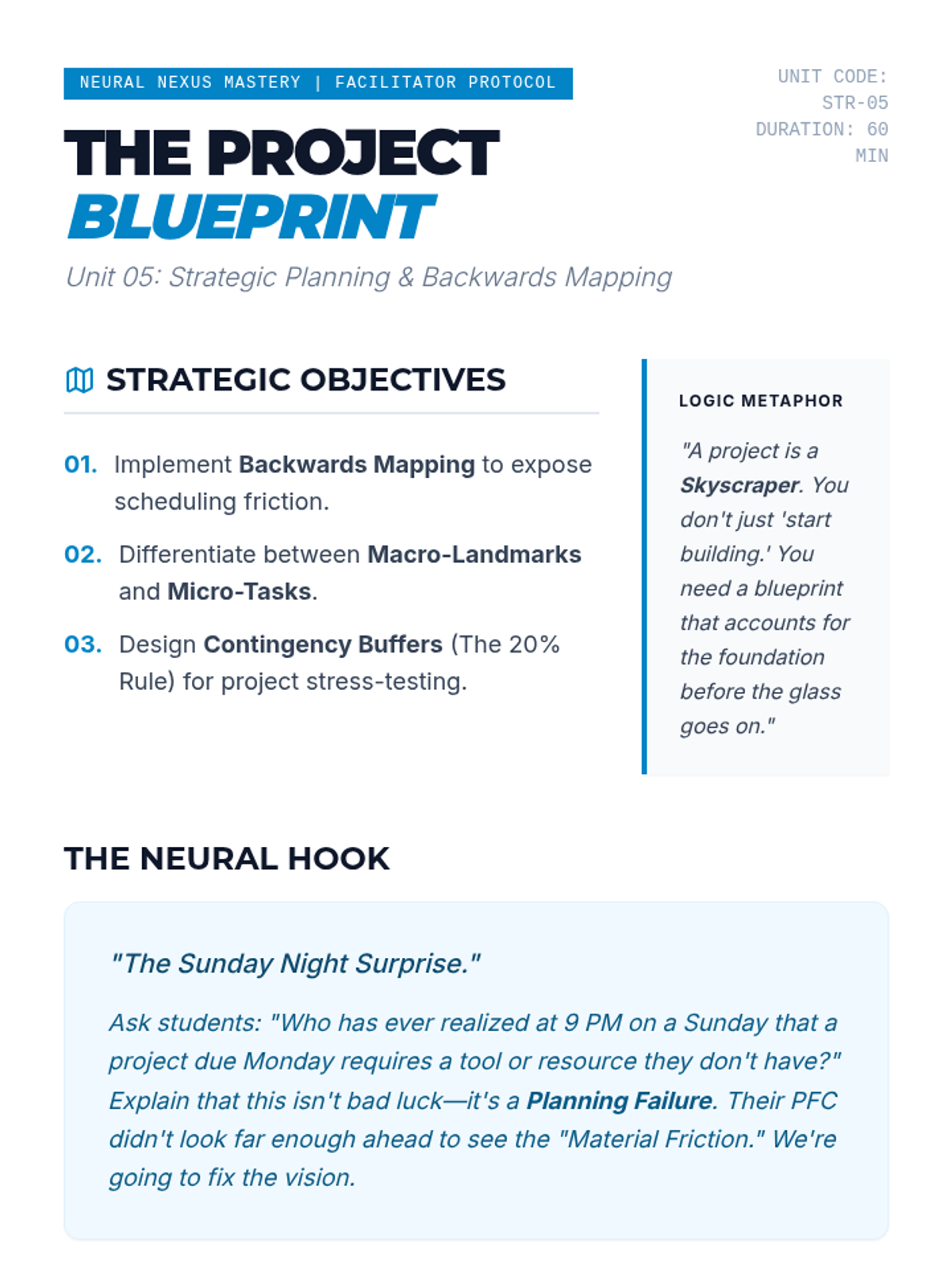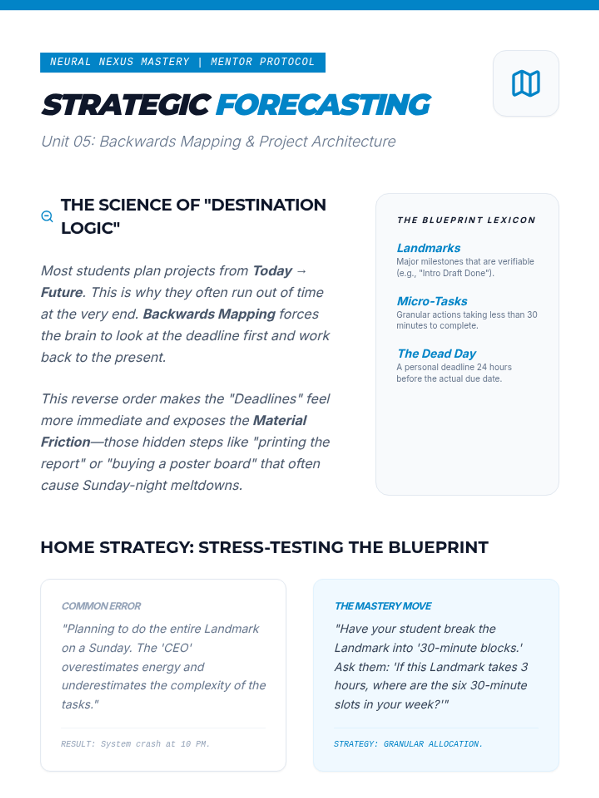 Covers advanced strategic planning, including backwards mapping and contingency planning. Students learn to build 'mental blueprints' for complex, multi-stage projects.