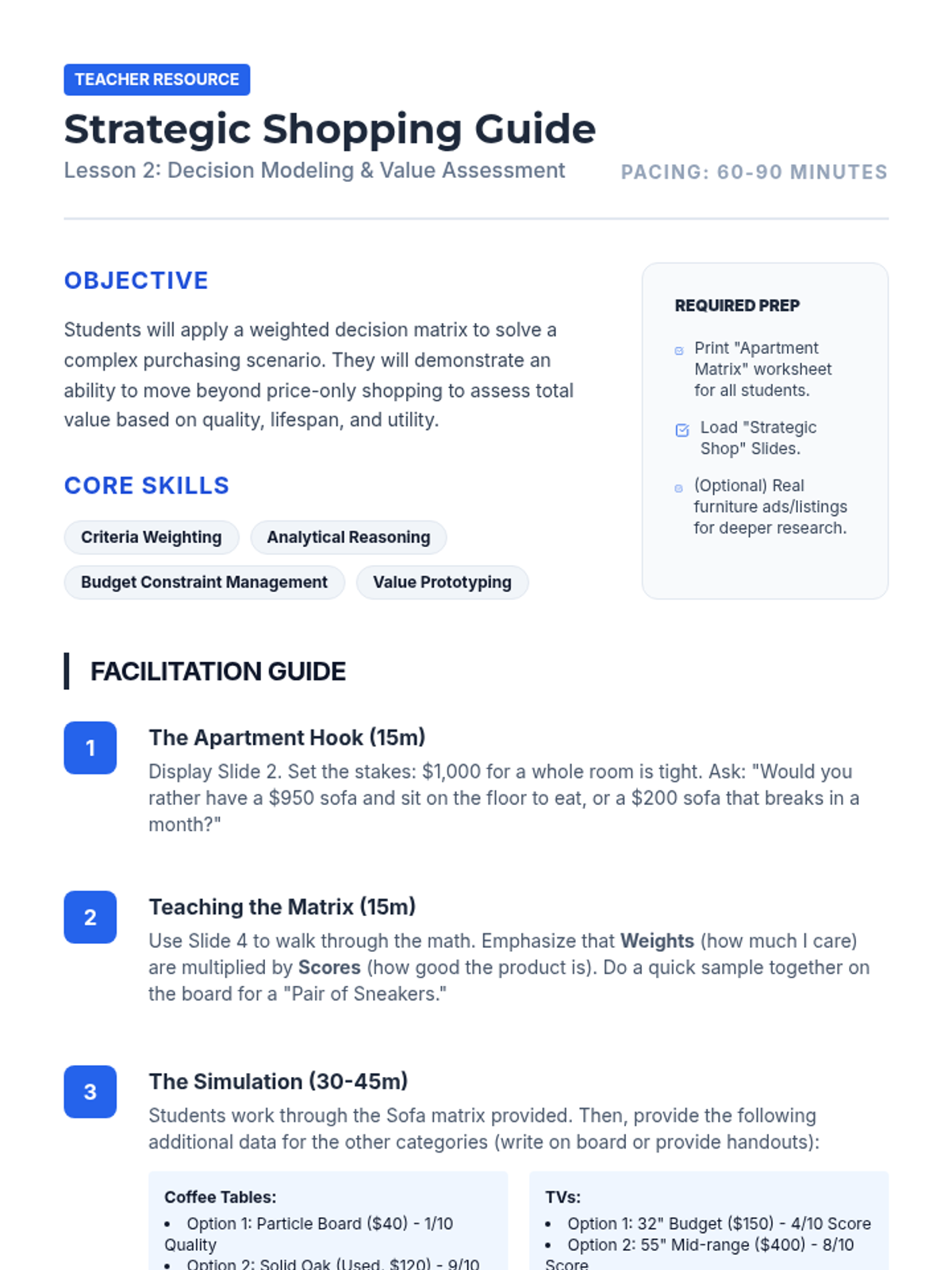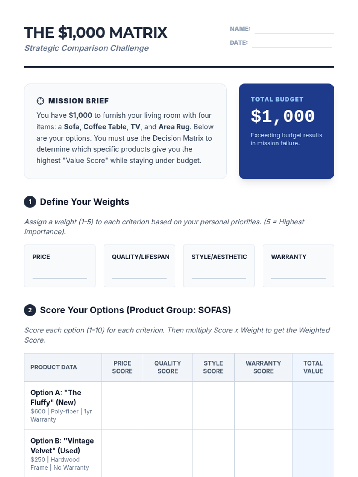 Using a decision matrix, students objectively evaluate competing products based on weighted criteria like price, quality, warranty, and features to assess value proposition.