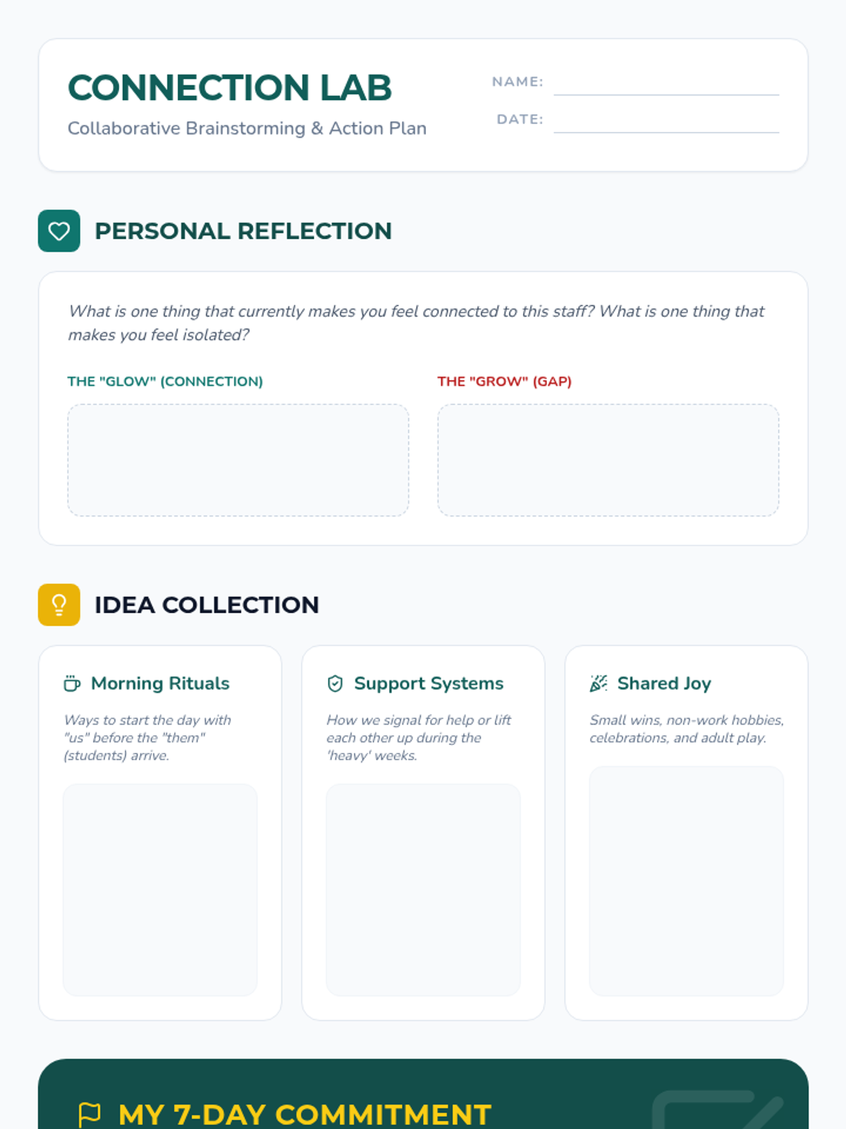A one-hour interactive session focusing on building staff connections through shared experiences and collaborative brainstorming.
