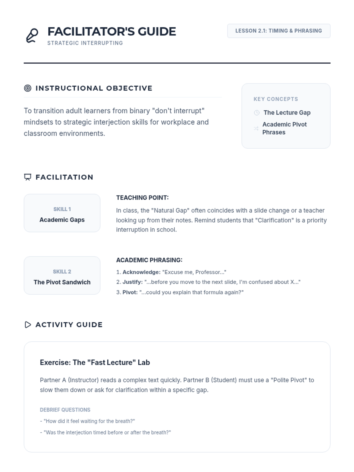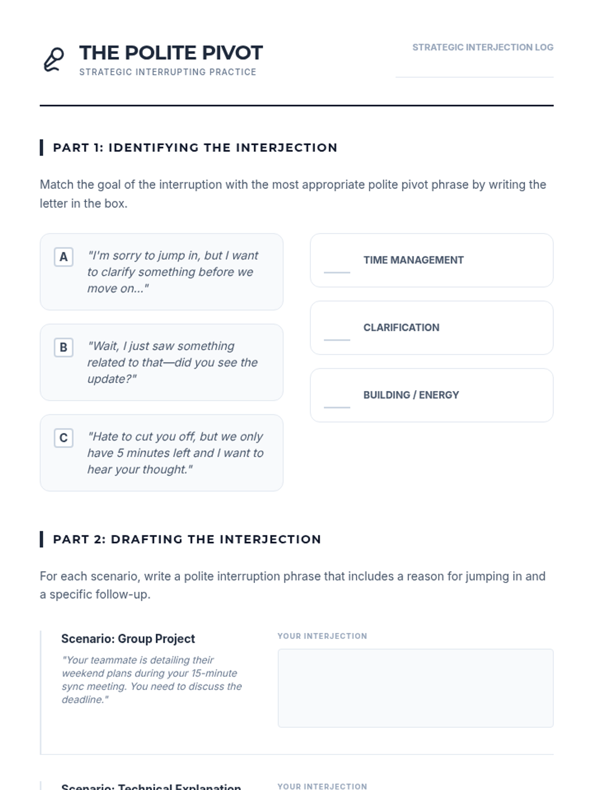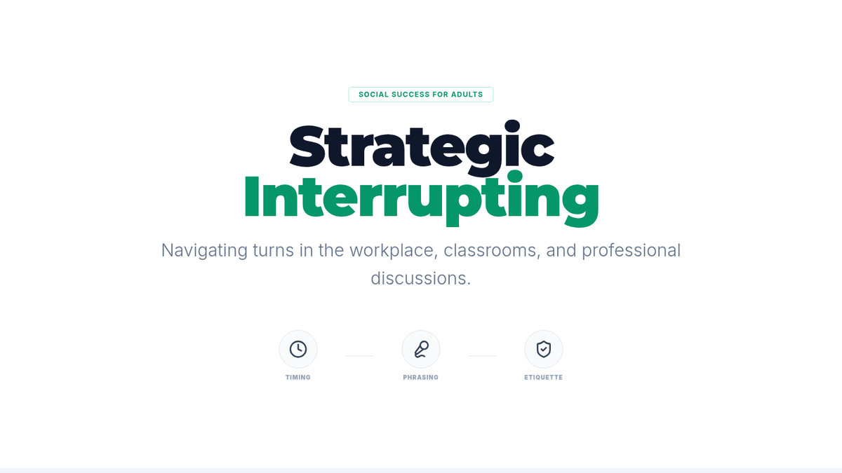 A specialized lesson on the nuances of interrupting in professional and social settings, focusing on appropriate timing, polite interjection phrases, and situational awareness.