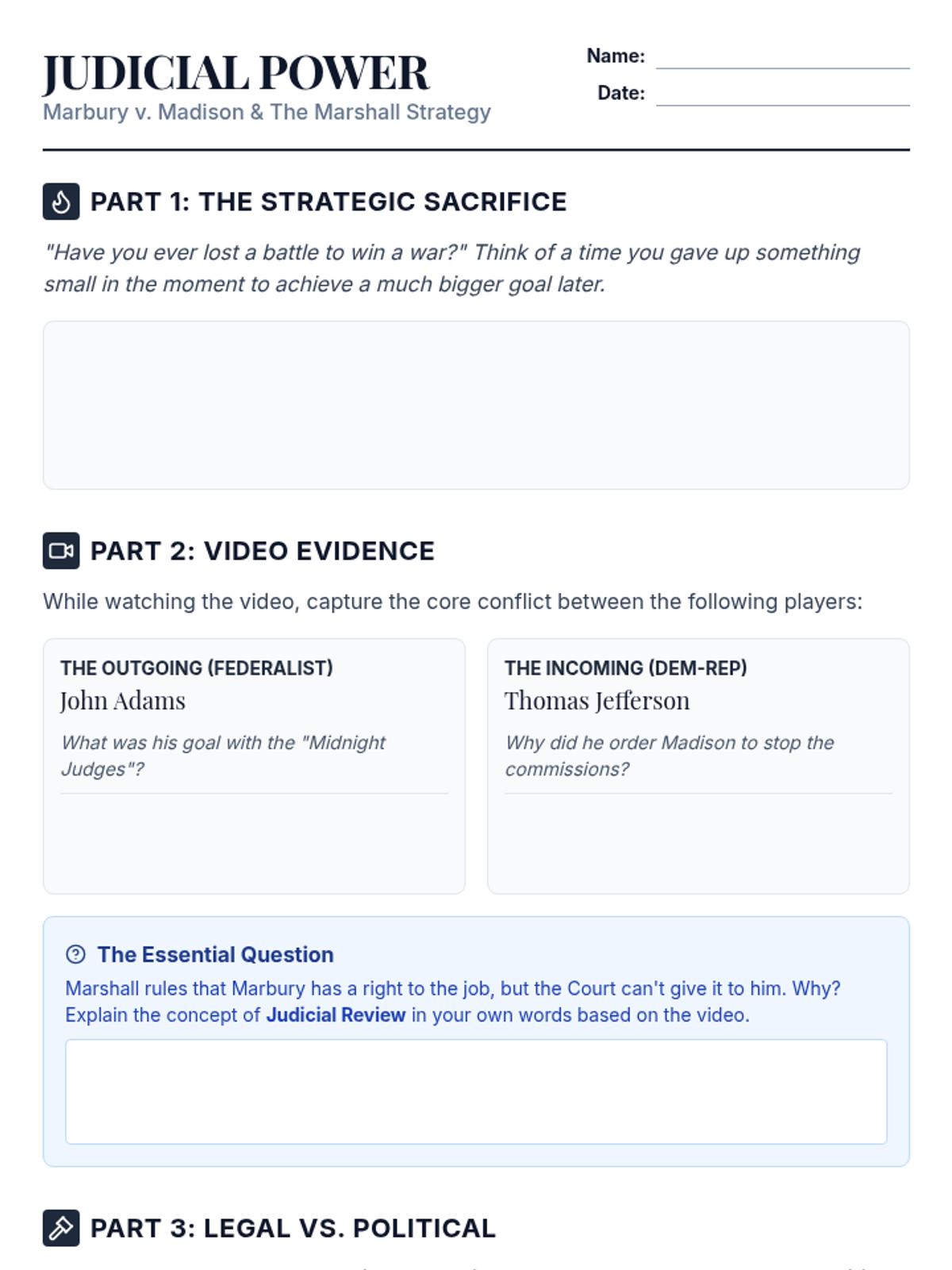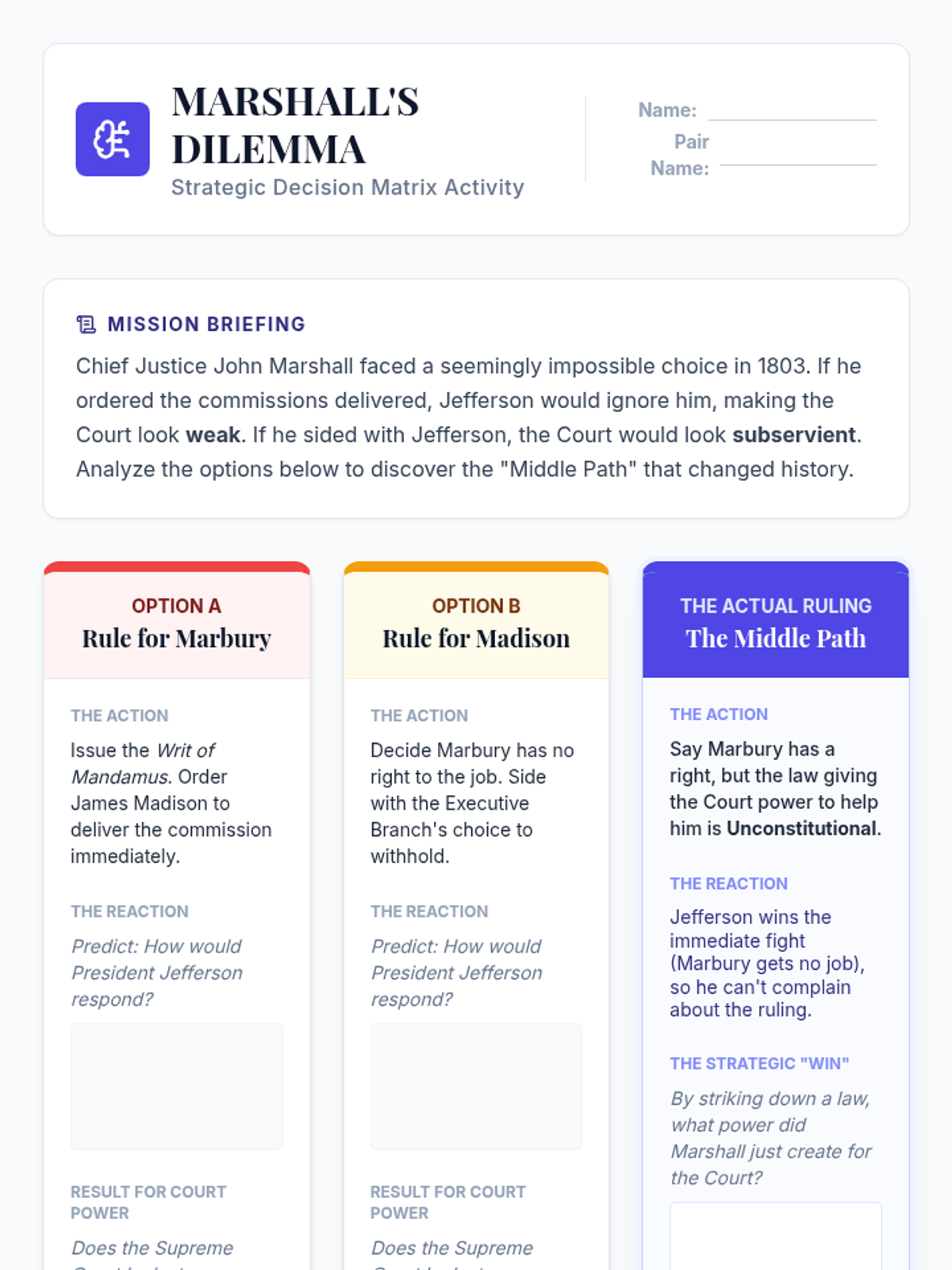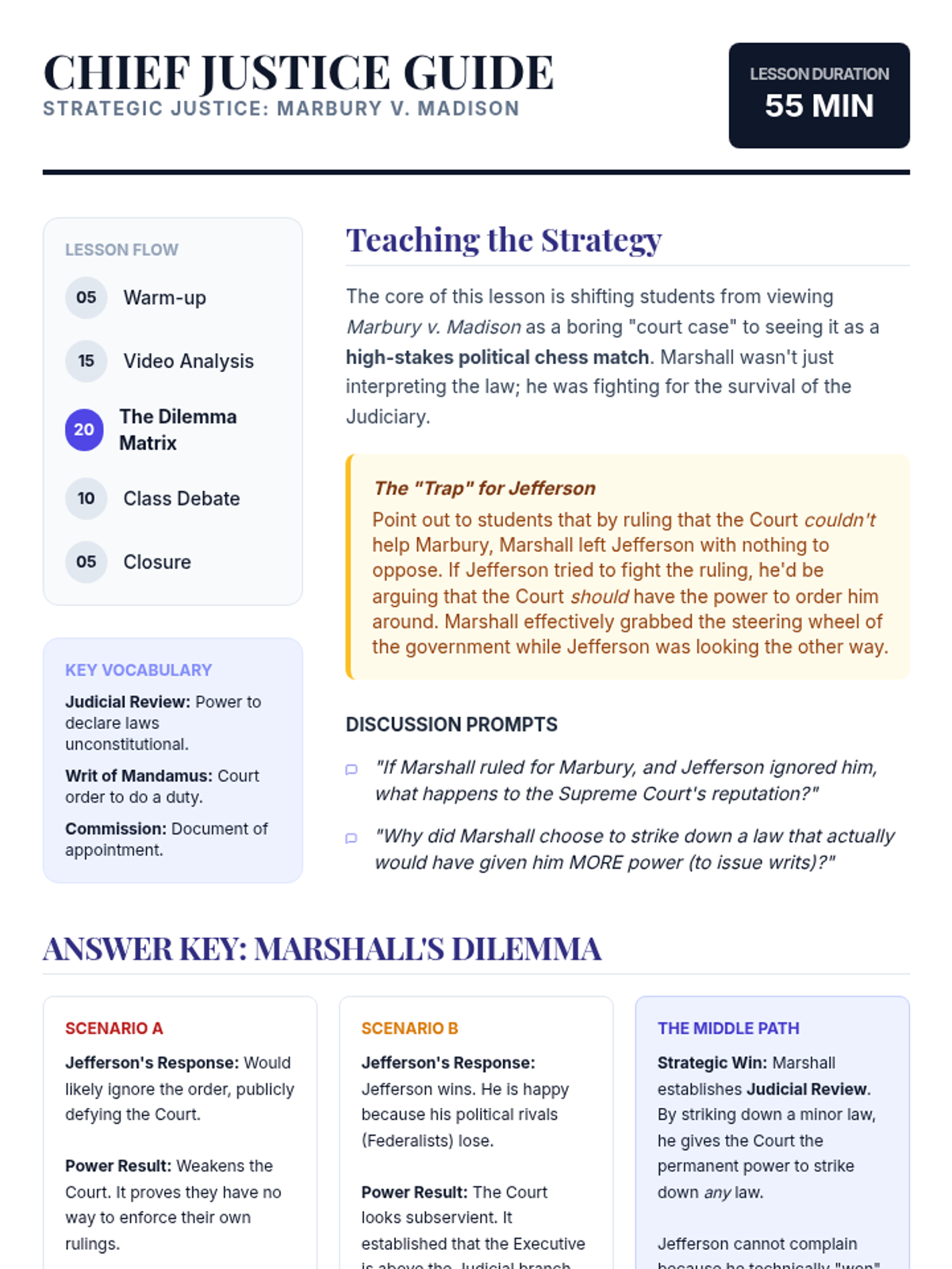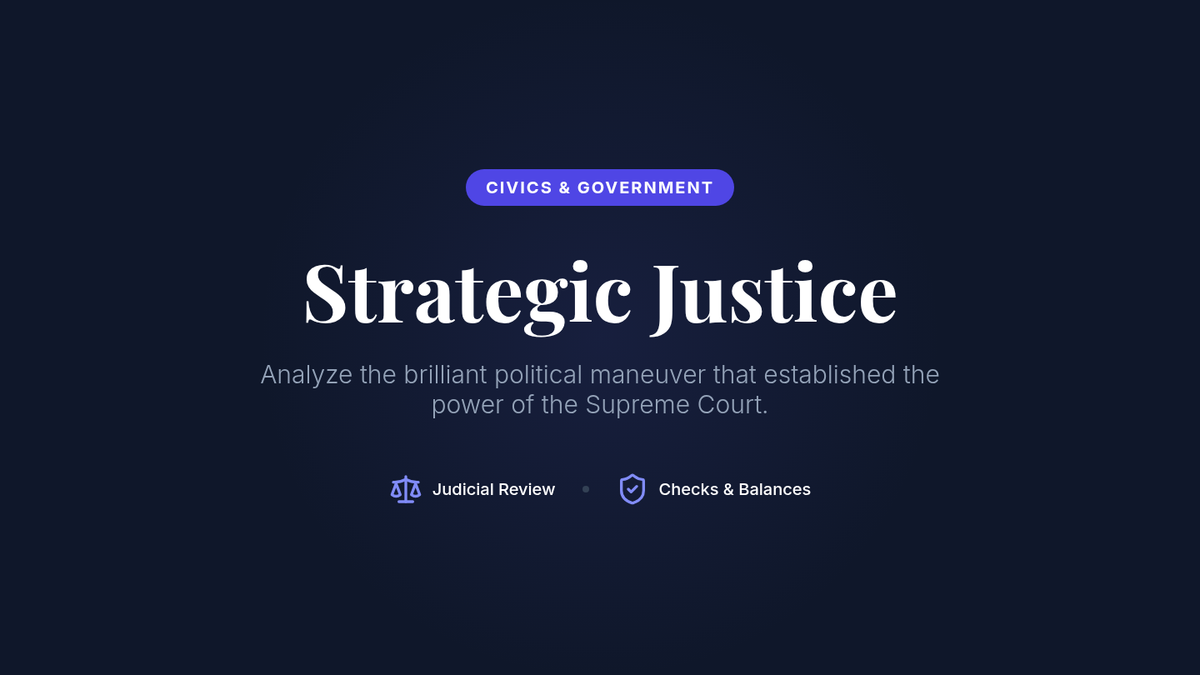 A High School Civics lesson focused on the strategic brilliance of Chief Justice John Marshall in the landmark case Marbury v. Madison. Students analyze how Marshall navigated a political minefield to establish the power of Judicial Review, sacrificing a short-term legal victory to secure long-term institutional authority.