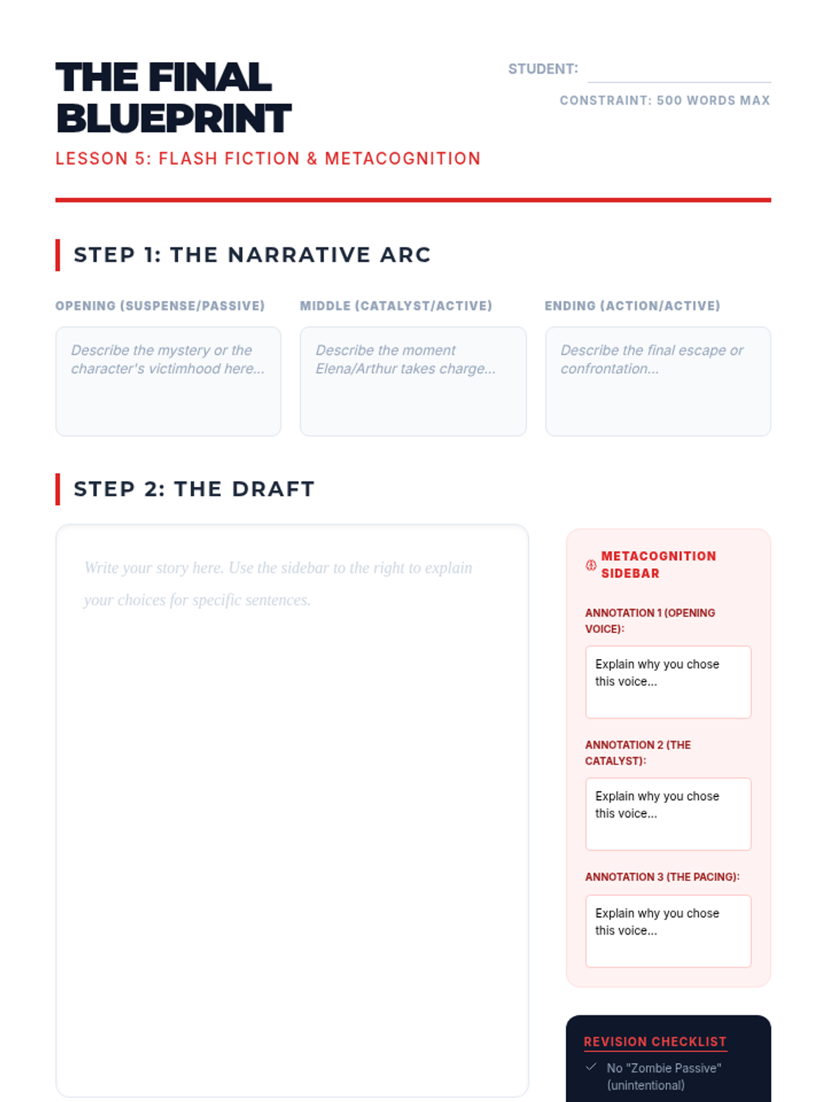 A final drafting workshop where students produce a flash fiction piece that strategically shifts voice to reflect character growth or tonal changes.
