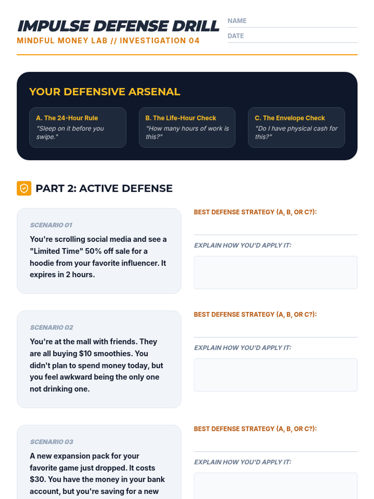 Students learn practical techniques to curb impulse spending, such as the '24-hour rule' and the 'envelope method,' testing them through hypothetical scenarios.