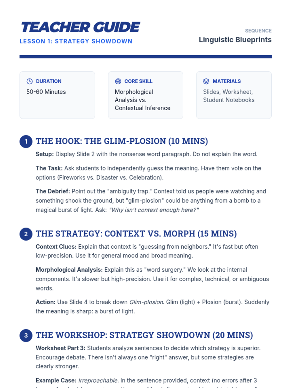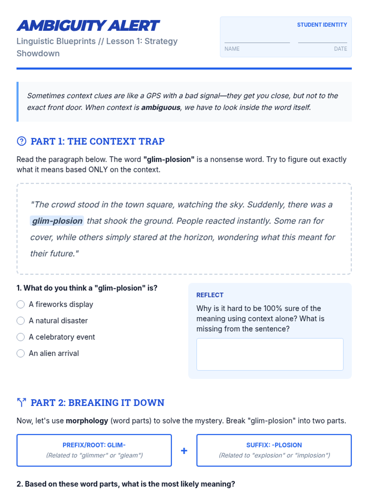 Students learn to balance context clues with morphological analysis, identifying when context is unreliable and word parts are essential for meaning.