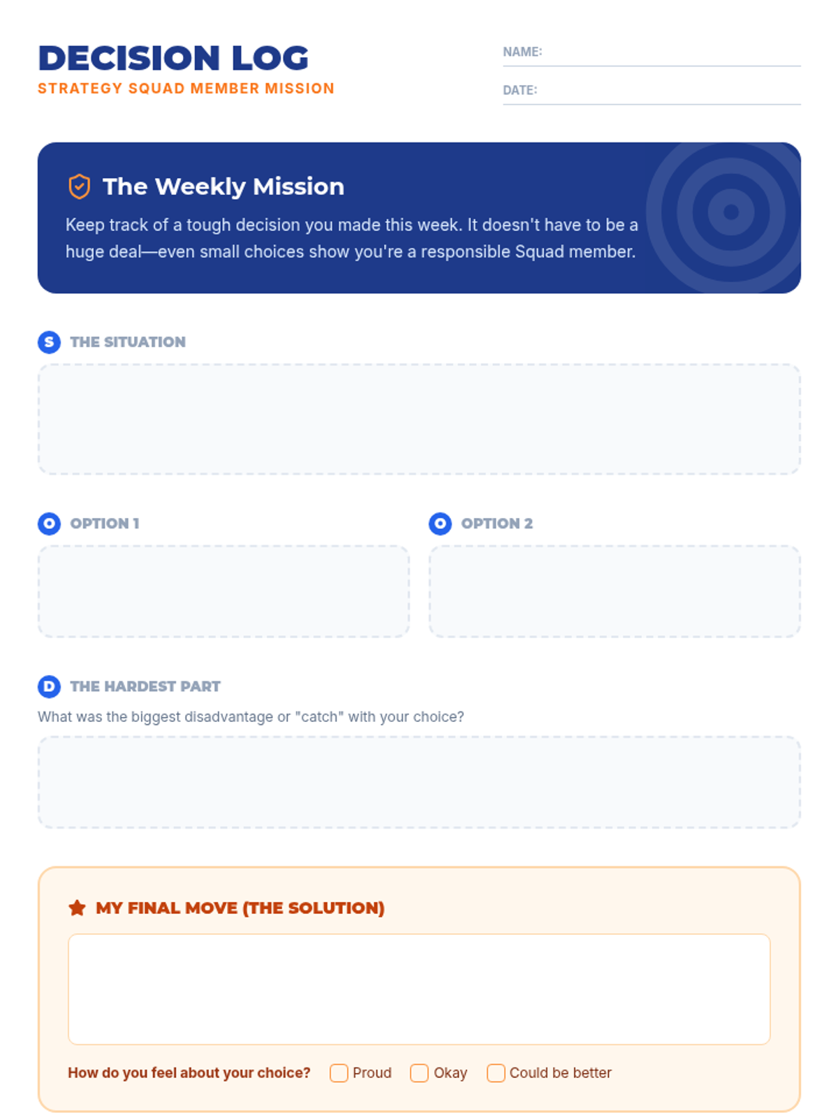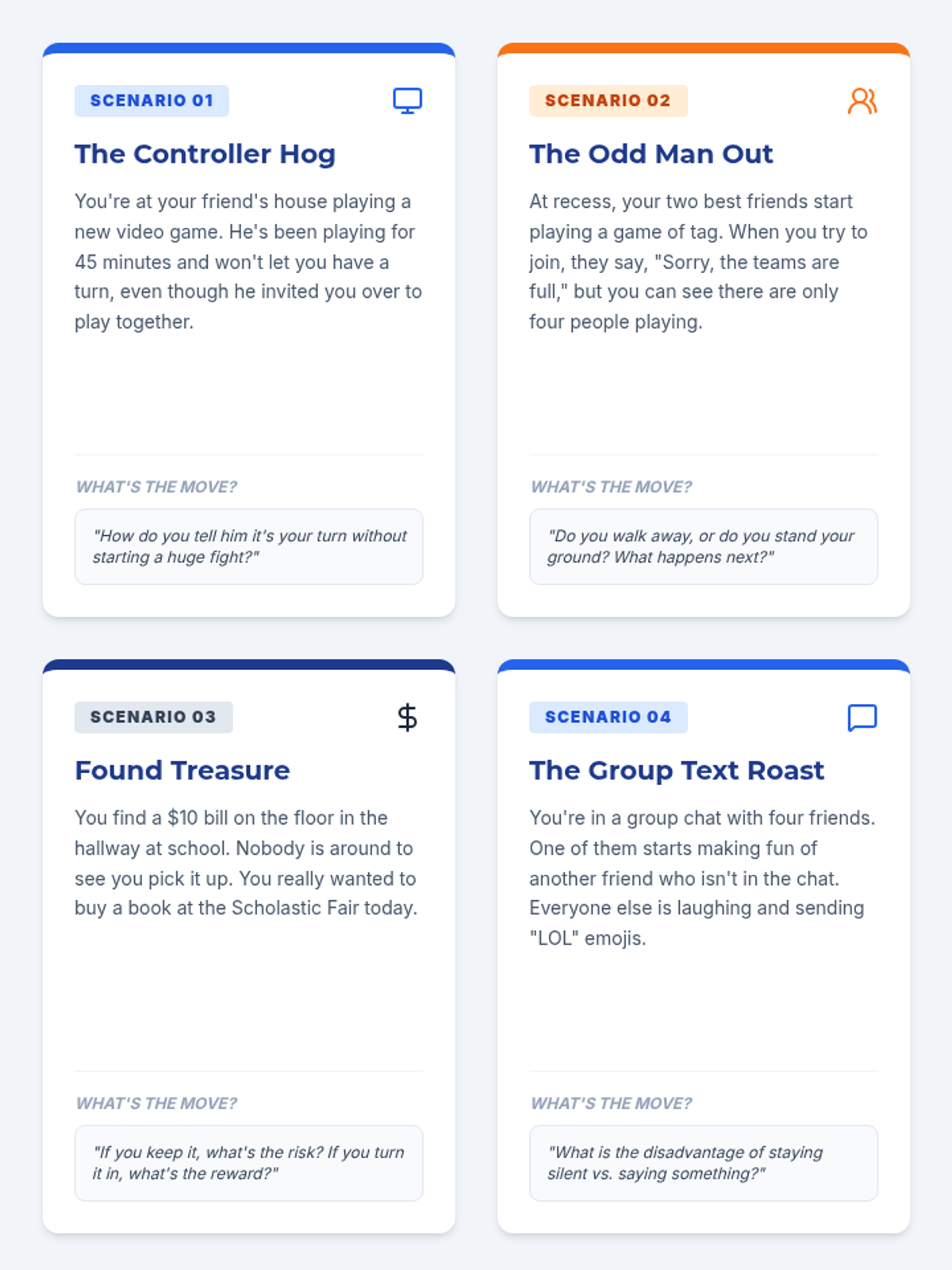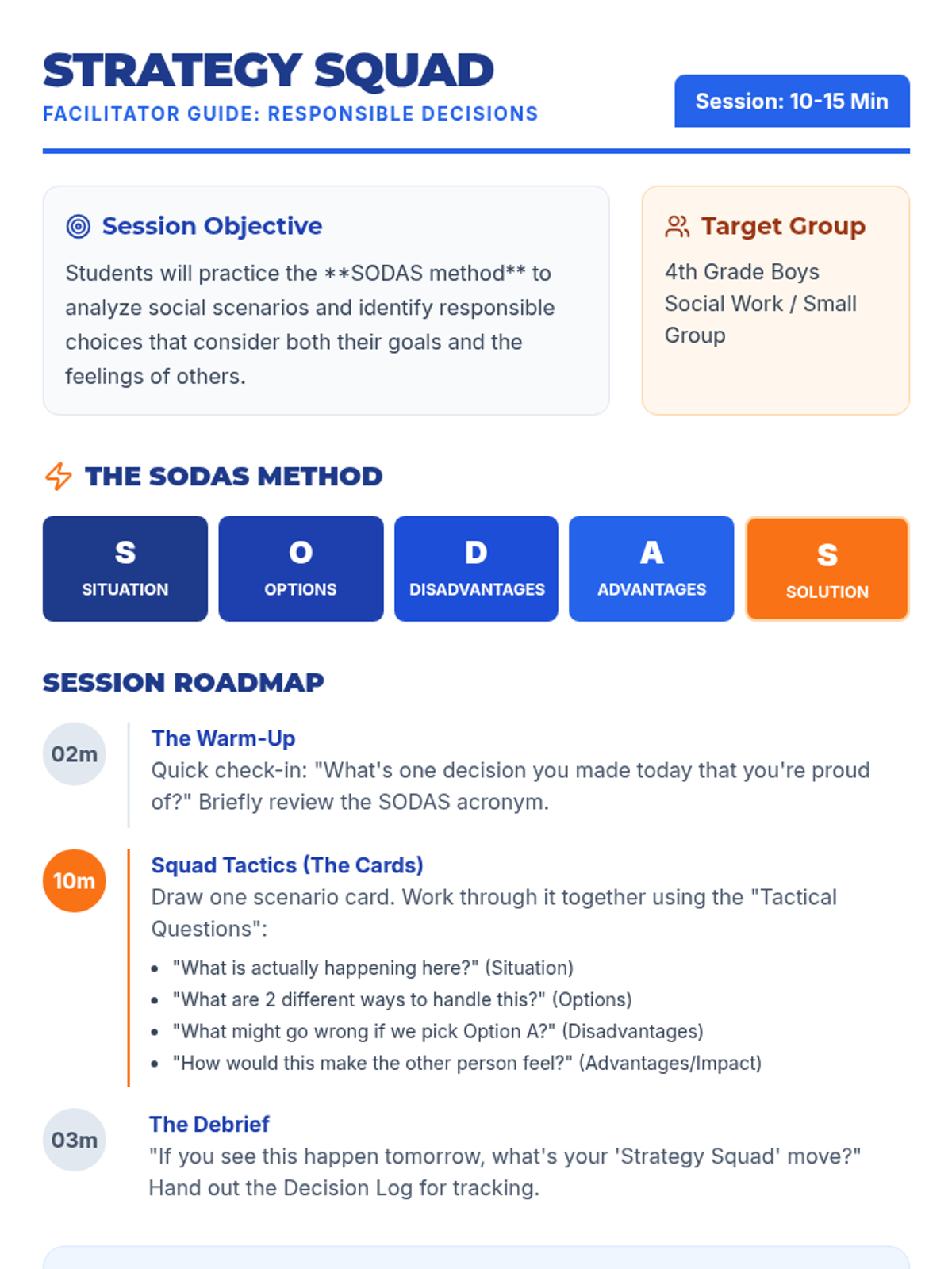 A social work group focused on helping 4th grade boys navigate social challenges using the SODAS problem-solving method. This lesson provides scenarios and discussion prompts to build responsible decision-making skills in a short 10-15 minute format.