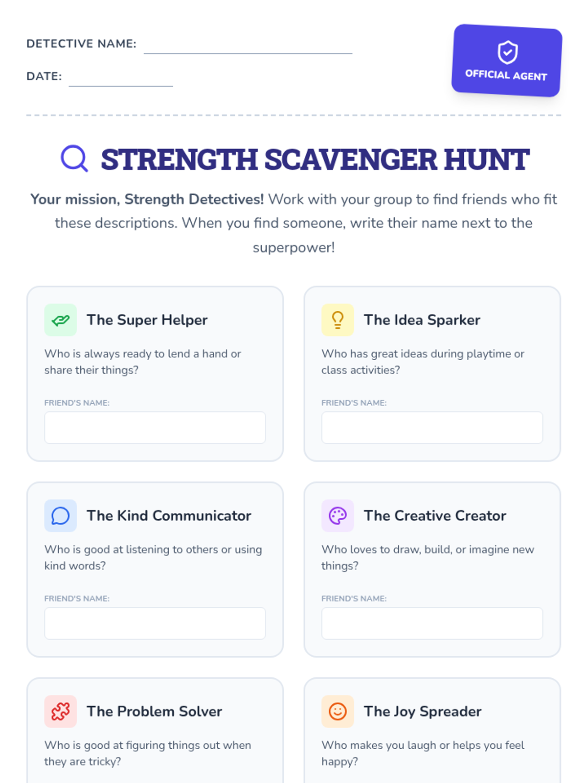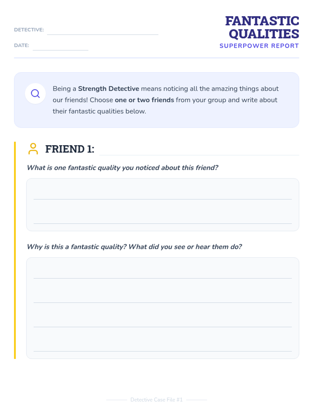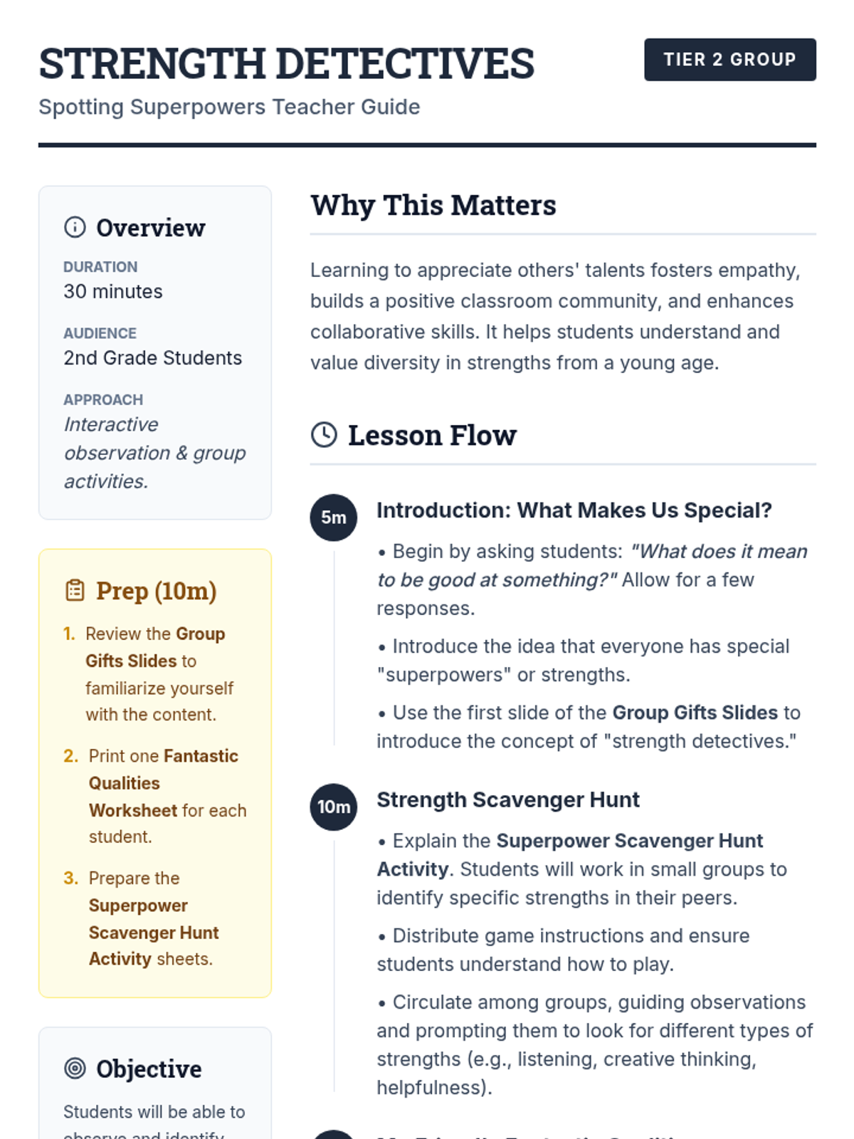 A small group lesson for 2nd graders to help them observe and recognize the unique strengths and positive qualities in their peers, fostering empathy and collaboration.