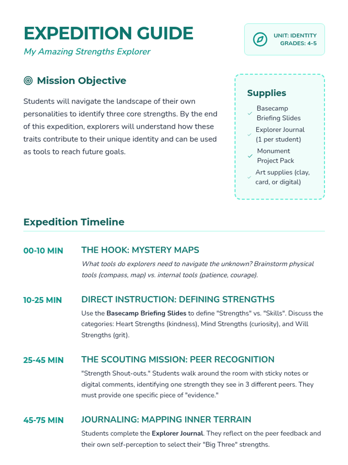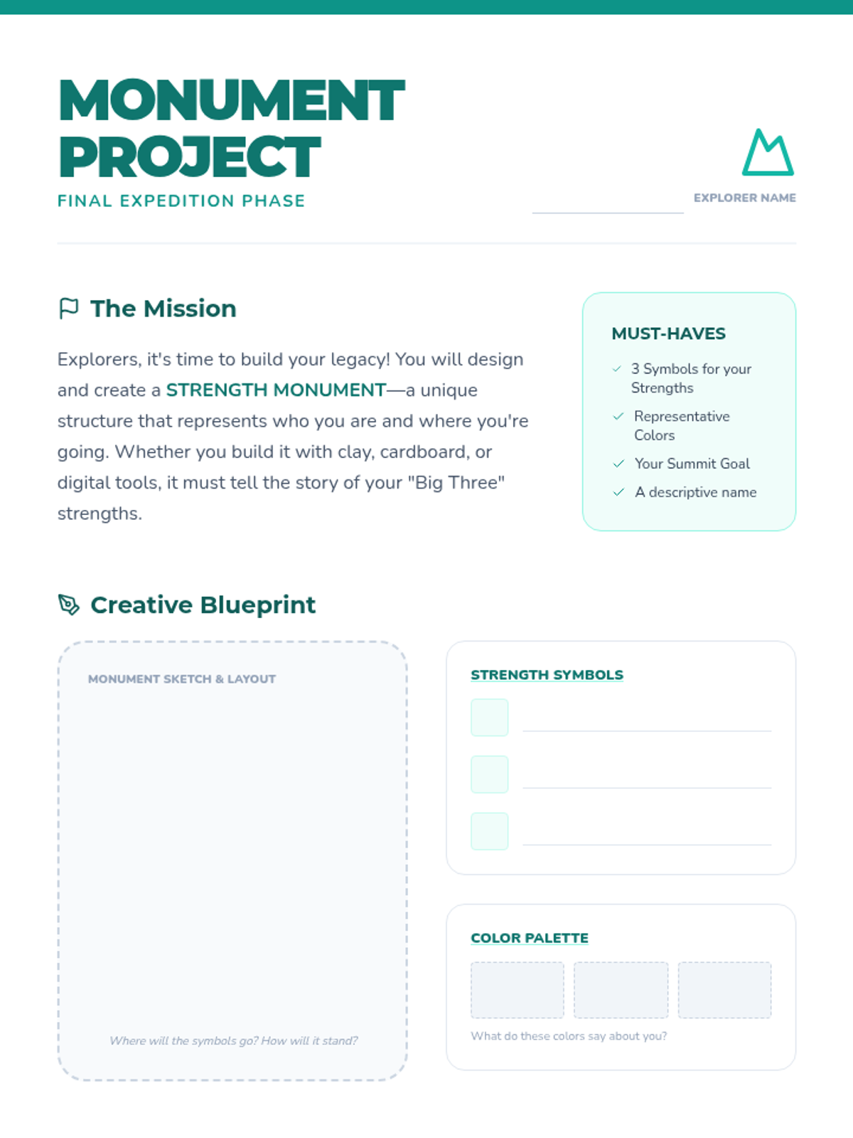 Students embark on a journey of self-discovery to identify their unique personal strengths, explore how these traits shape their identity, and learn to apply them toward achieving future goals through reflection and creative expression.