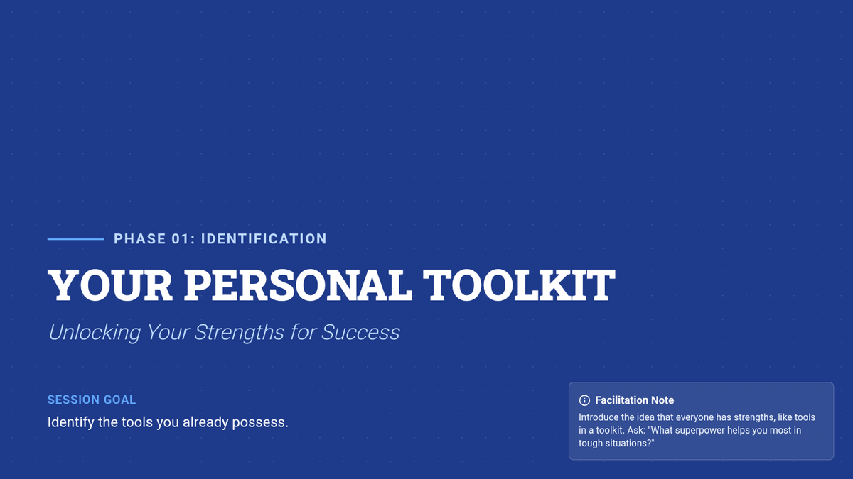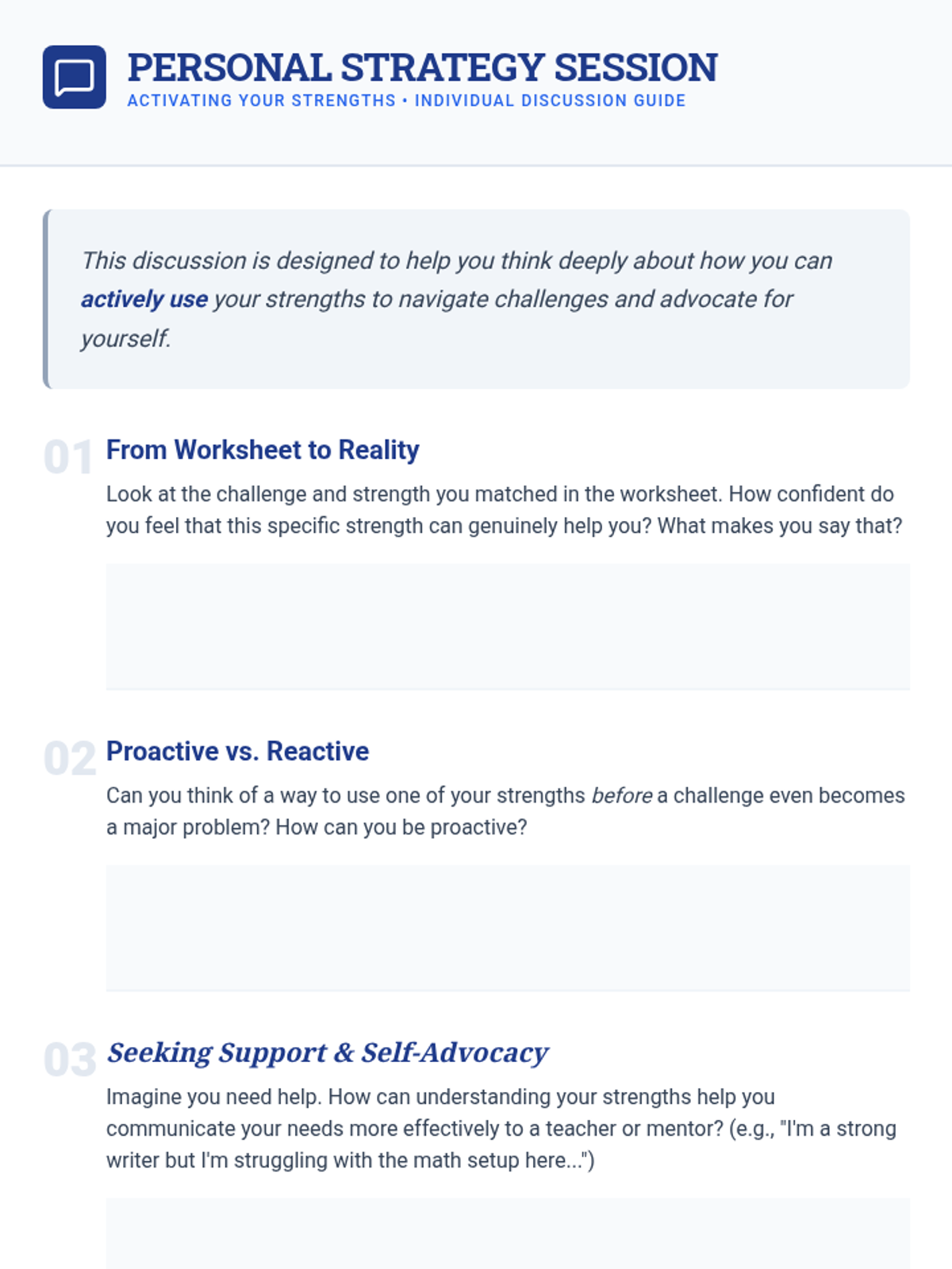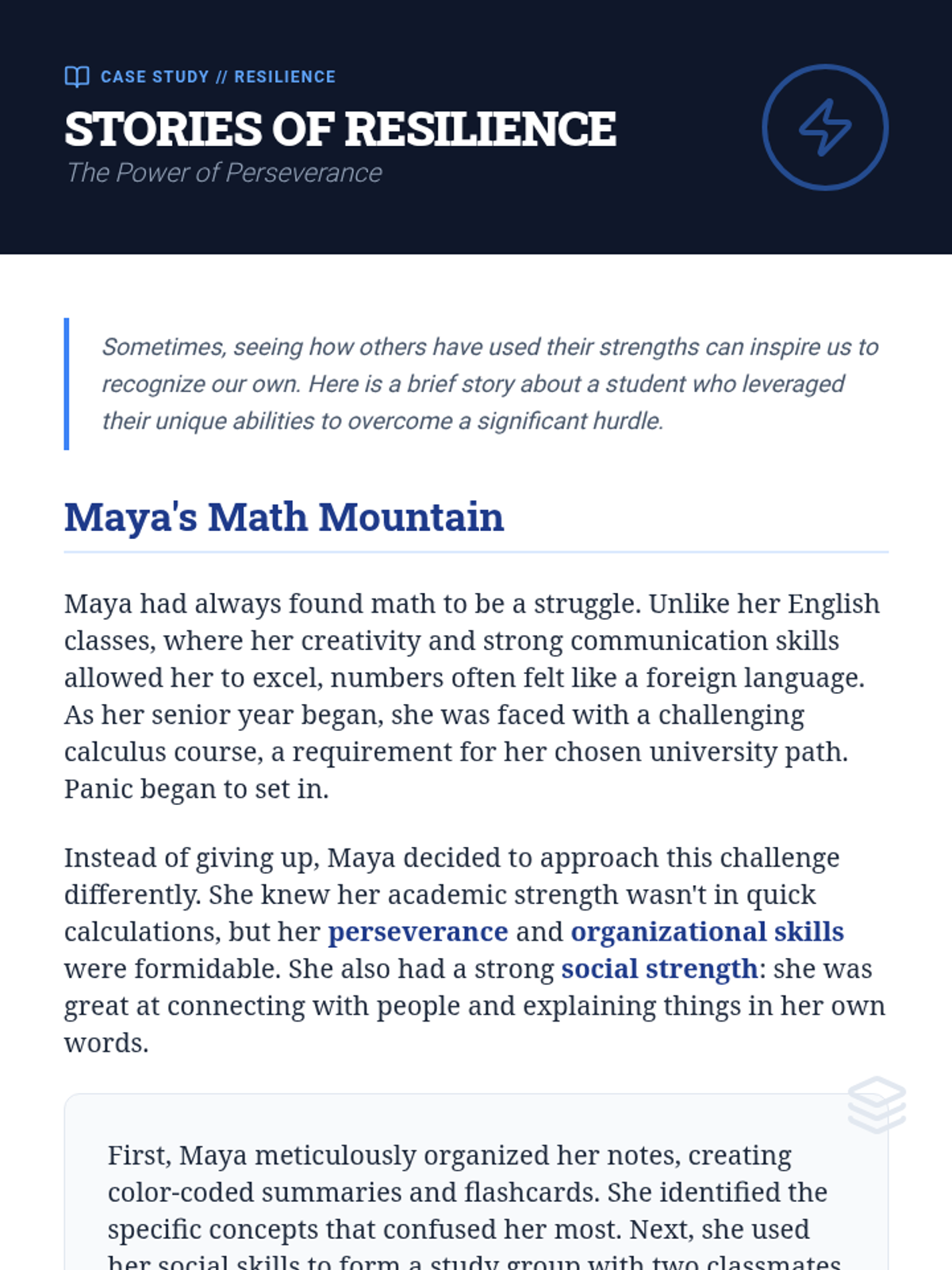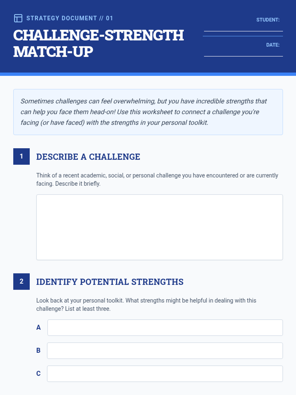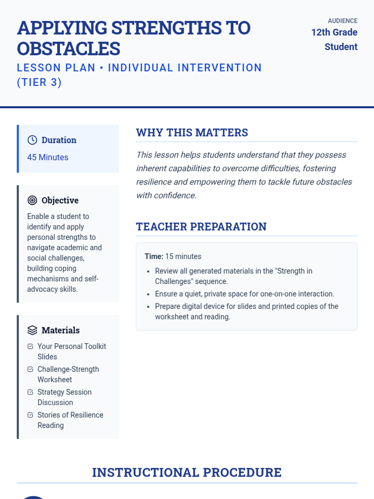 A Tier 3 intervention for 12th graders focused on identifying personal strengths and strategically applying them to academic and social challenges to build resilience and self-advocacy.