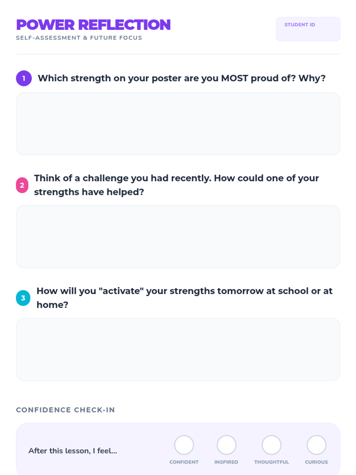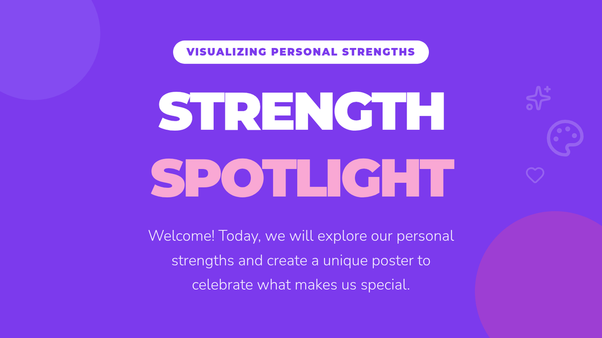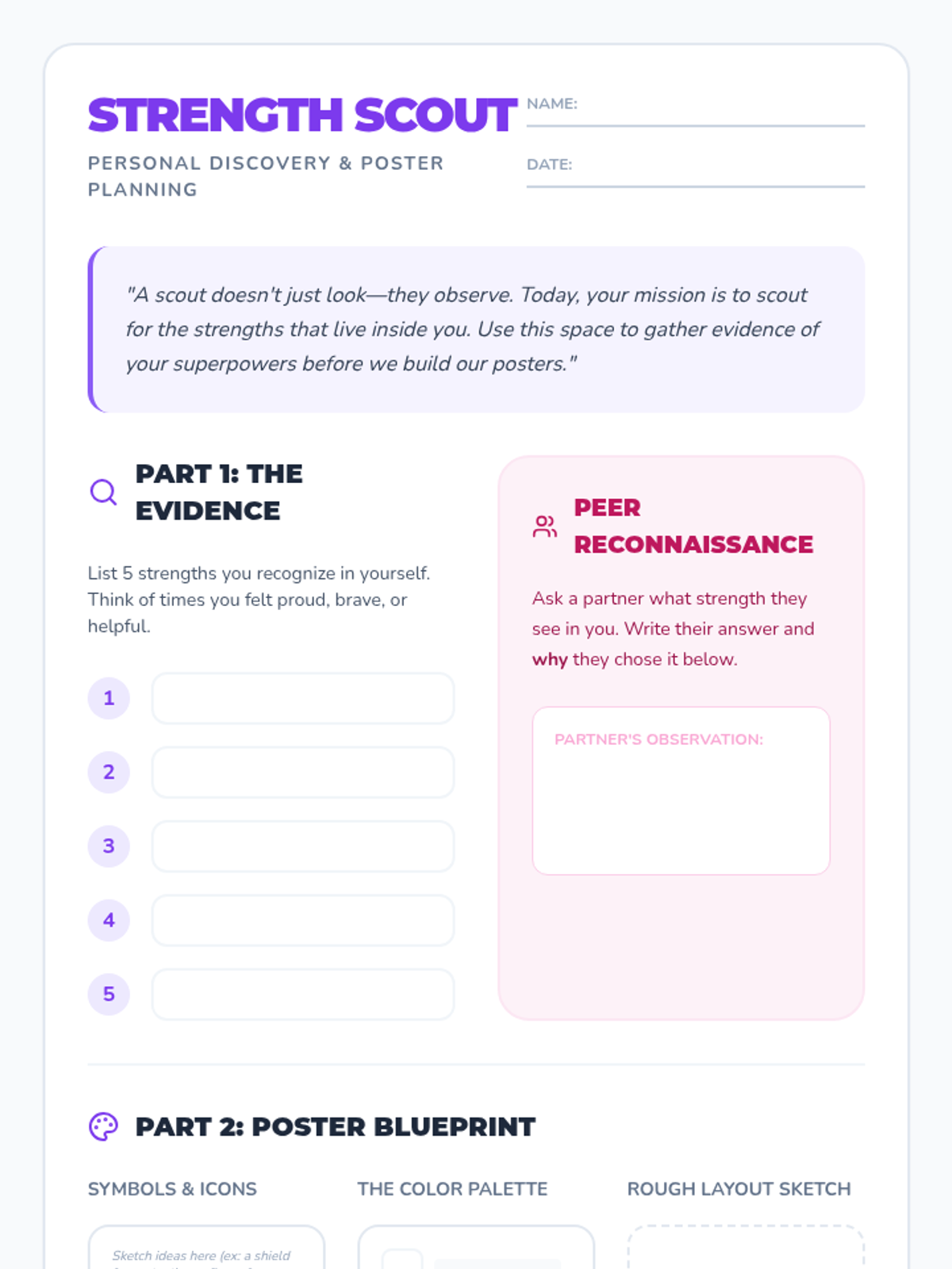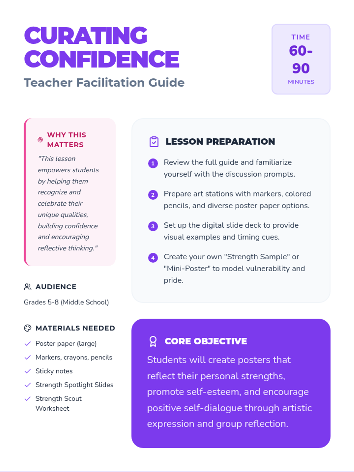 A creative art-based lesson where students identify their personal strengths and visualize them through empowerment posters to build self-esteem and reflection.