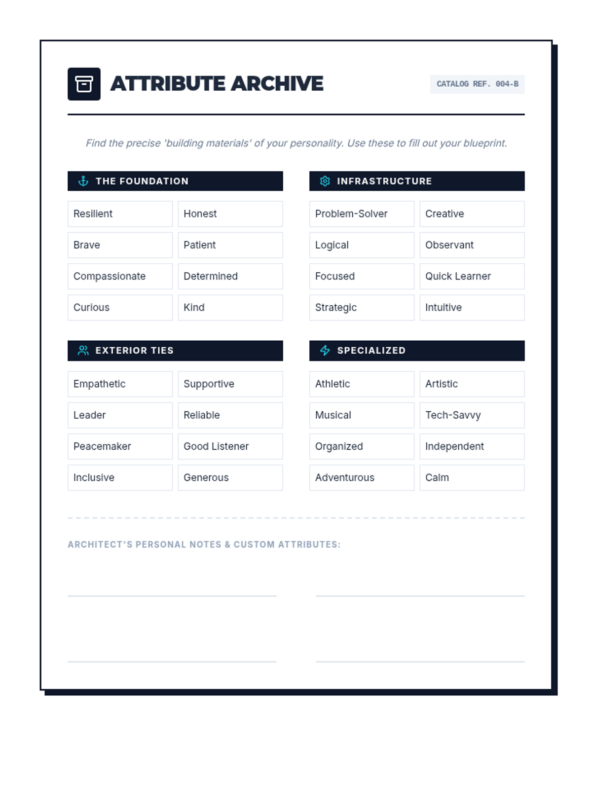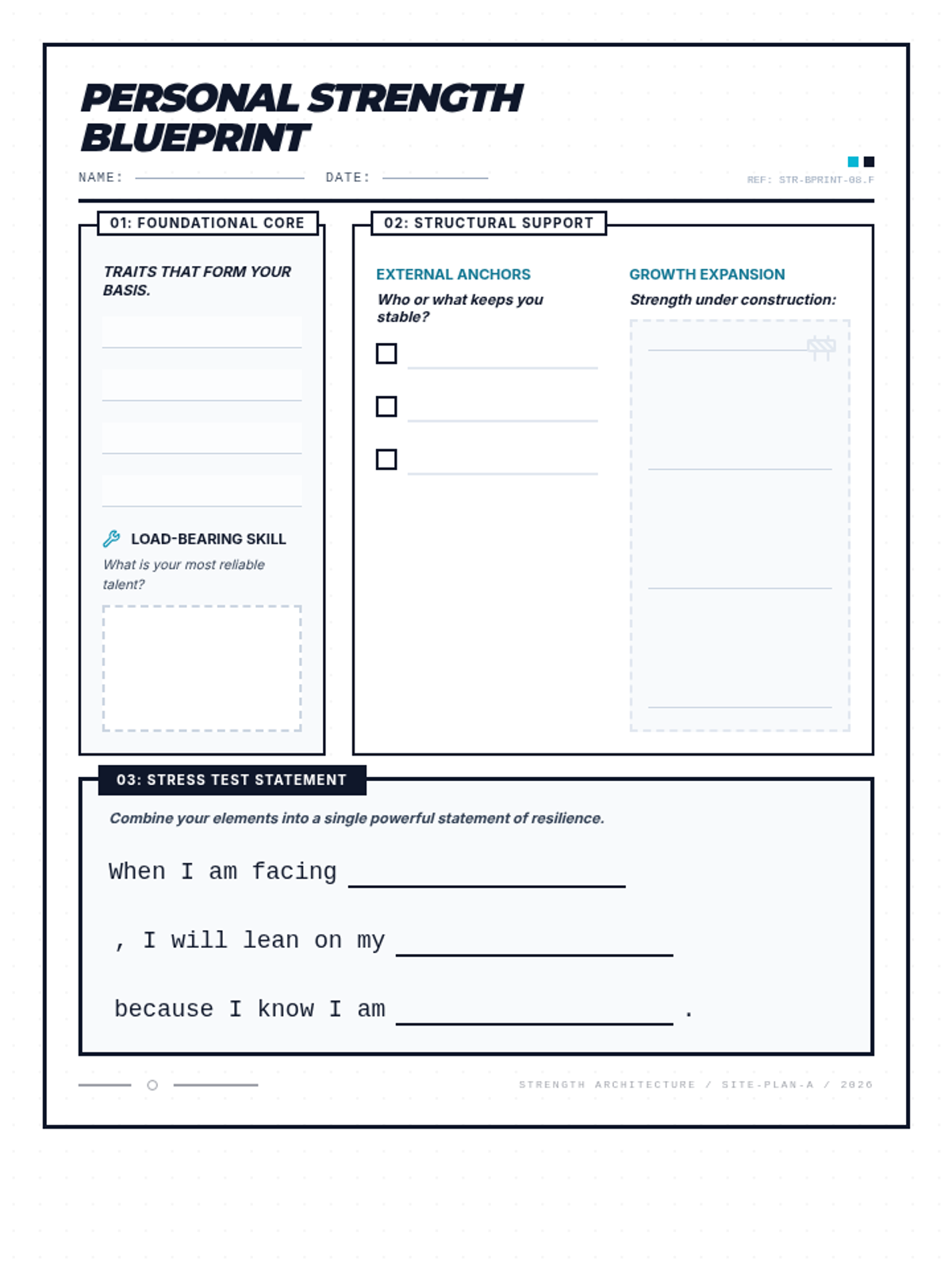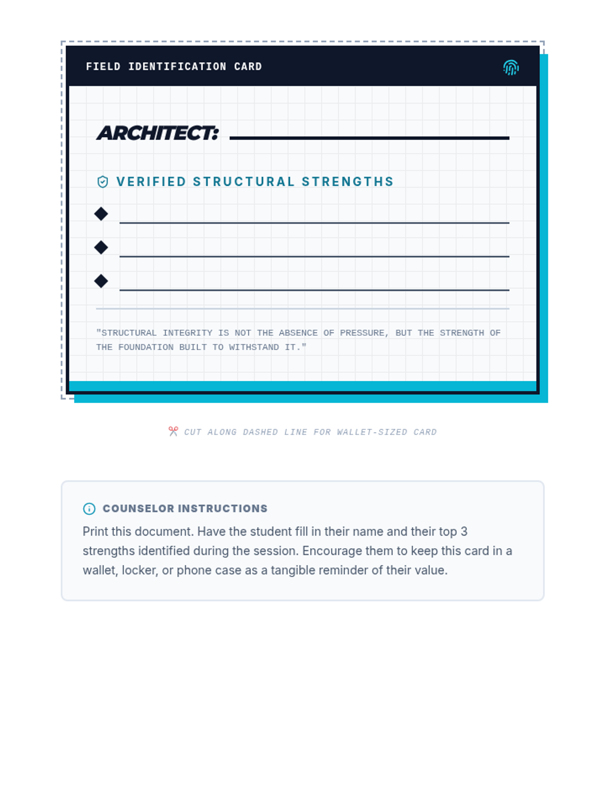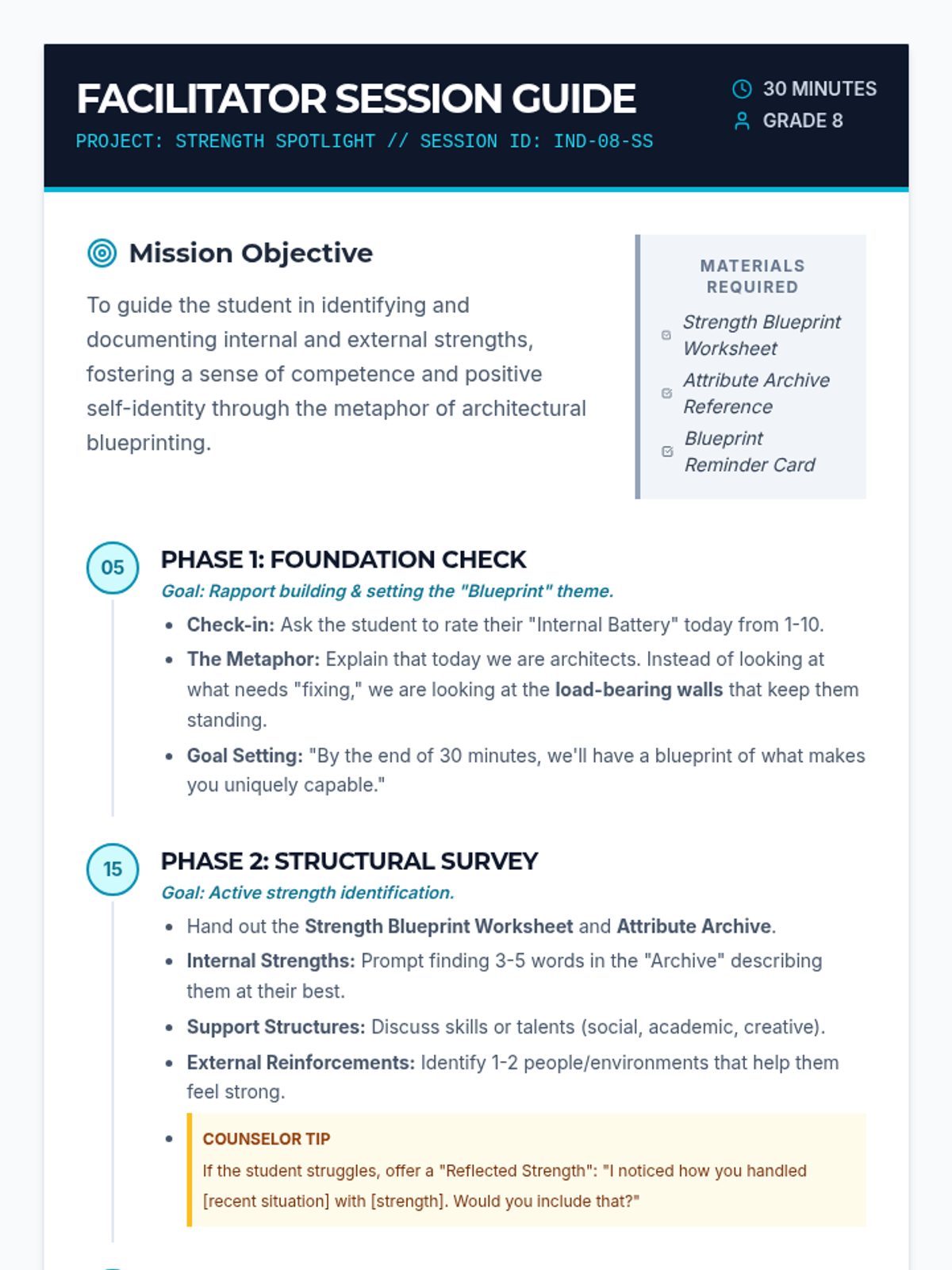 A focused 30-minute individual counseling session designed to help 8th-grade students identify and celebrate their personal strengths through a creative blueprint-themed approach.