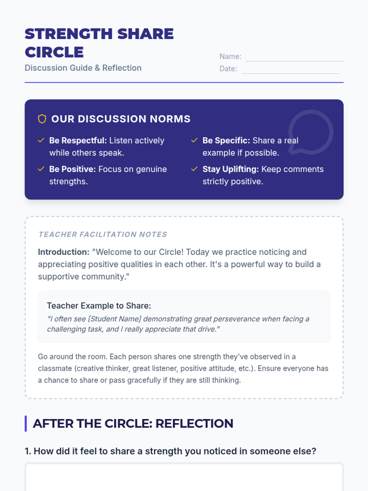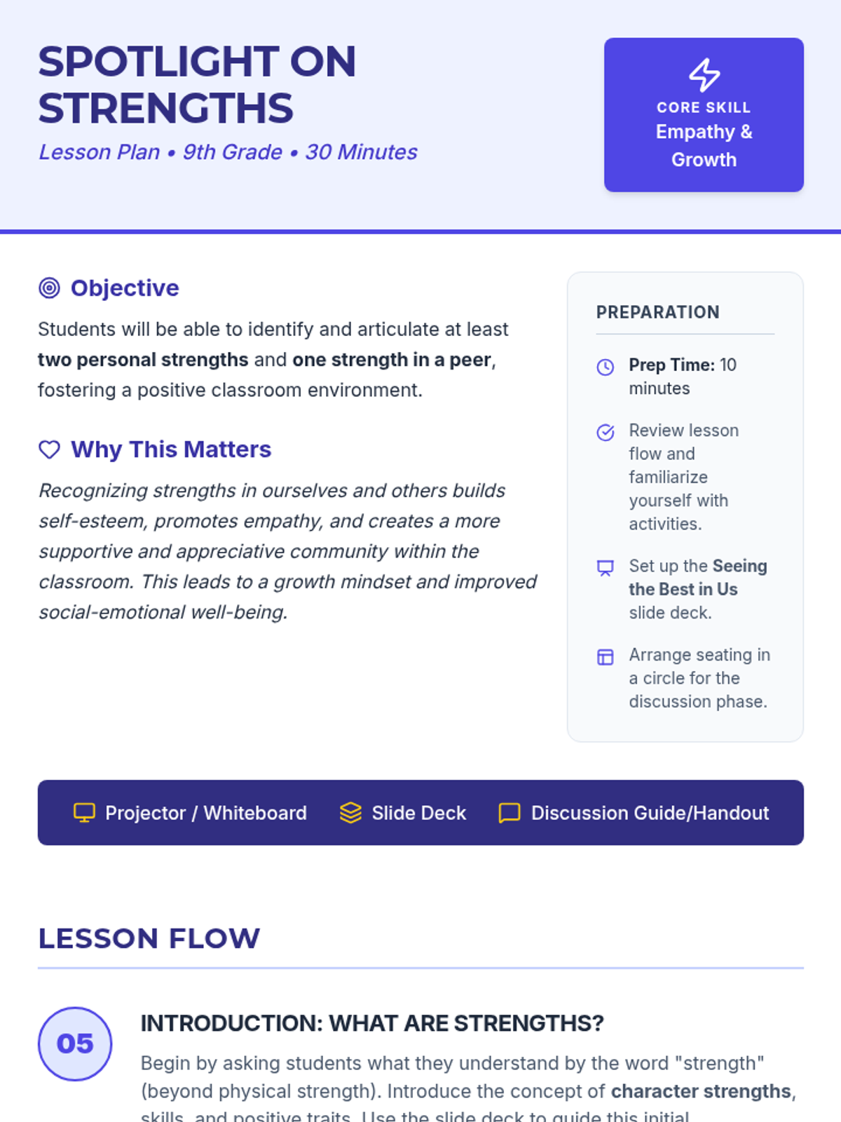 A 30-minute lesson for 9th graders focused on identifying character strengths in themselves and their peers to build empathy and a positive classroom culture.