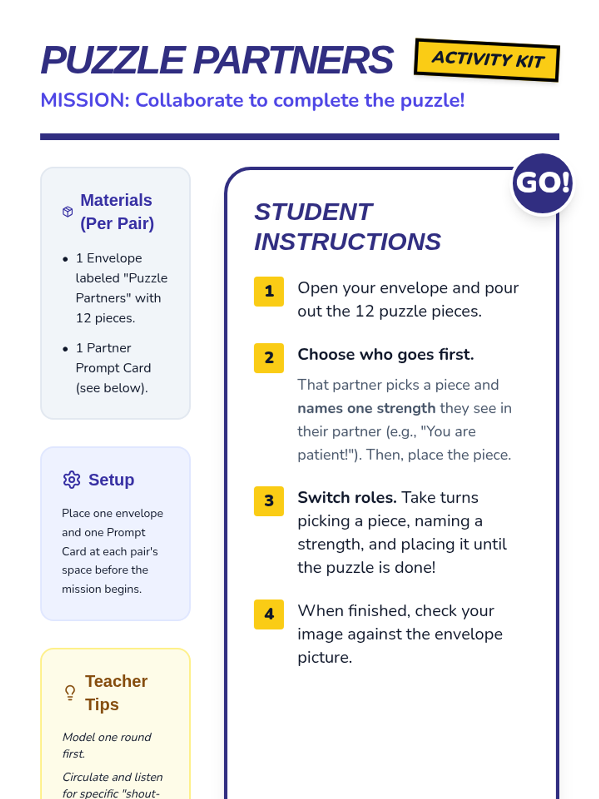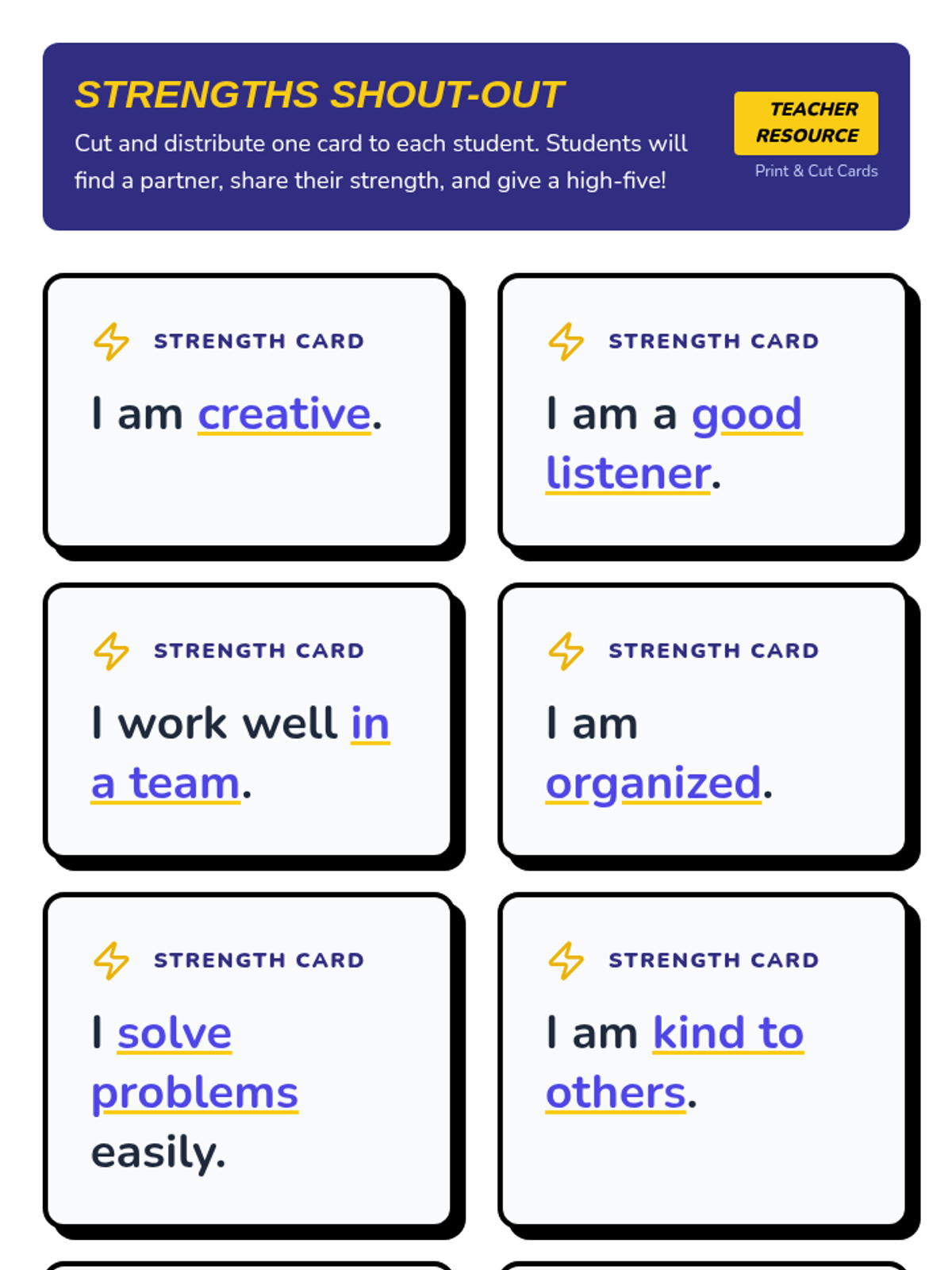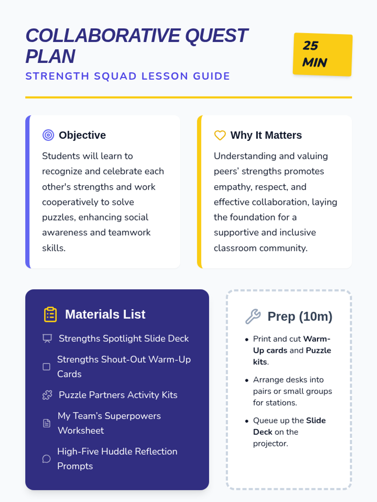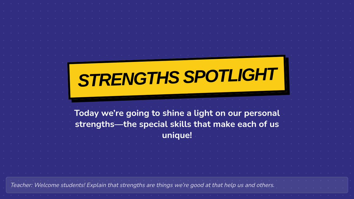 In this 25-minute Tier 1 lesson for 3rd graders, students will learn to identify peers’ strengths and collaborate effectively on a shared goal to build social awareness. Through engaging activities, students practice recognizing and valuing each other’s skills, fostering a positive classroom community.