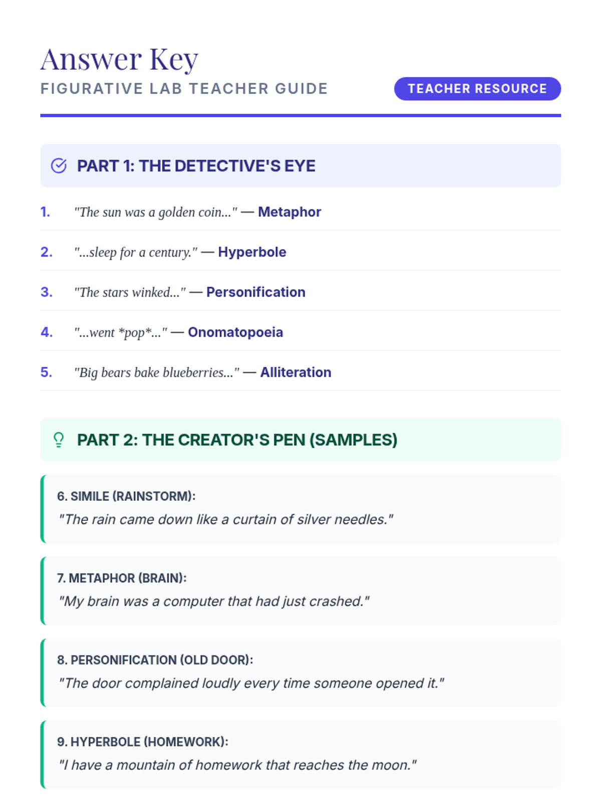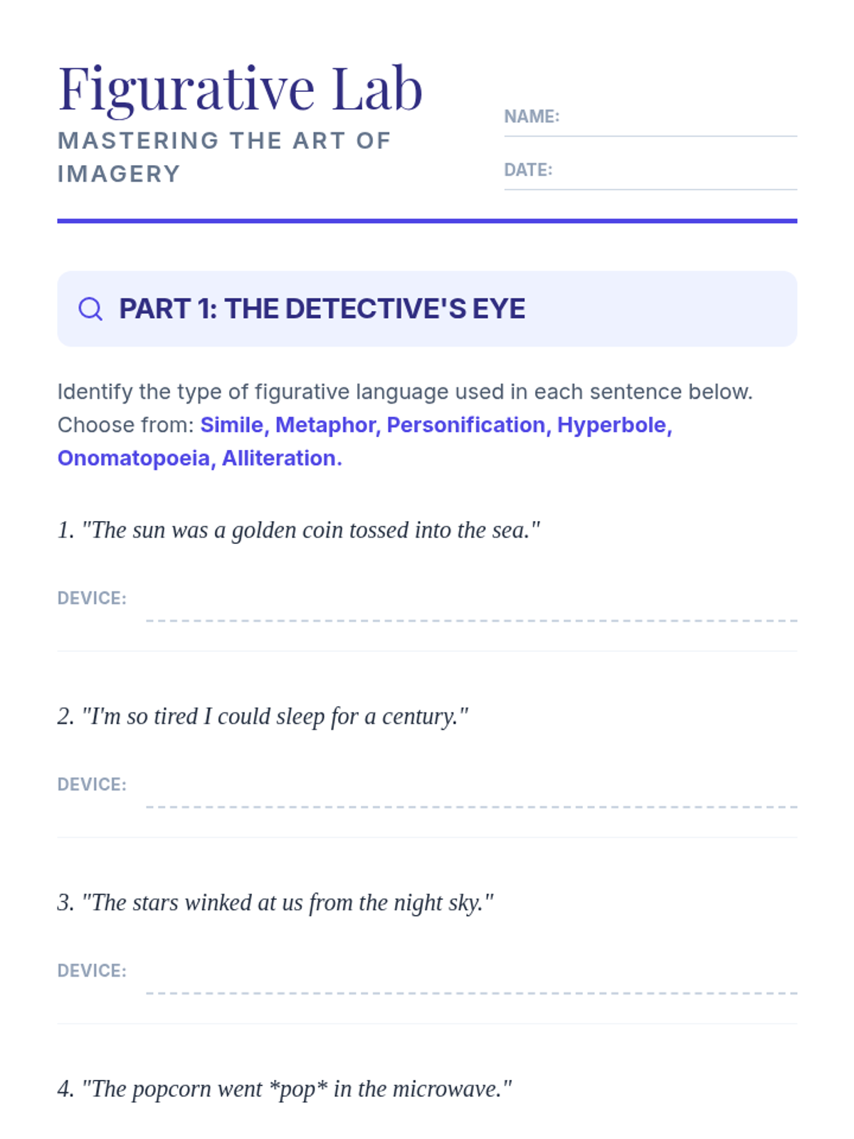 An introductory lesson covering the primary types of figurative language with integrated reading passages and creative writing exercises.