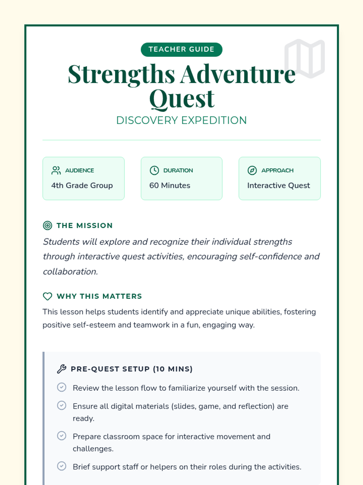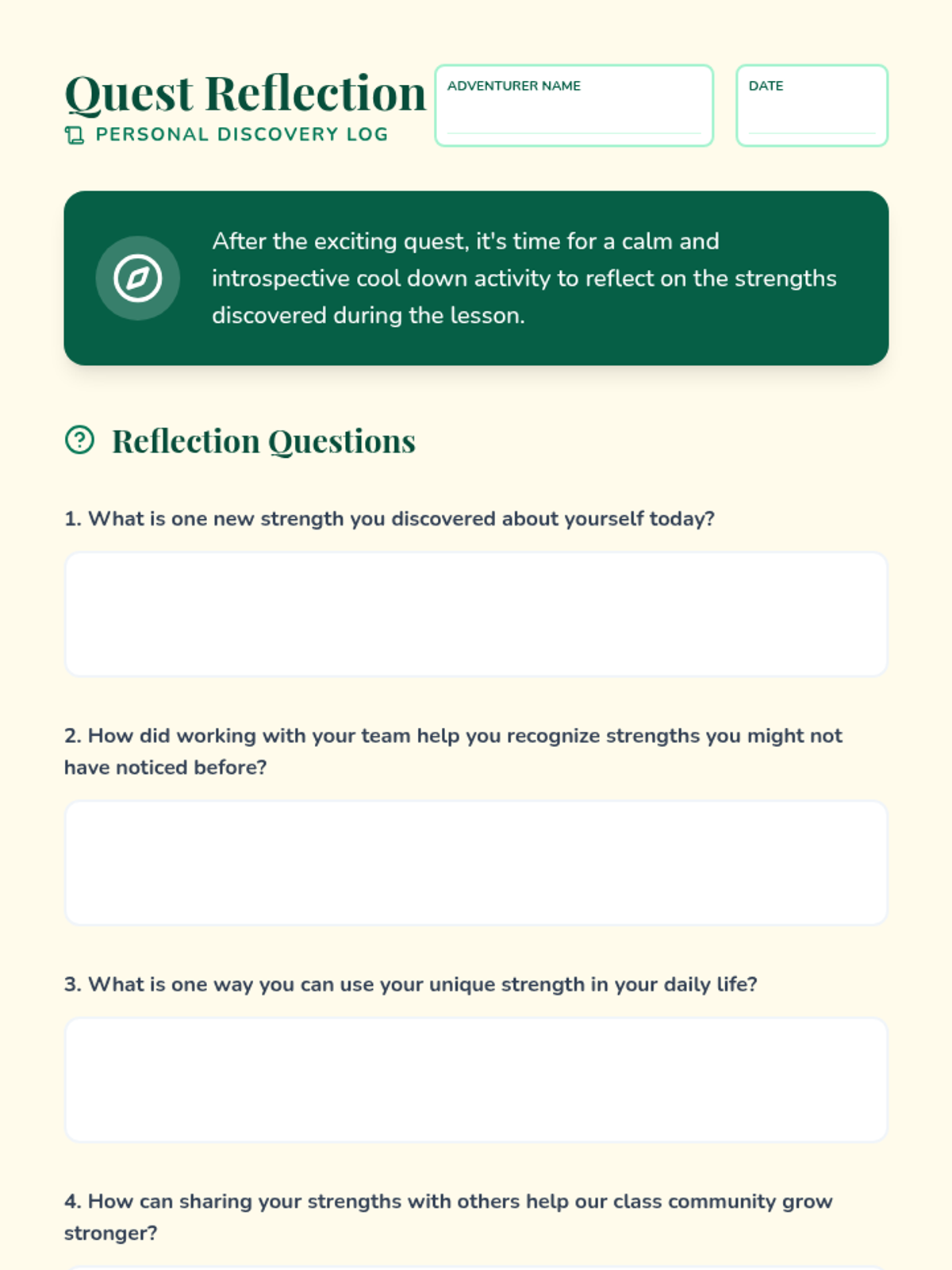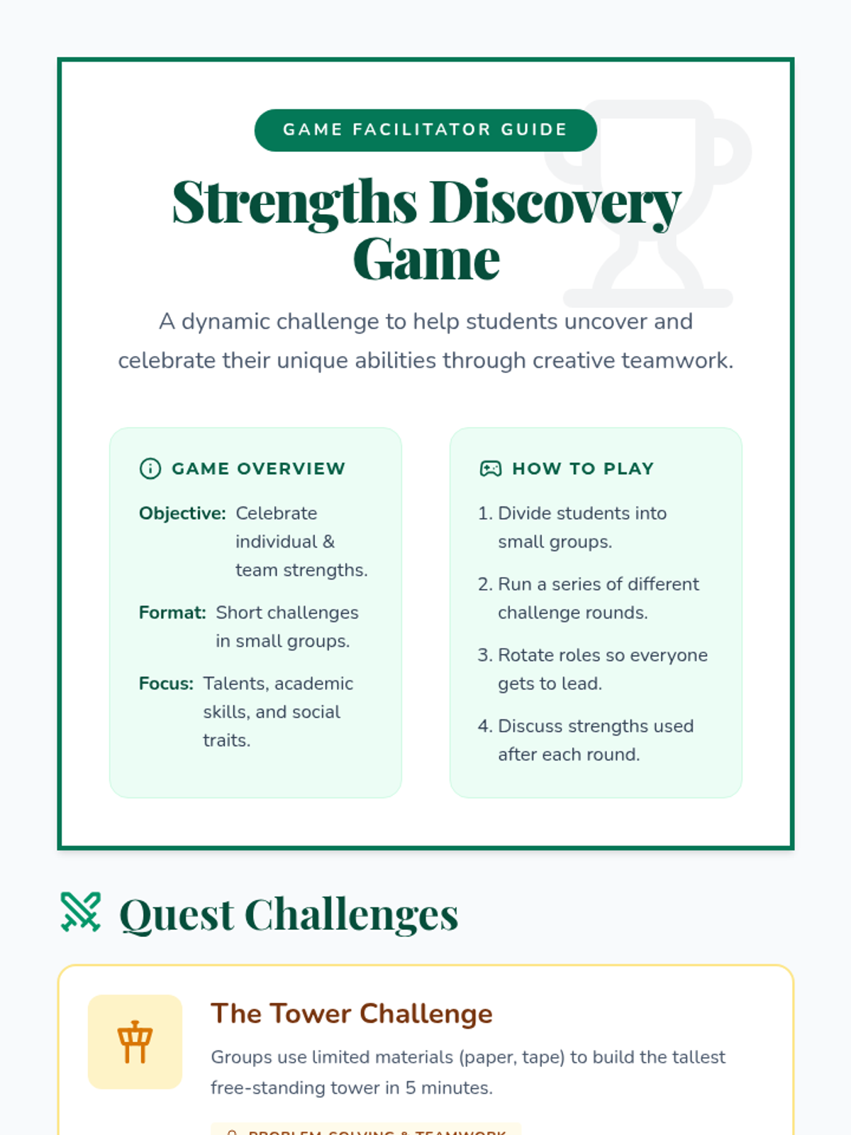 A 60-minute interactive quest where students discover their personal and team strengths through games and reflection.