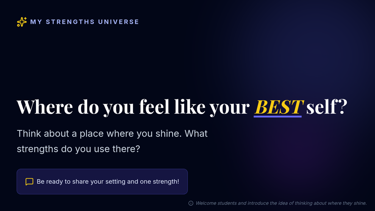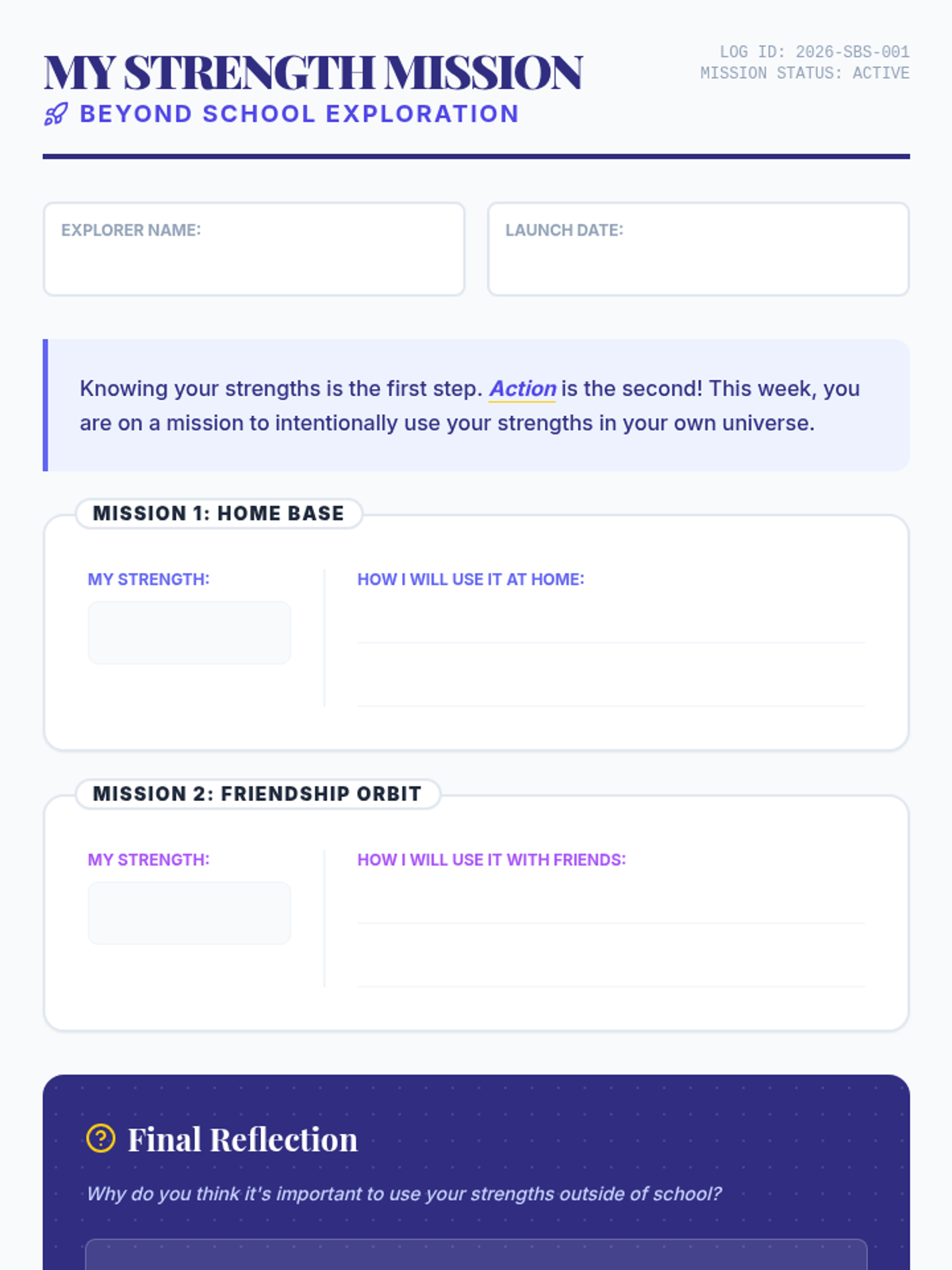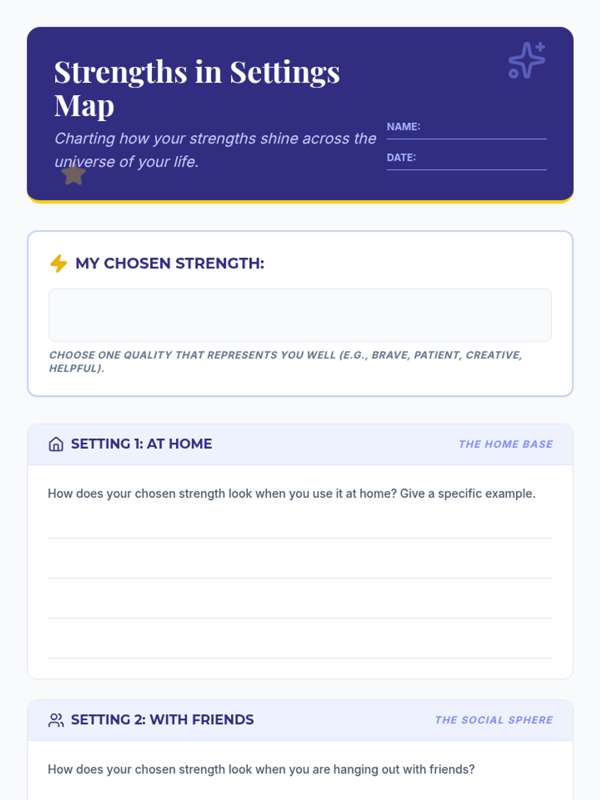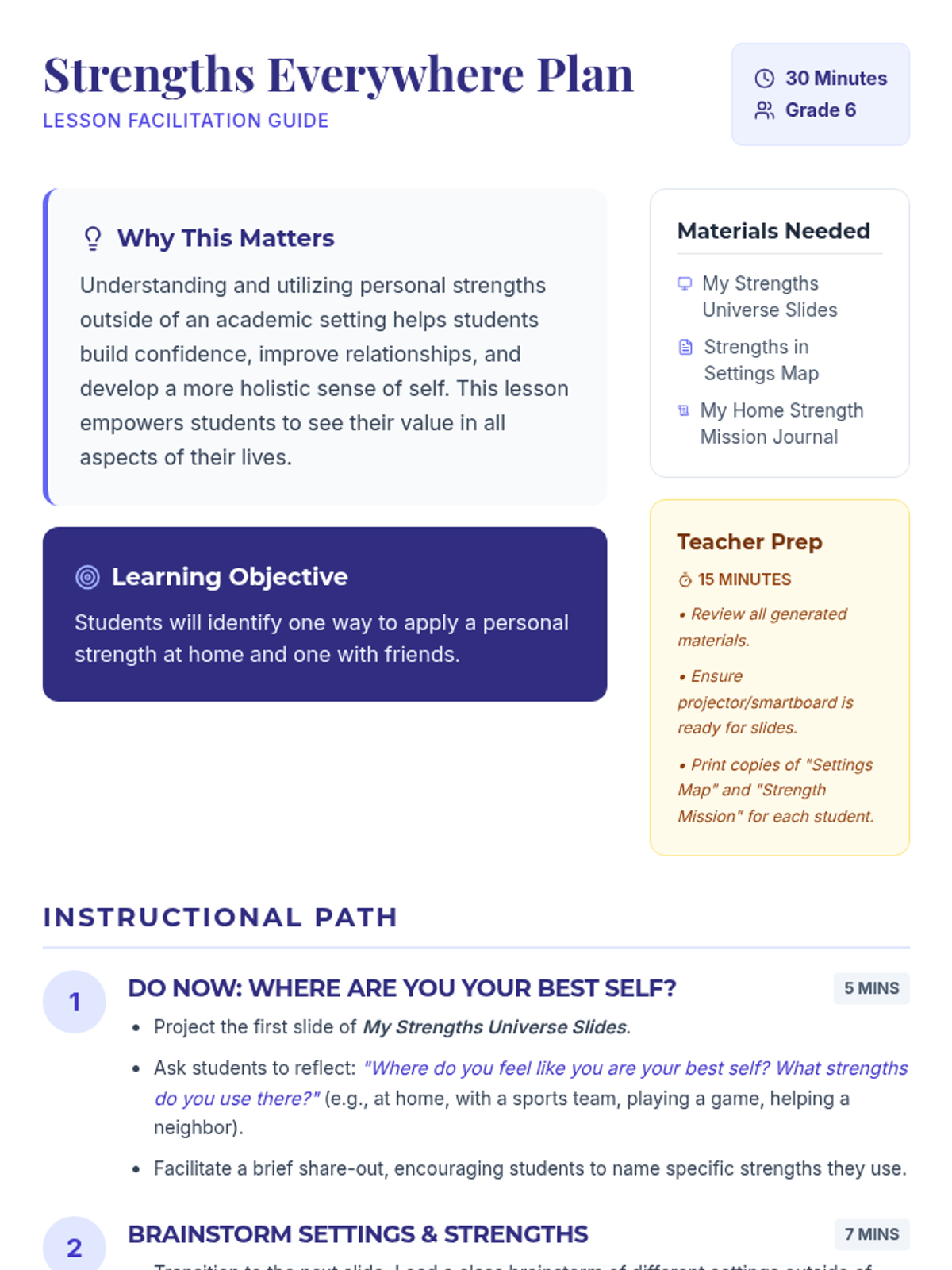 This lesson helps 6th-grade students recognize and apply their personal strengths in various contexts outside of school, fostering self-awareness and stronger relationships. Students will identify one way to apply a personal strength at home and one with friends.