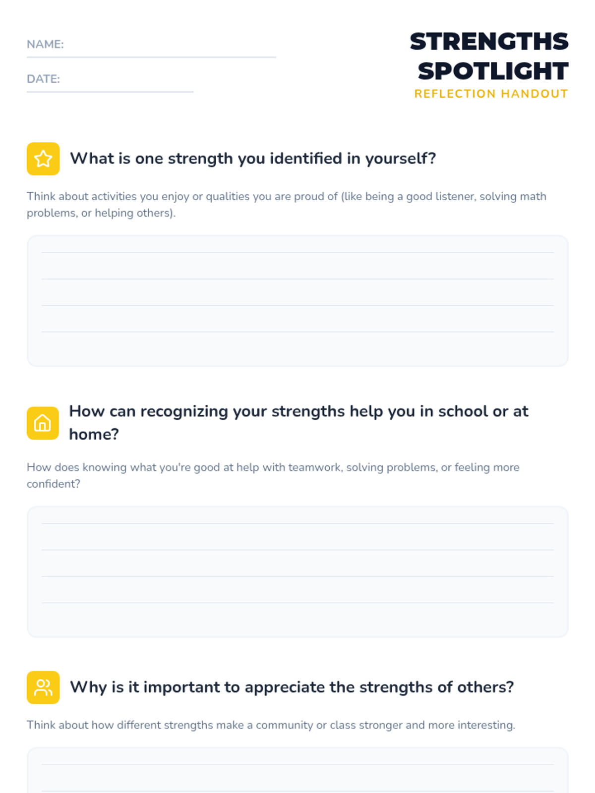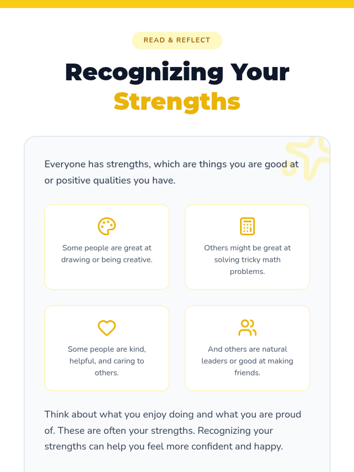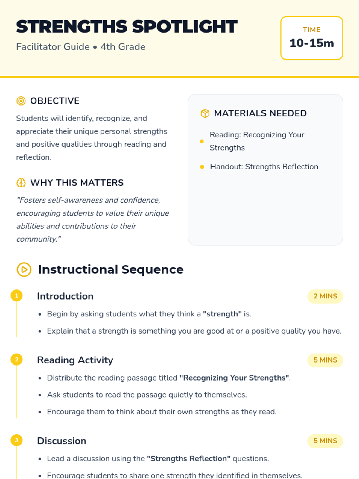 A quick, 10-15 minute activity designed to help 4th graders identify, appreciate, and share their unique personal strengths and positive qualities.