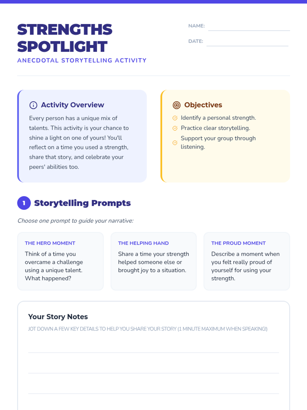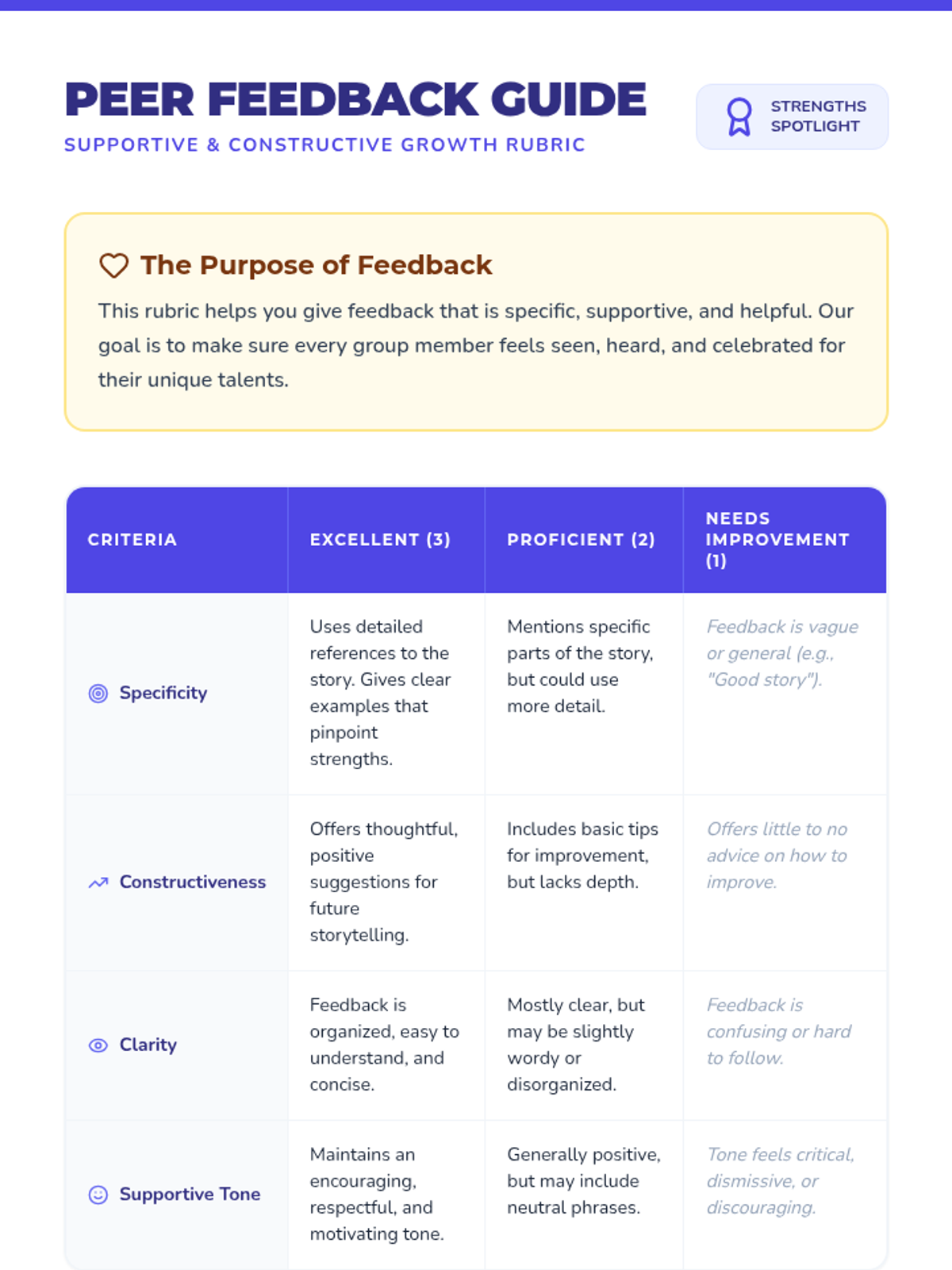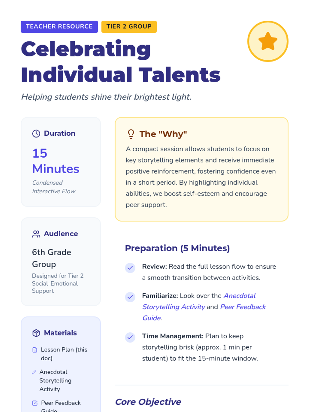 A Tier 2 small group session designed to help 6th-grade students identify and celebrate their personal strengths through storytelling and structured peer feedback. This 15-minute condensed lesson builds confidence and fosters a supportive peer community.