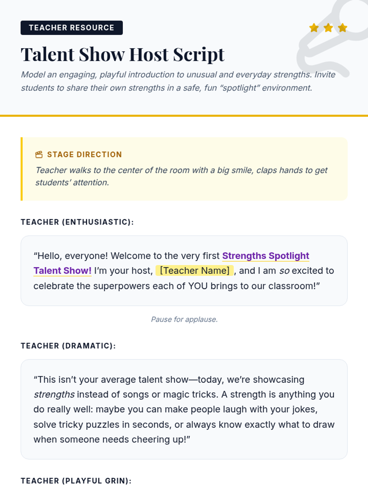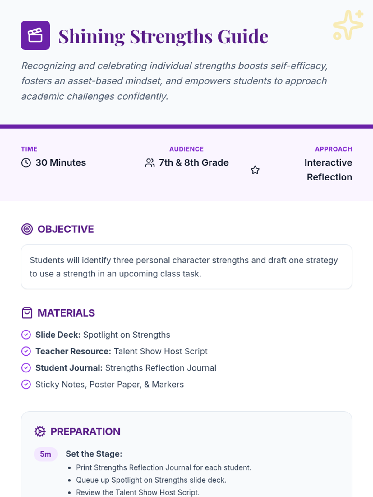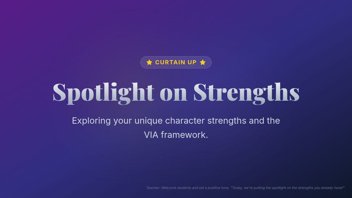 A dynamic 30-minute lesson where 7th & 8th graders discover their unique character strengths through a theatrical 'talent show' lens, learning how to leverage their best traits for academic success.