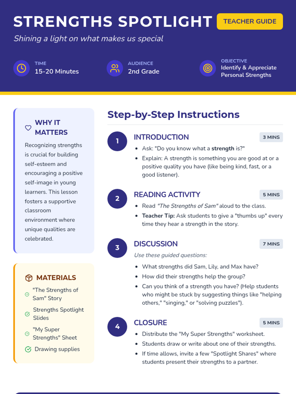 A 2nd-grade social-emotional learning lesson focused on identifying personal strengths and appreciating the unique qualities of others through storytelling and discussion.