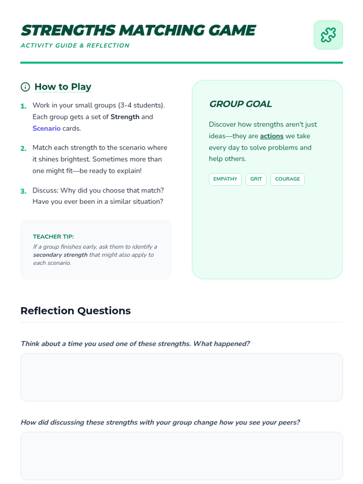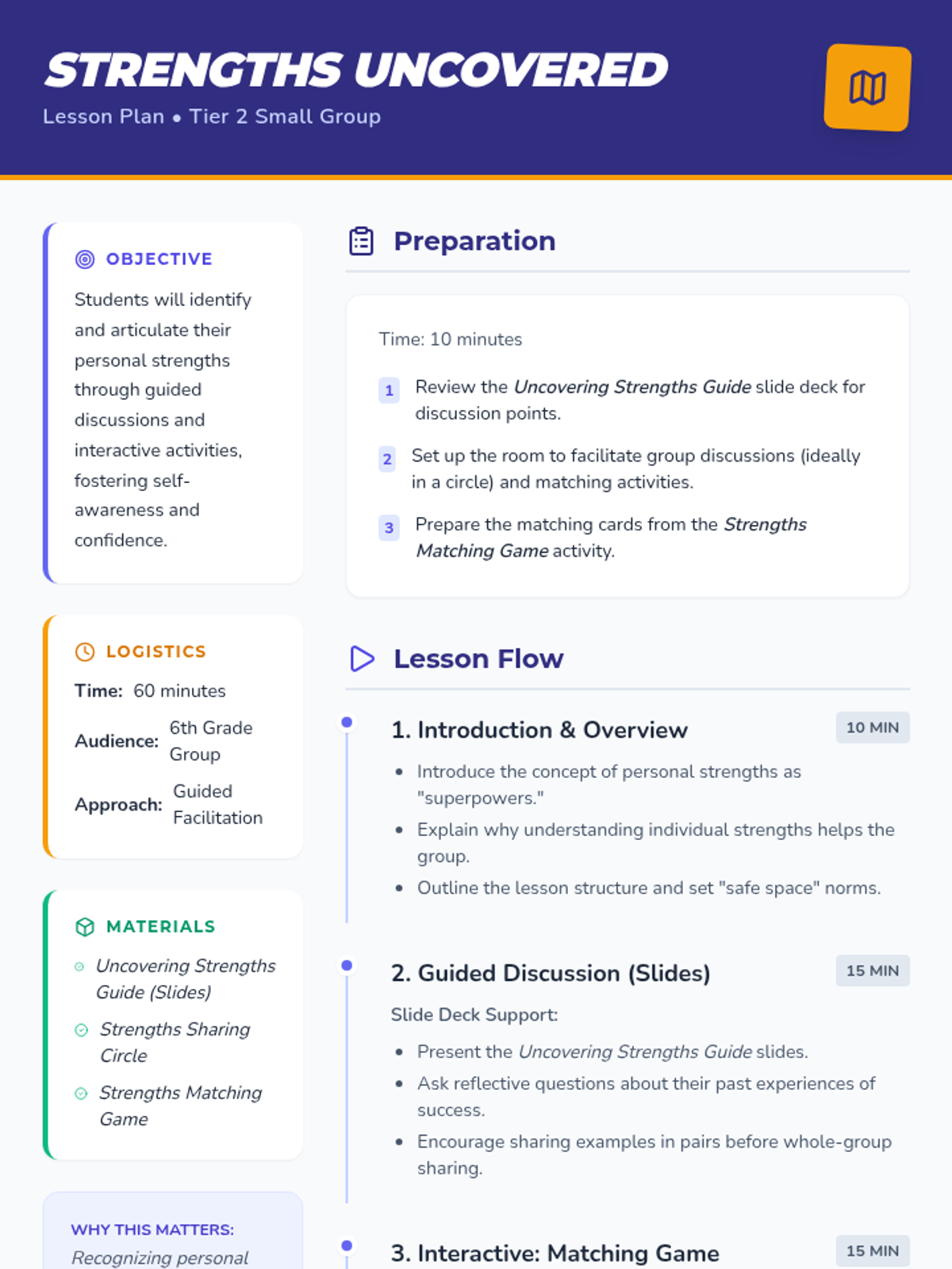 A Tier 2 small group lesson designed to help 6th-grade students identify, articulate, and celebrate their personal strengths through guided discussion and interactive activities.
