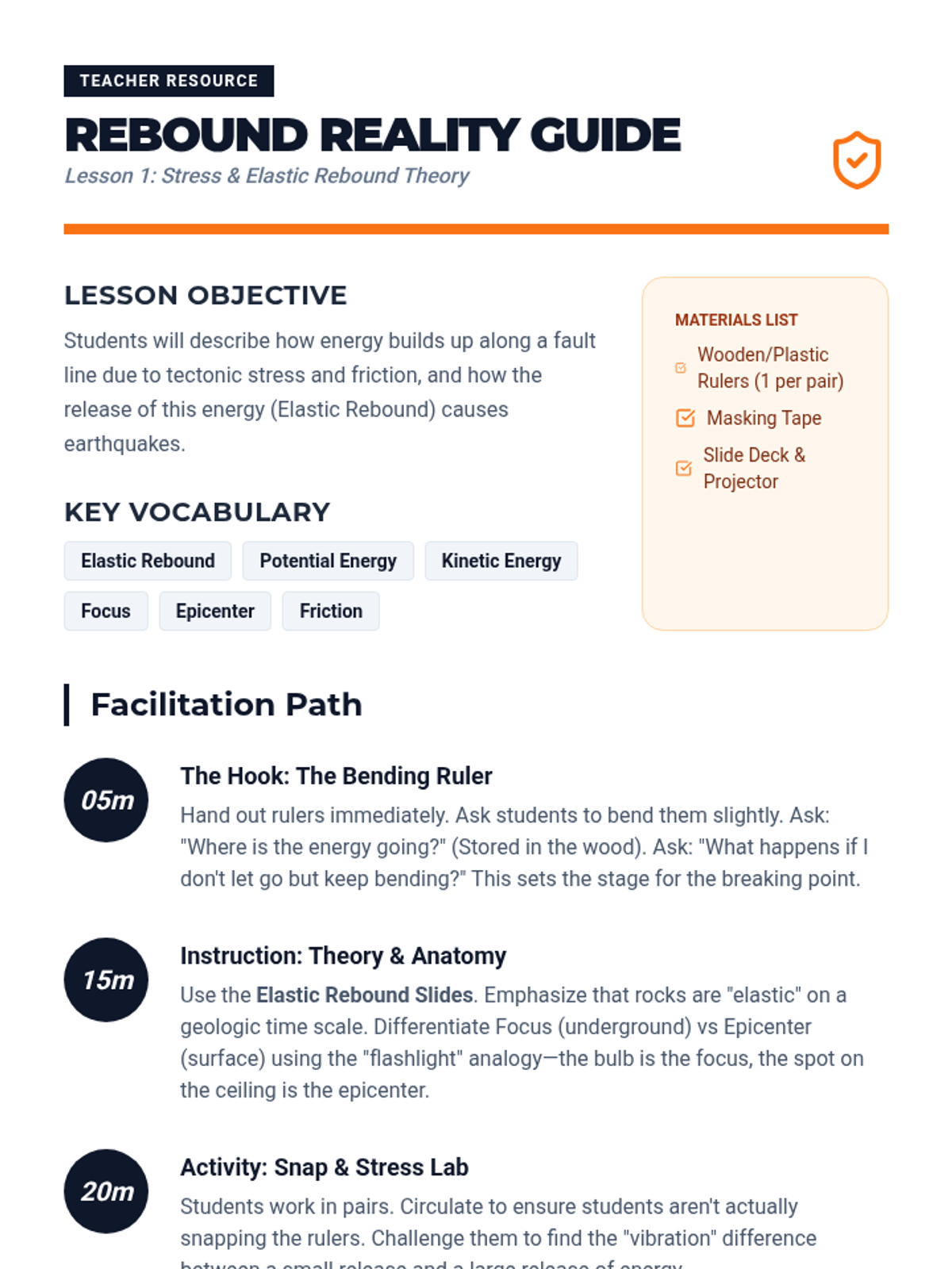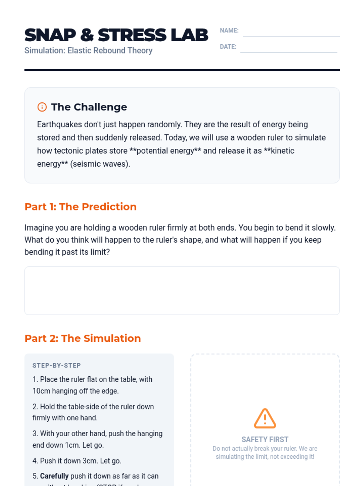 Students explore the elastic rebound theory using hands-on simulations to understand how potential energy builds up along fault lines and is suddenly released as kinetic energy.