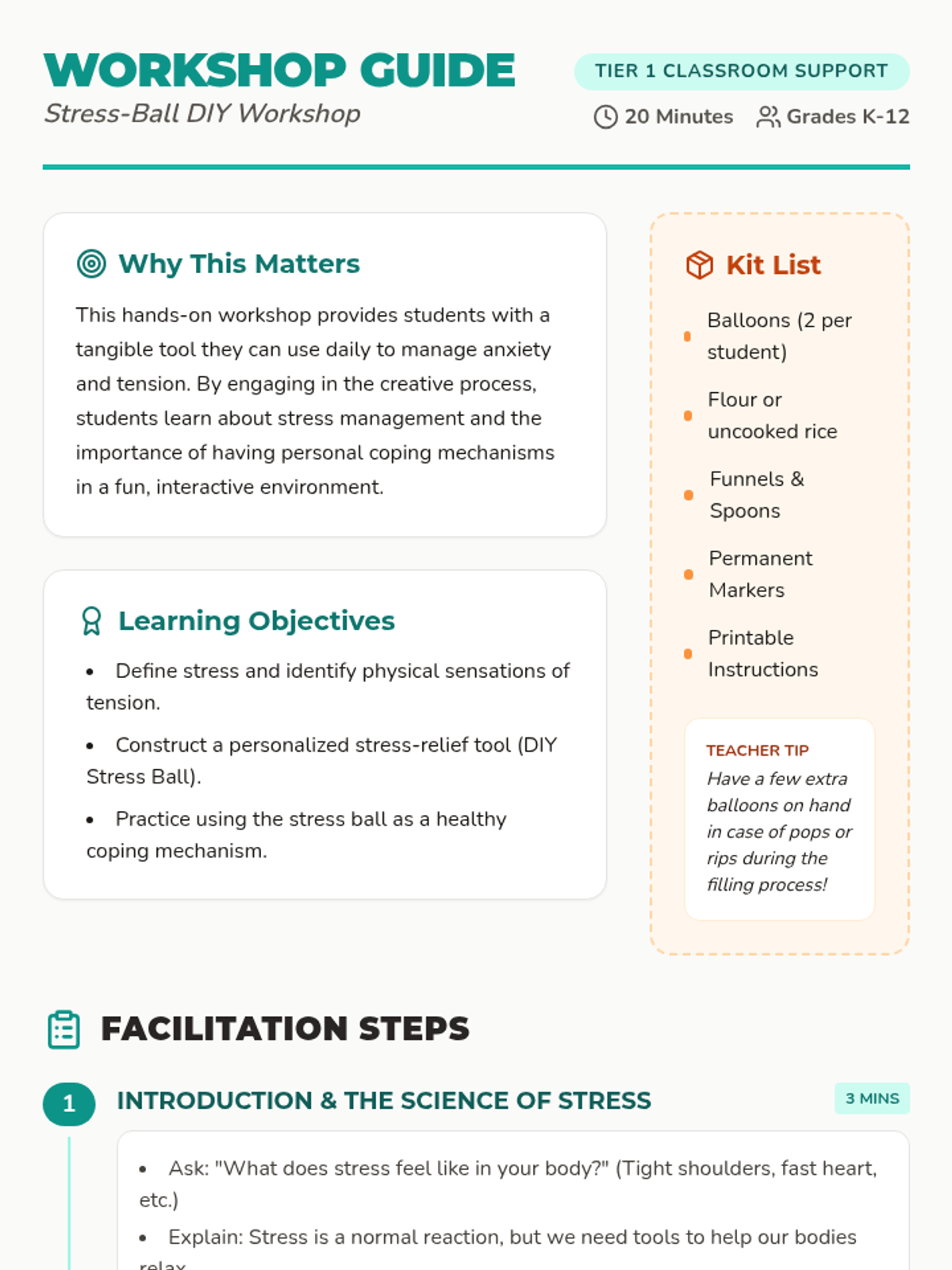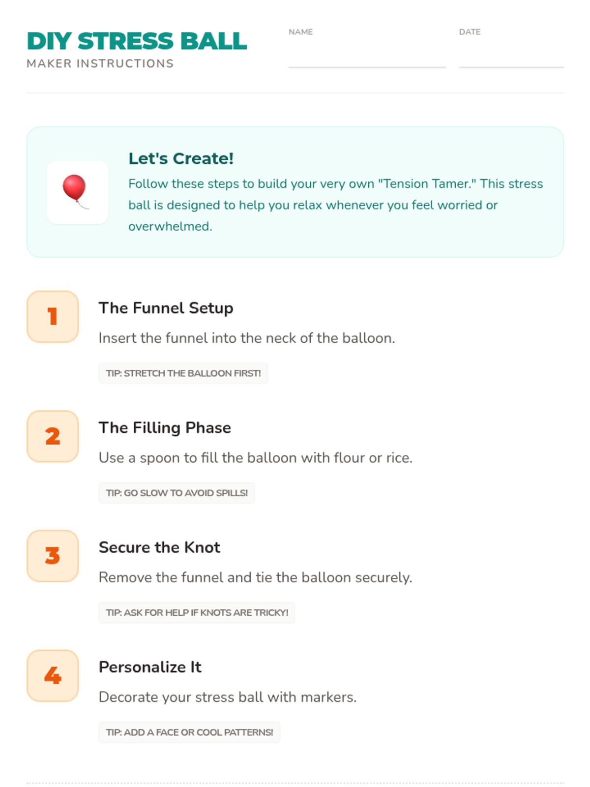 A 20-minute hands-on workshop where students create their own stress balls to learn about stress management and coping mechanisms.