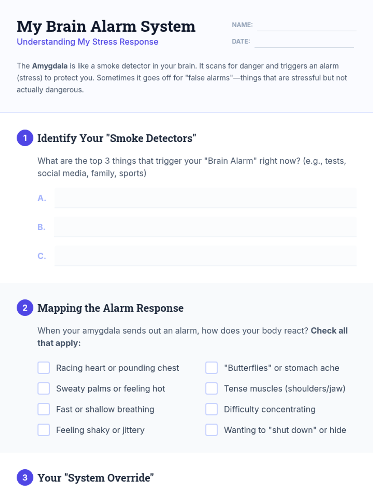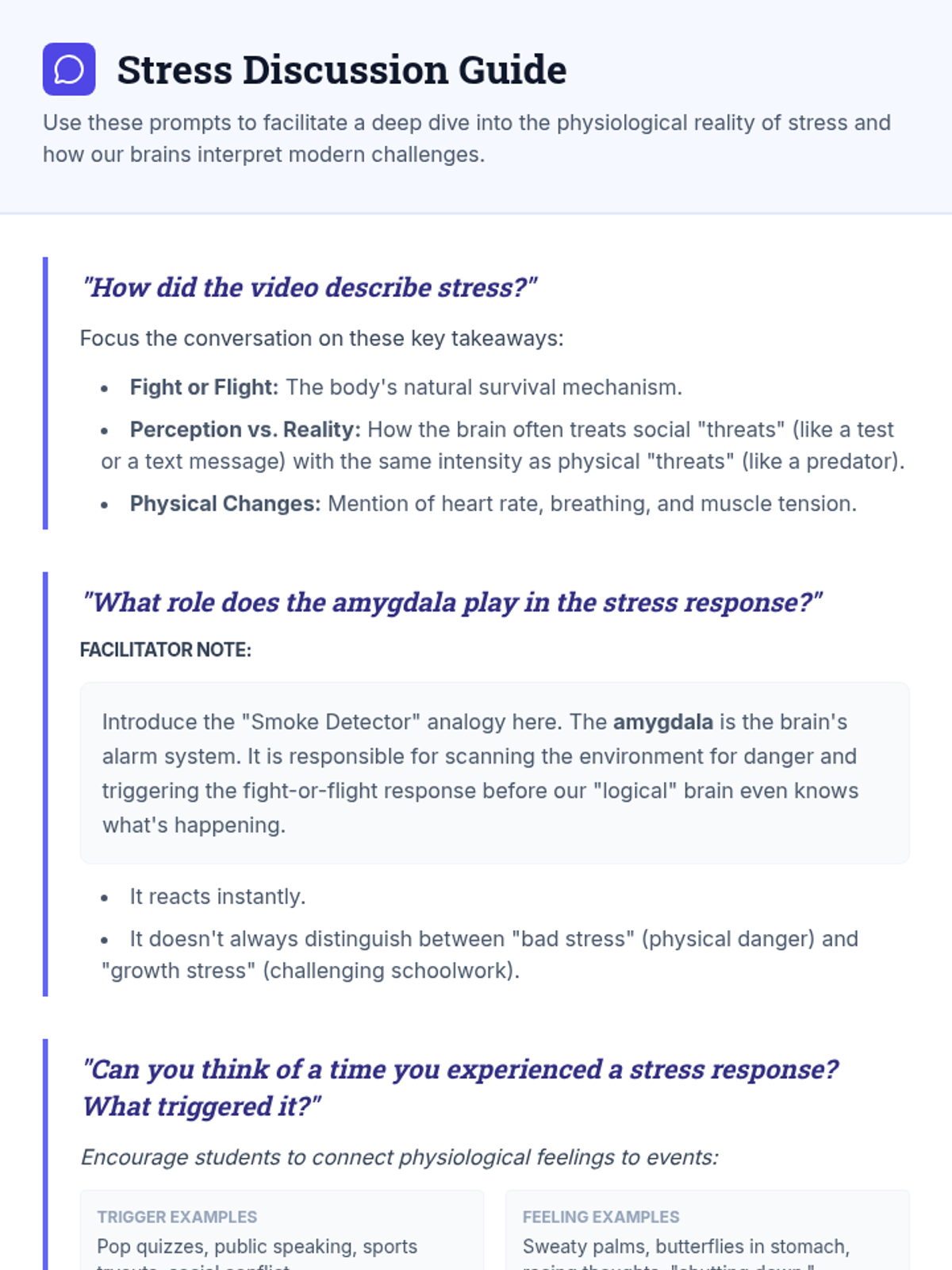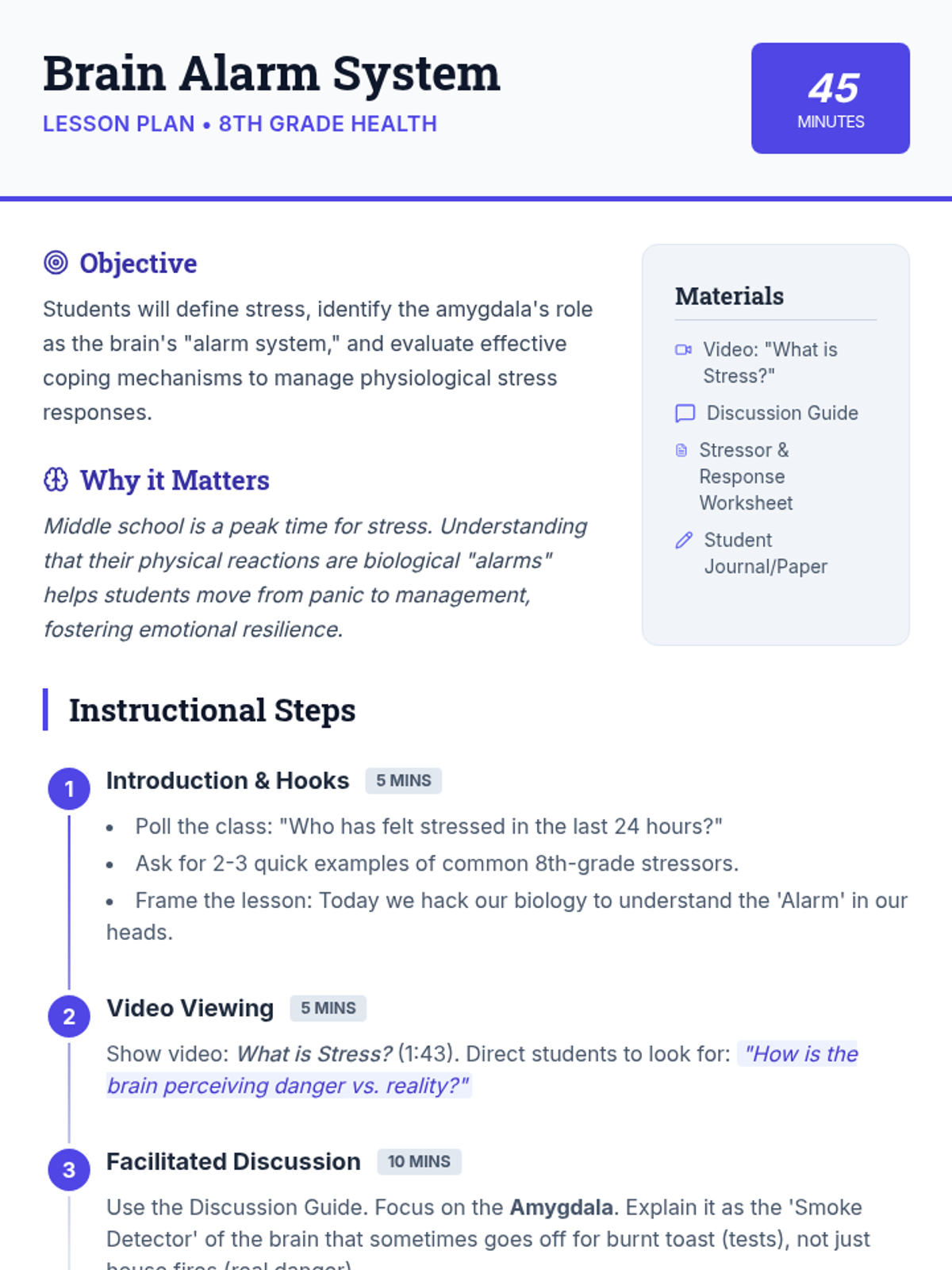 A lesson exploring the physiological response to stress, focusing on the amygdala's role as the brain's alarm system and identifying effective coping strategies for 8th-grade students.