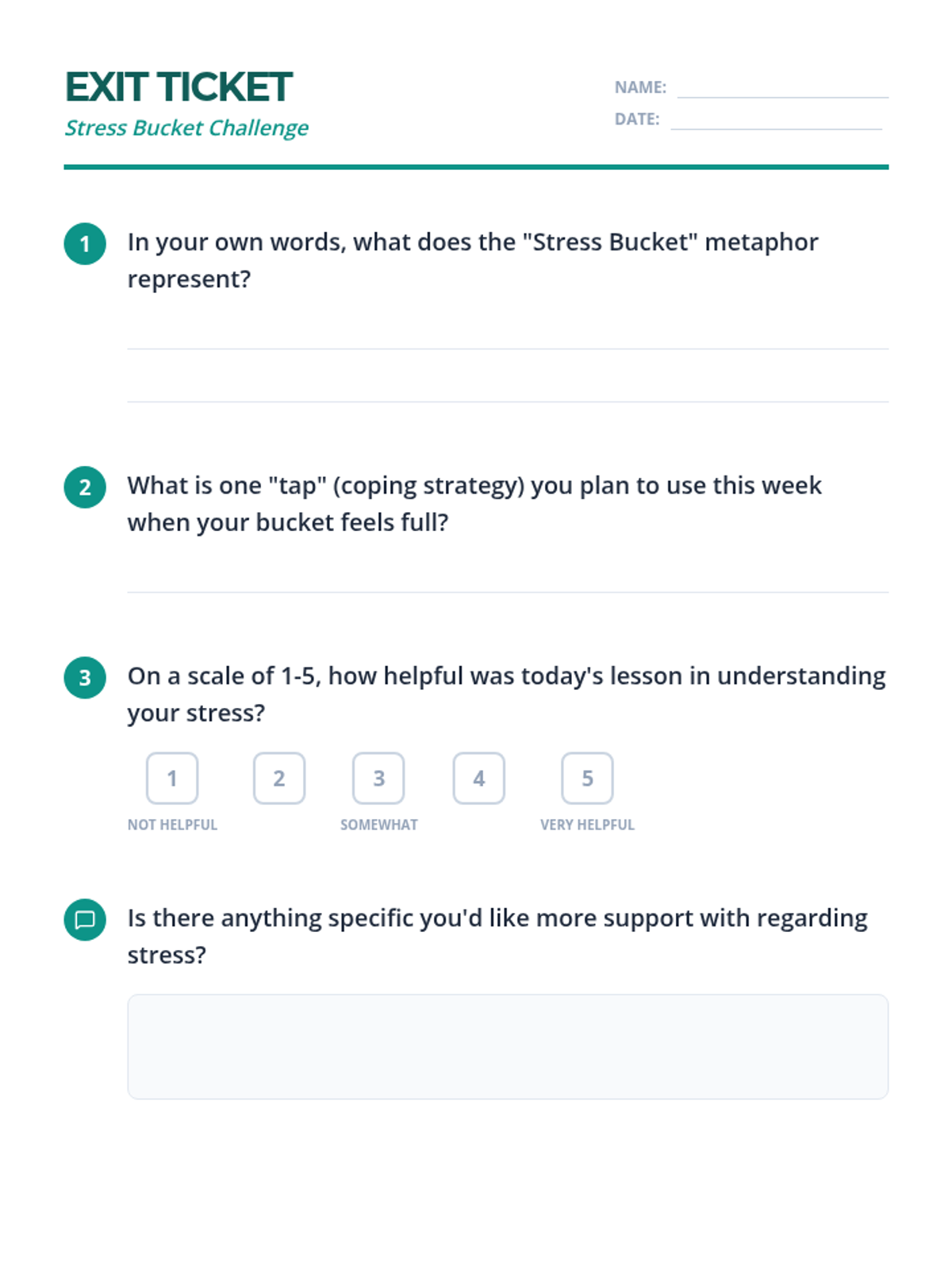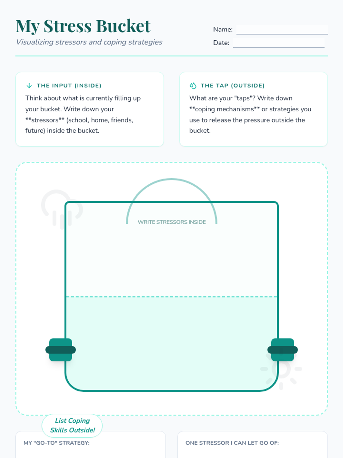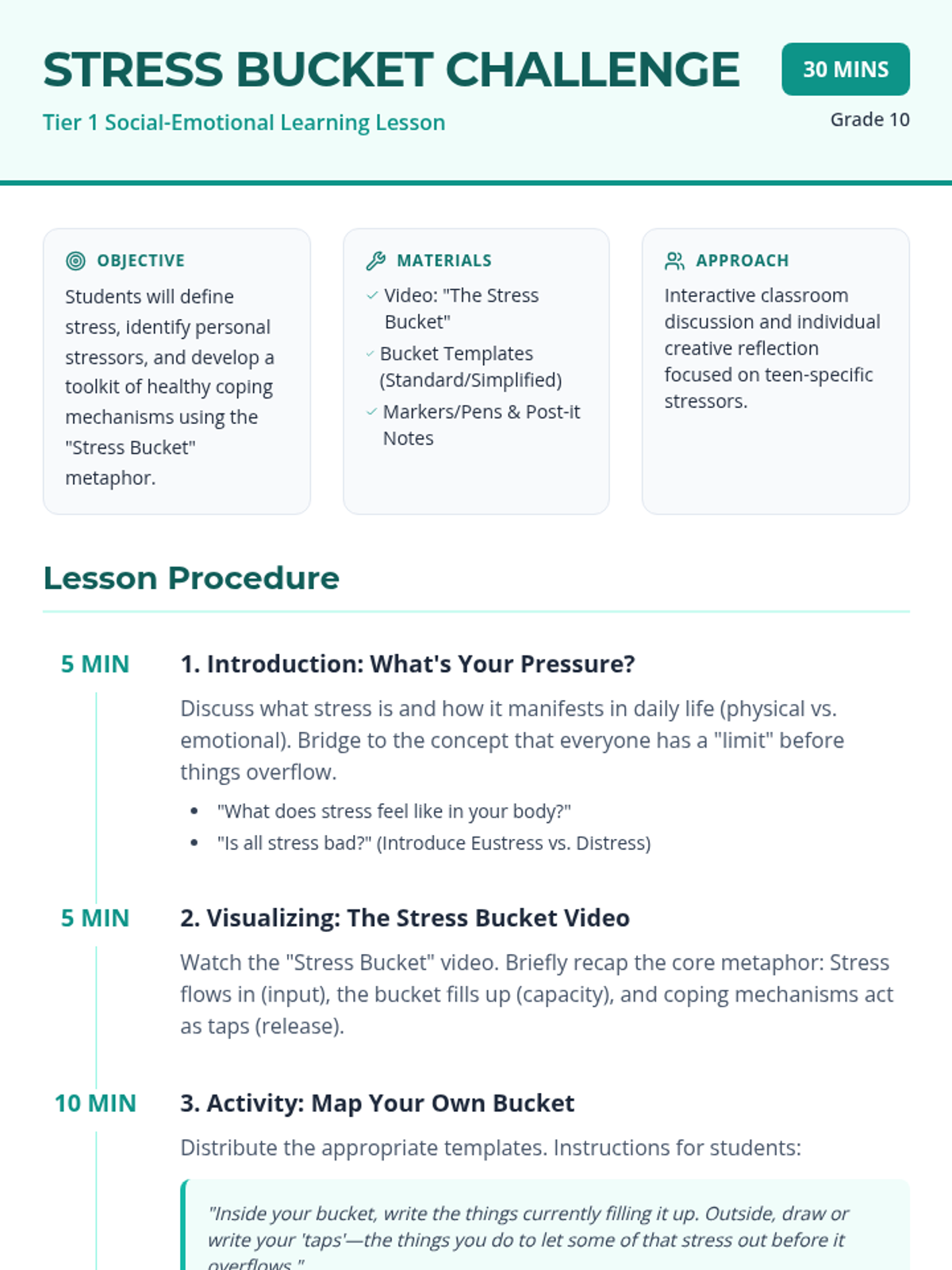 A 30-minute lesson for 10th-grade students introducing stress management through the 'stress bucket' metaphor. Students identify personal stressors and develop a toolkit of healthy coping mechanisms.