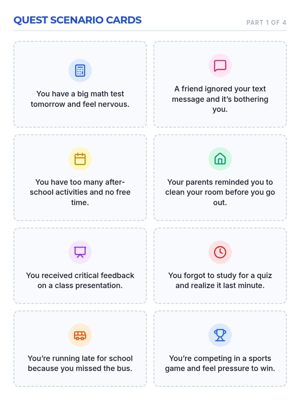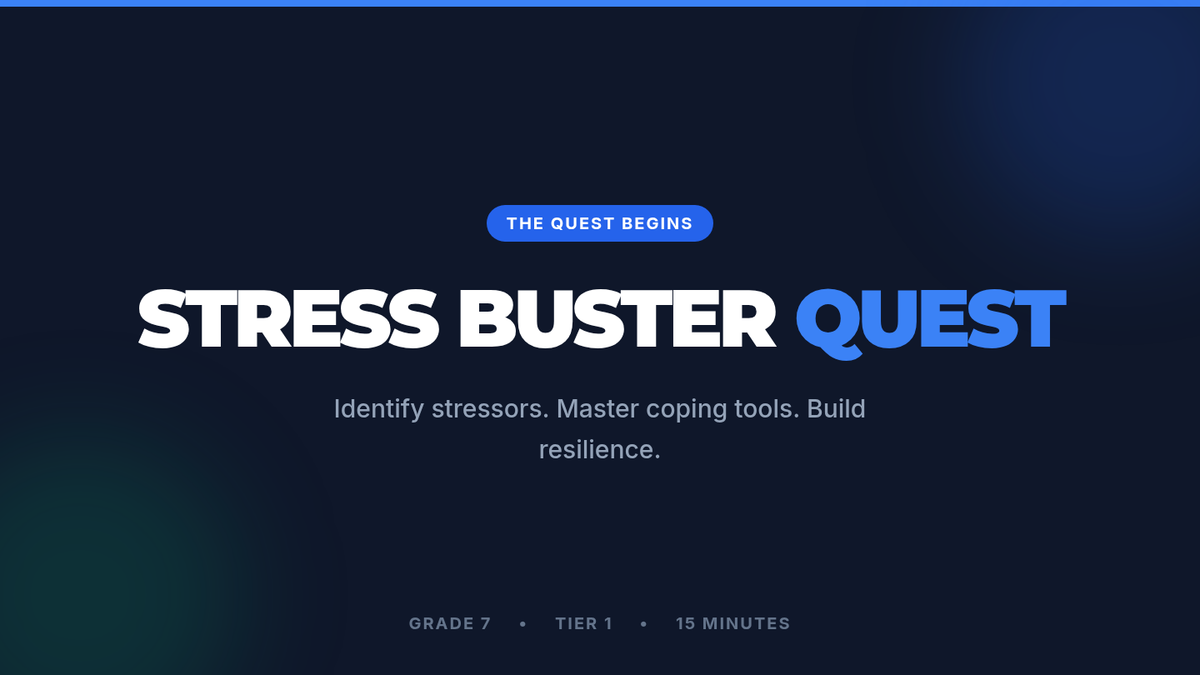 A fast-paced 15-minute Tier 1 lesson for 7th graders using a movement-based game to identify stressors and practice quick coping strategies. Students draw scenario cards, spin for strategies, and move along a quest path to build resilience.